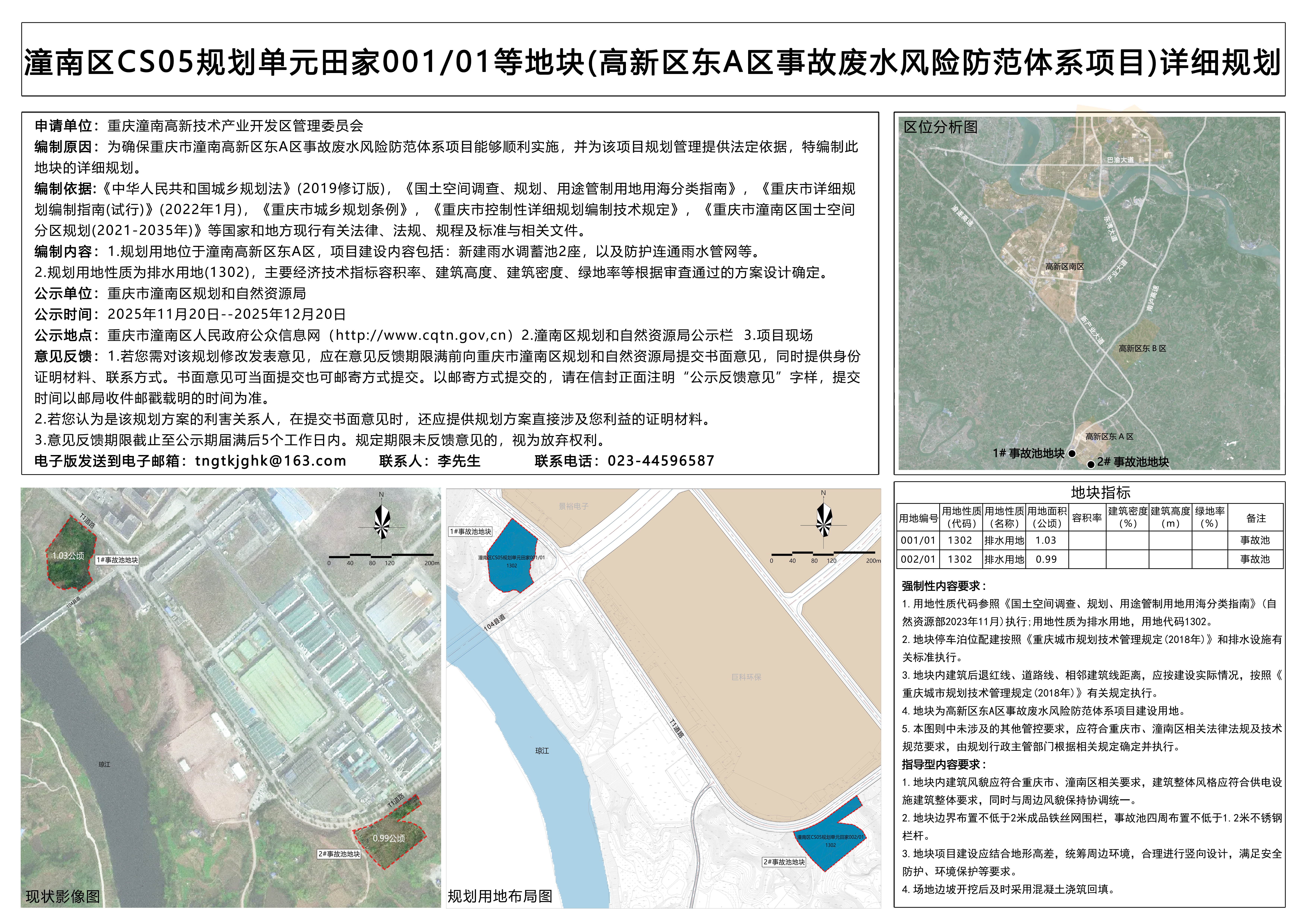 重庆潼南高新技术产业开发区管理委员会关于潼南区CS05规划单元田家001/01等地块(高新区东A区事故废水风险防范体系项目)详细规划