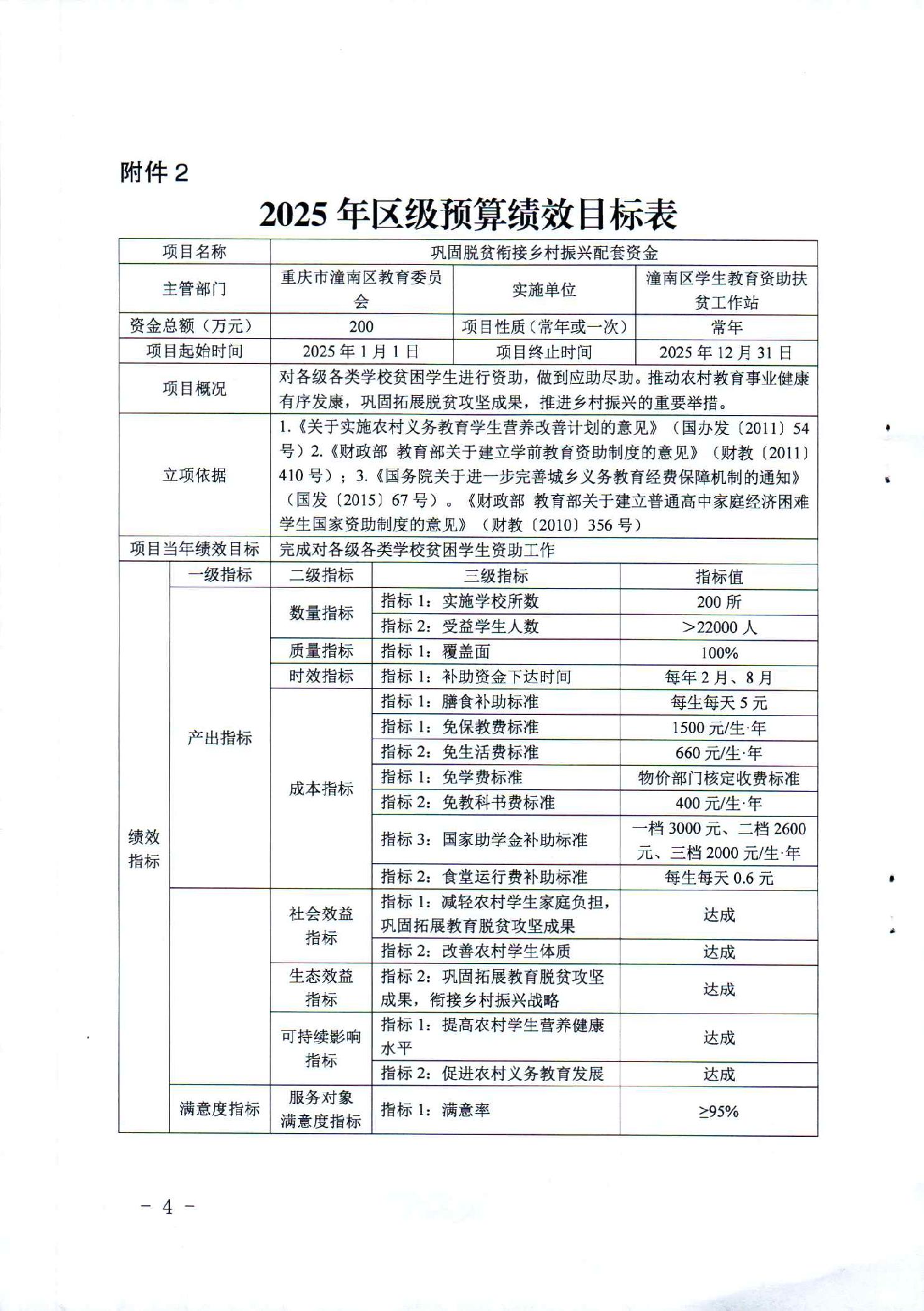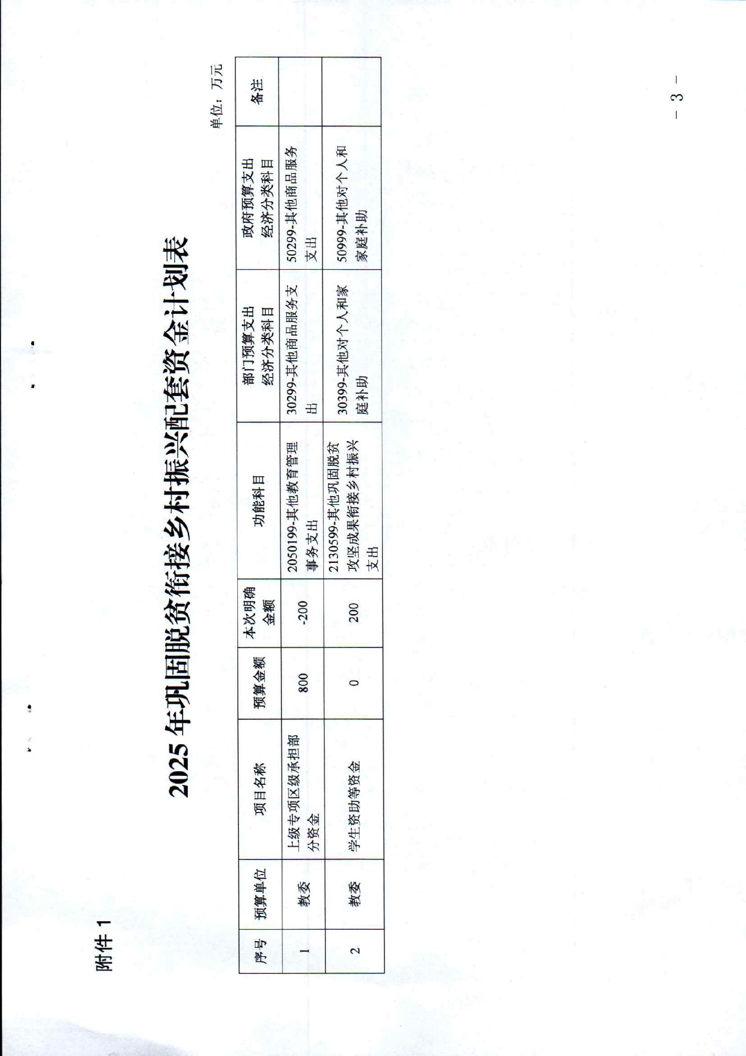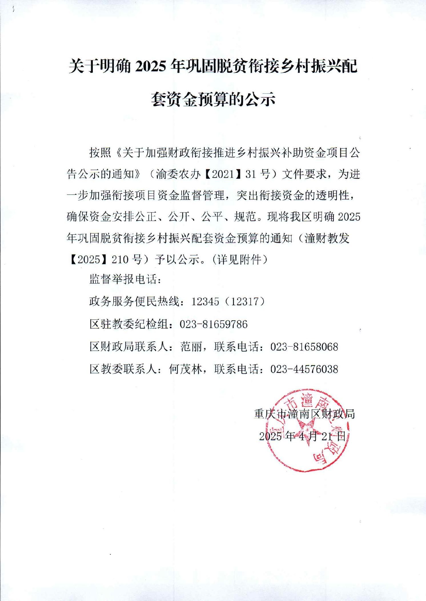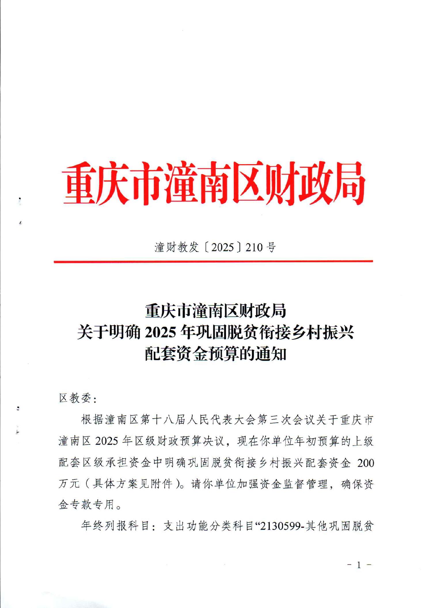 重庆市潼南区财政局关于明确2025年巩固脱贫衔接乡村振兴配套资金预算的通知(潼财教发〔2025〕210号)
