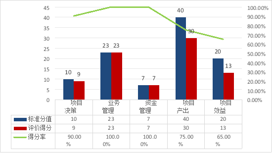 项目产出类指标由1个二级指标和3个三级指标构成,标准分值40分, 评价得分30分,得分率为75%。