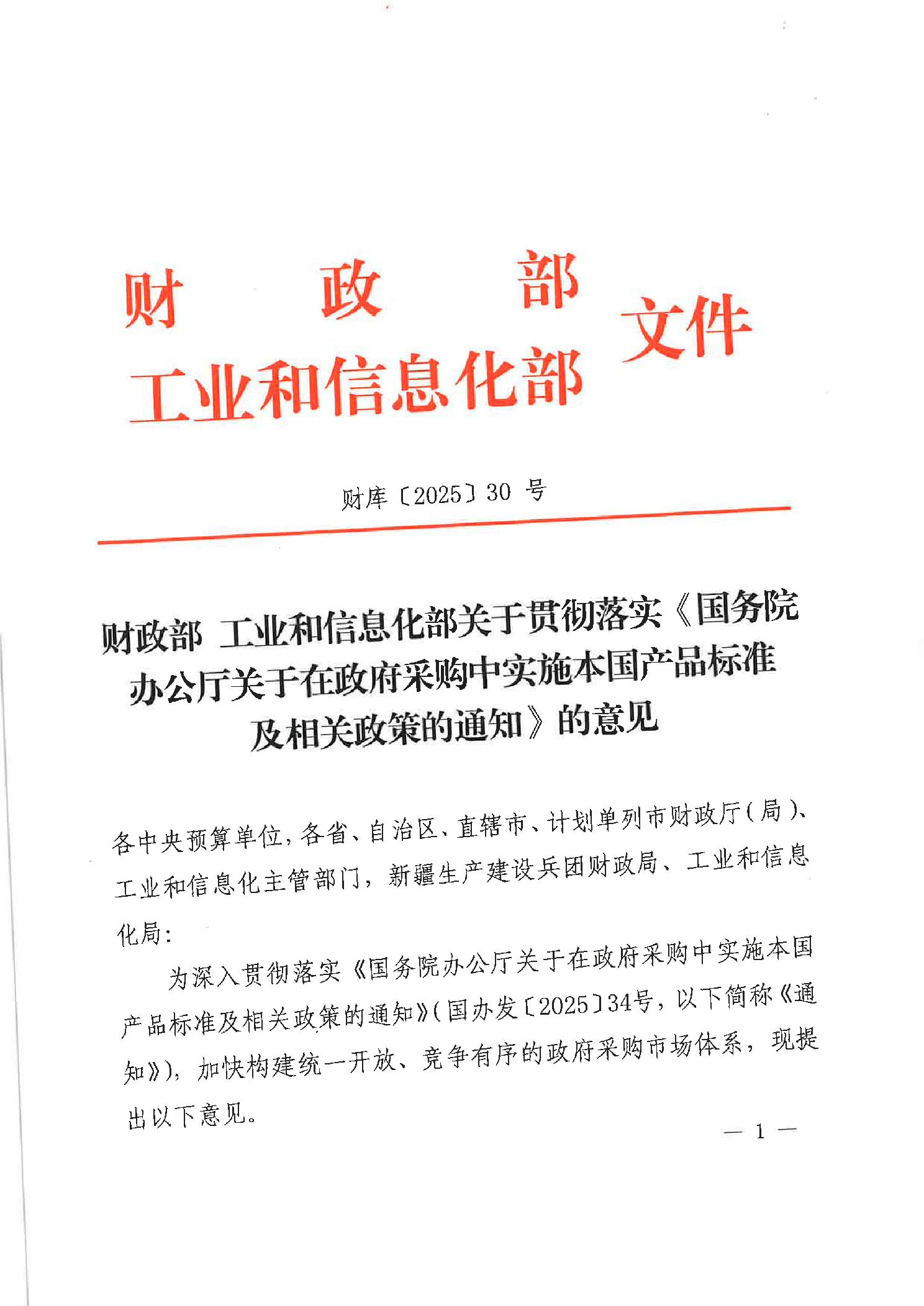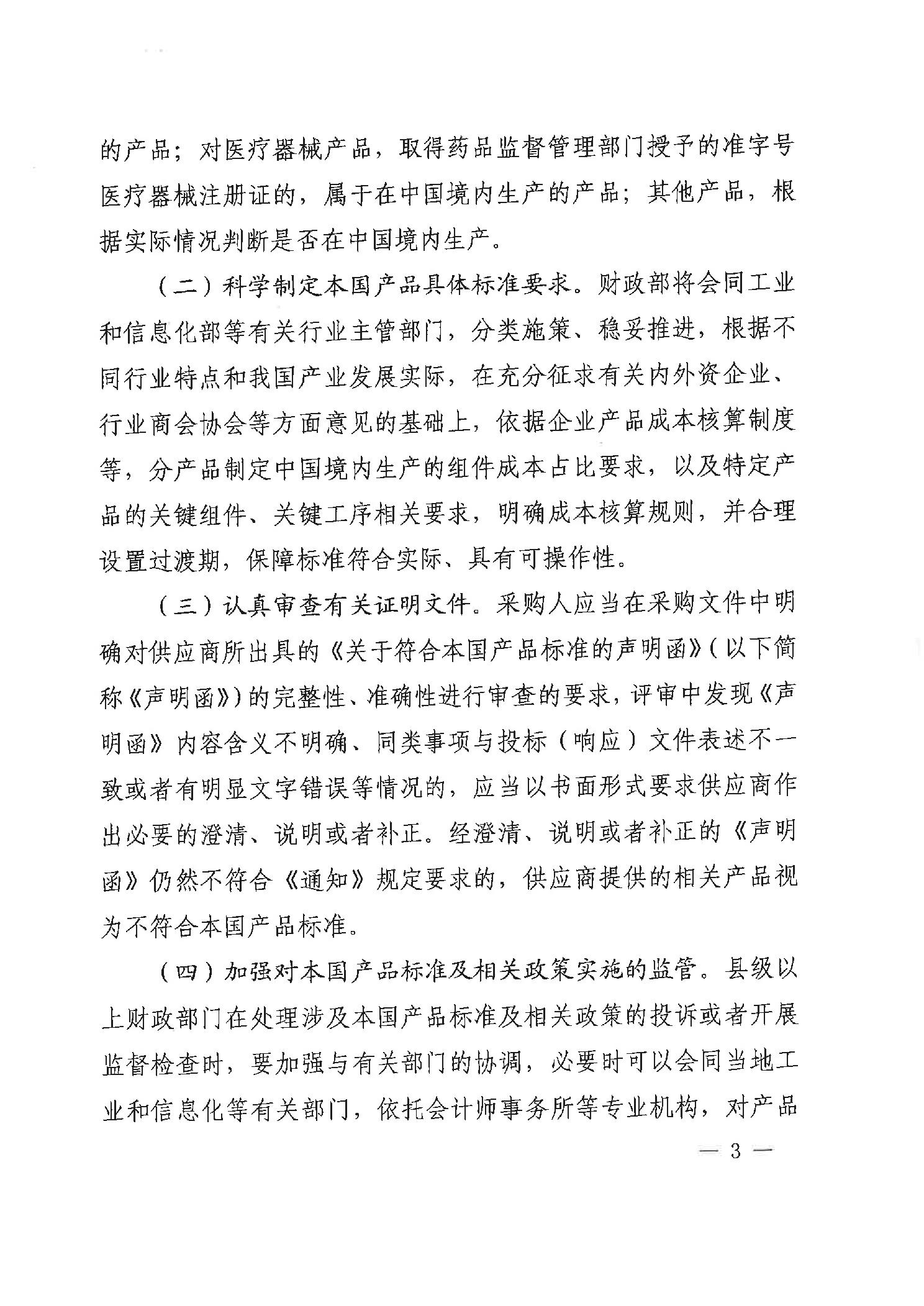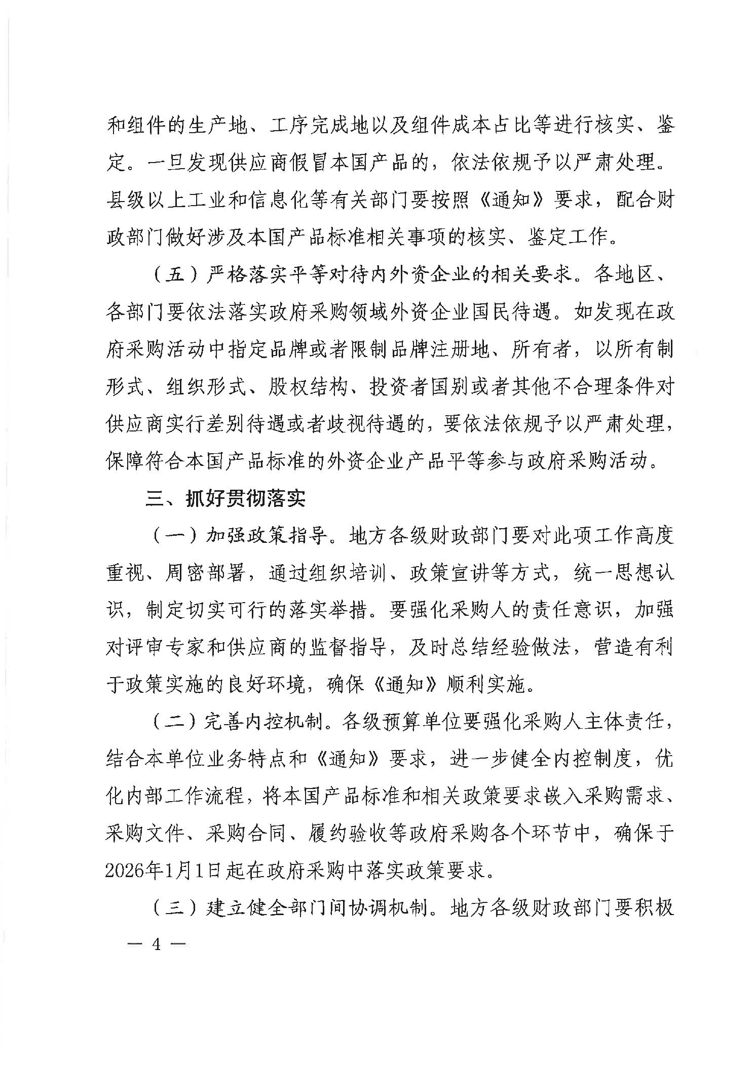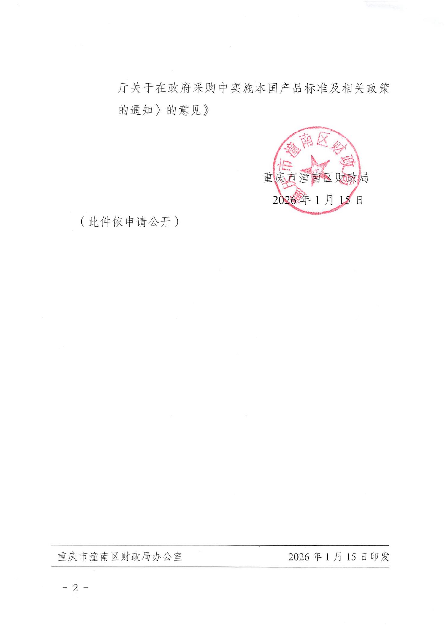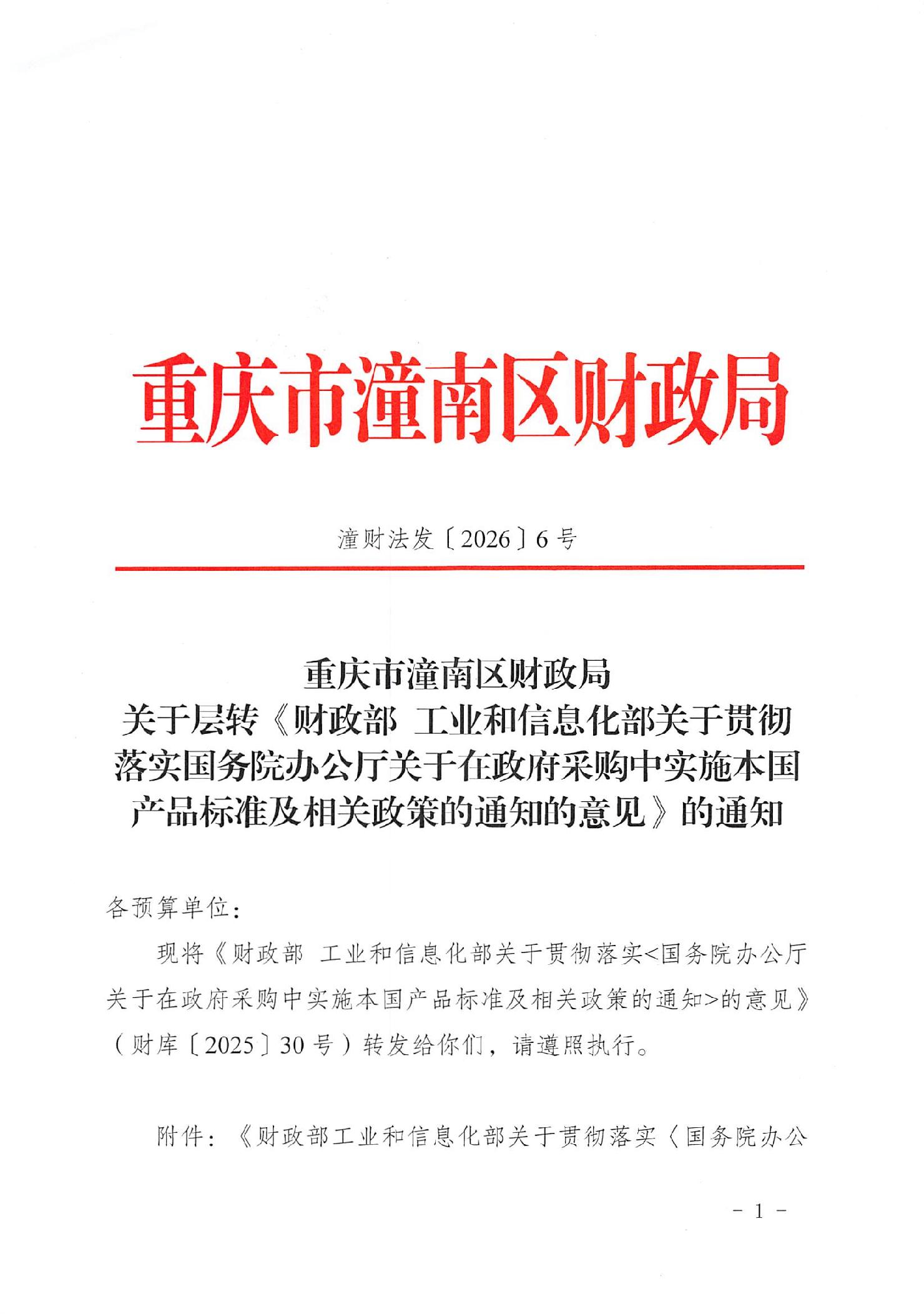 重庆市潼南区财政局关于层转《财政部工业和信息化部关于贯彻落实国务院办公厅关于在政府采购中实施本国产品标准及相关政策的通知的意见》的通知(潼财法发〔2026〕6号)