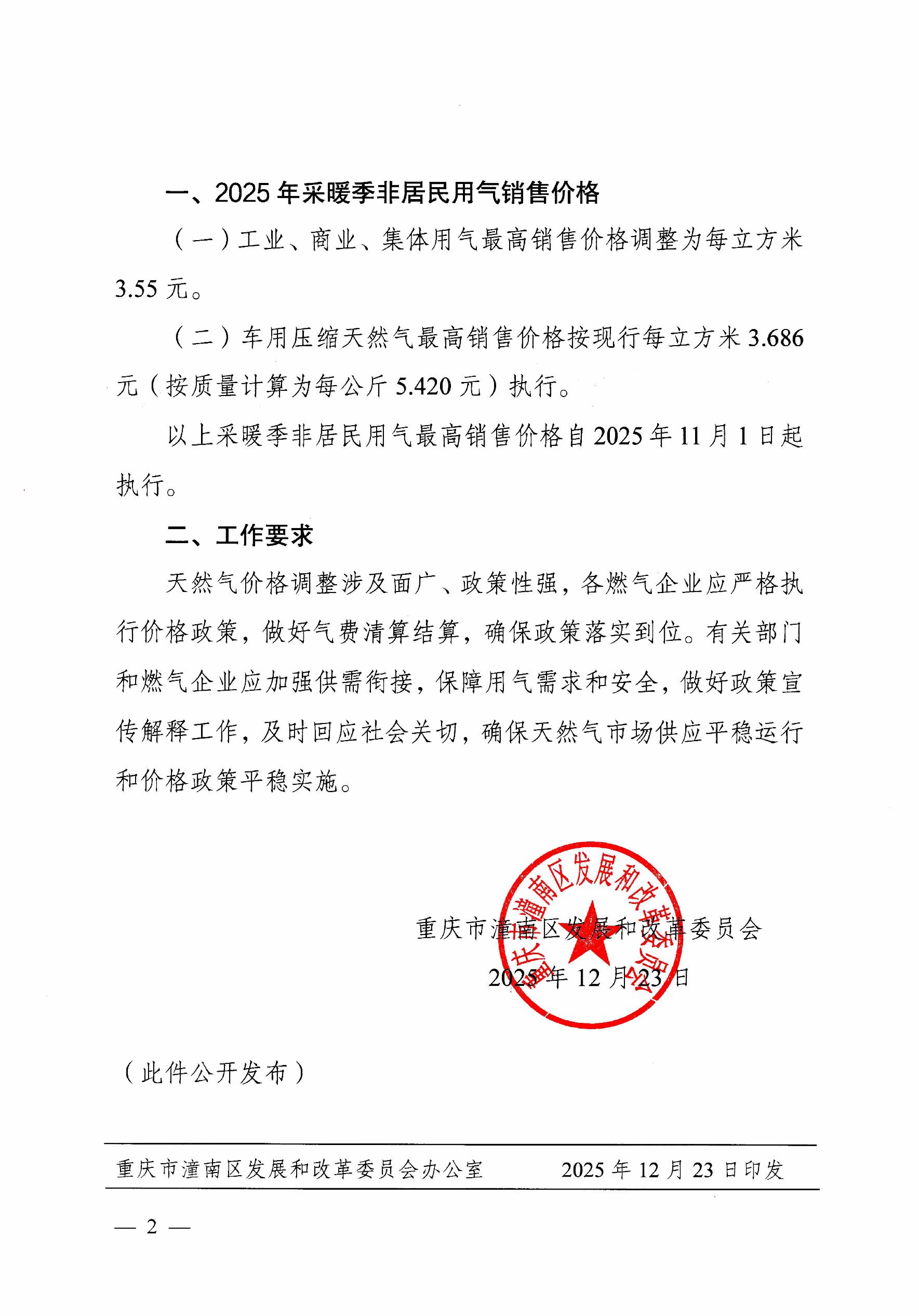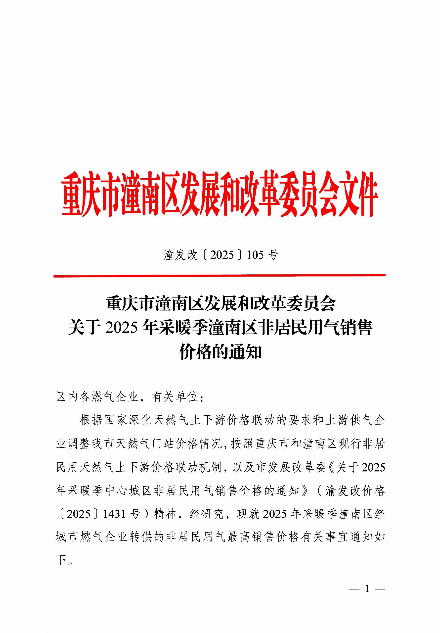 关于2025年采暖季潼南区非居民用气销售价格的通知