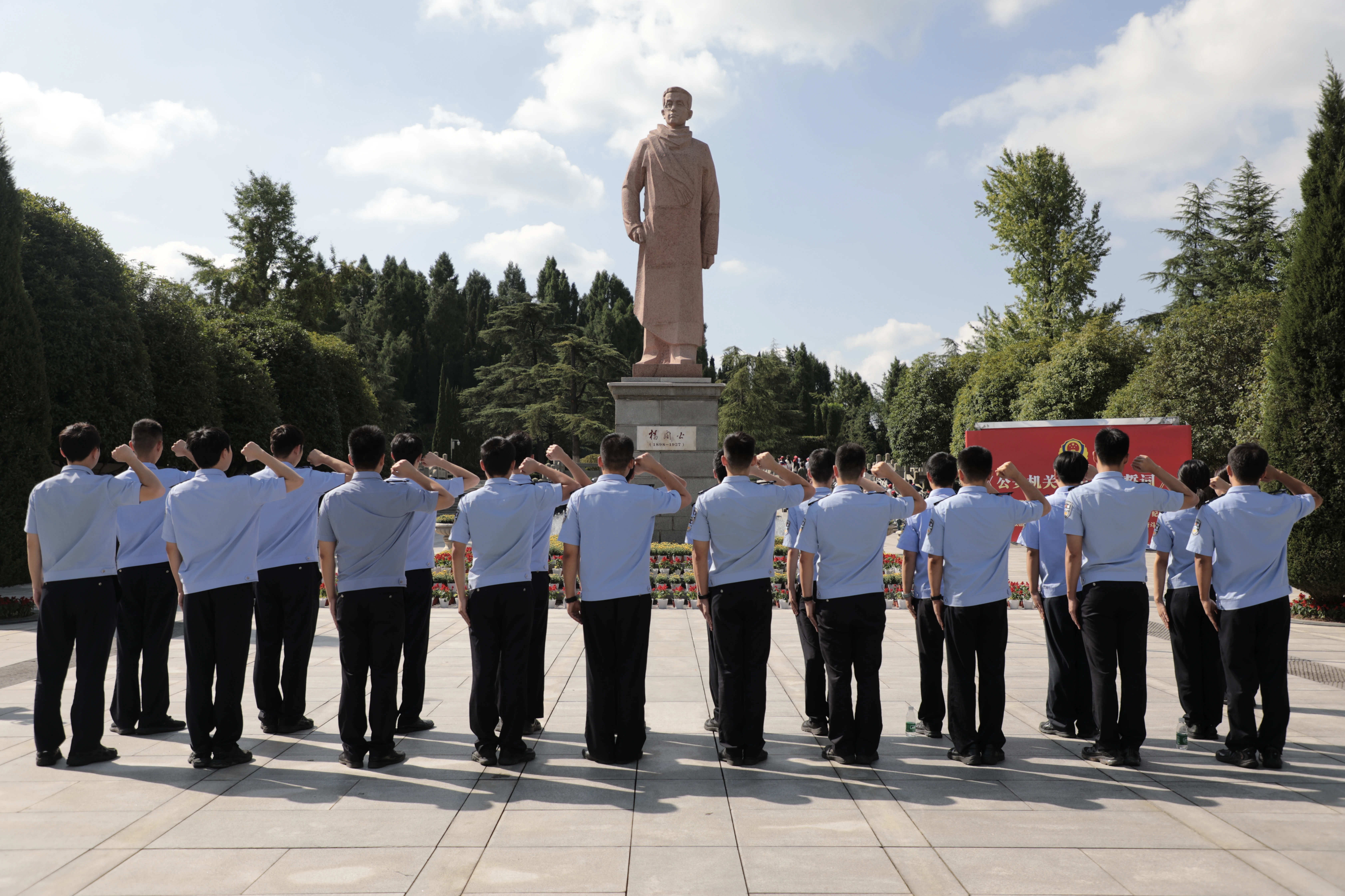 随后,21名新警前往闇公陵园,缅怀革命先烈,接受精神洗礼。在庄严肃穆的氛围中,全体新警面向警旗,举起右拳,庄严宣誓。