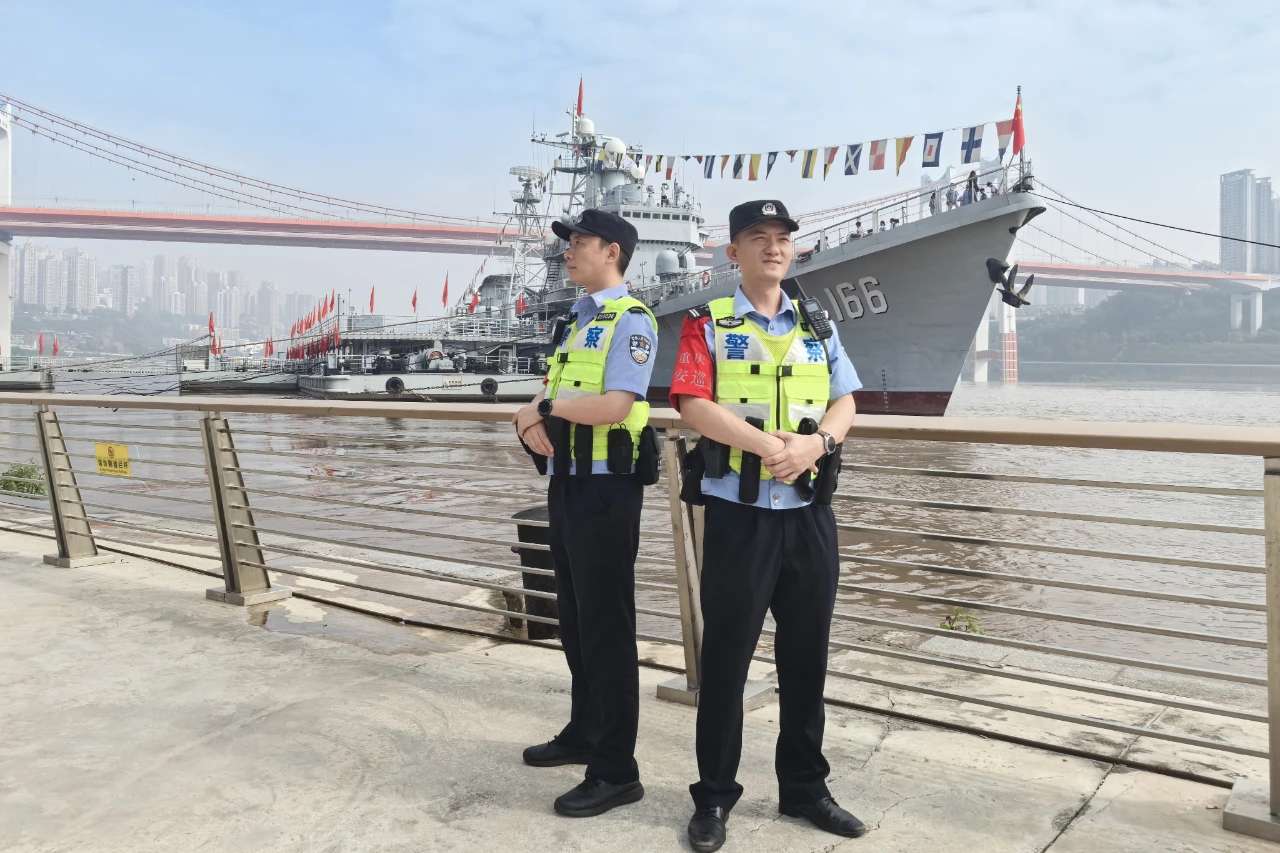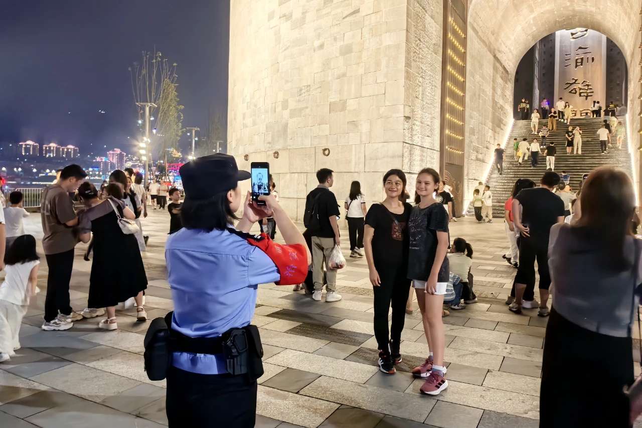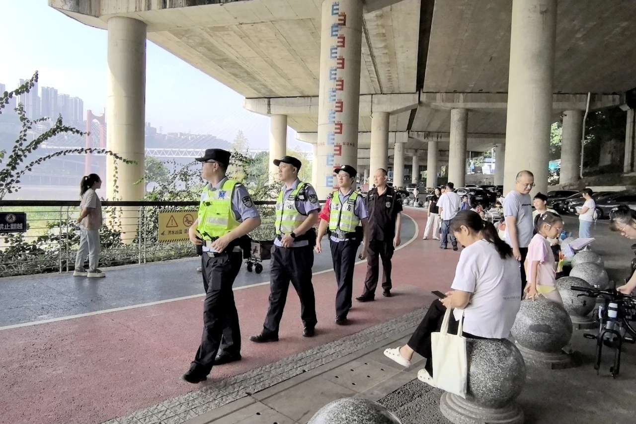 在九龙坡区建设码头海疆博物馆外的广场上,九龙派出所民警在此驻守;新近开放的朝天门码头更是热闹非凡。“这几天客流量明显增加,我们在水域重点景区都增设了执勤点,既要保障游客安全观景,又要防范汛期安全隐患。”执勤民警也化身临时摄影师,帮助往来游客拍照留念。