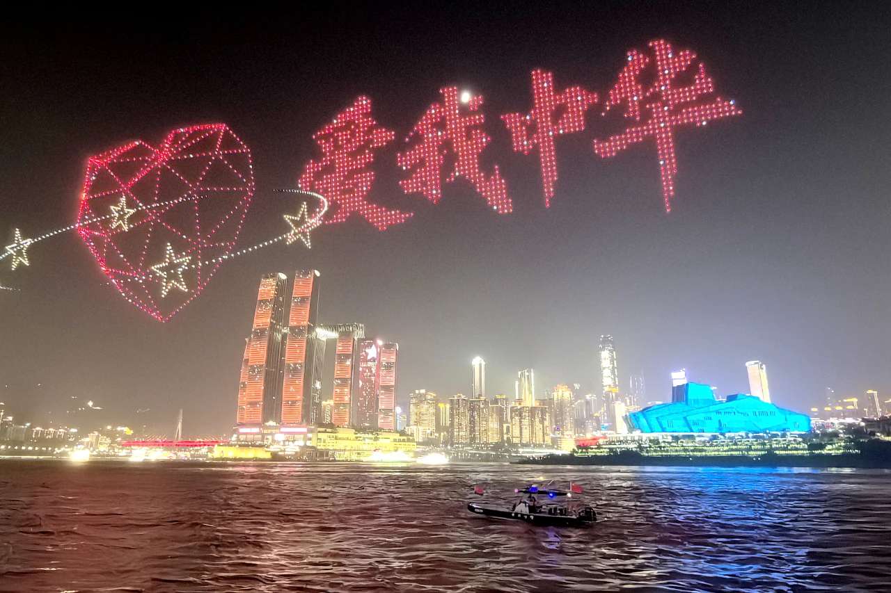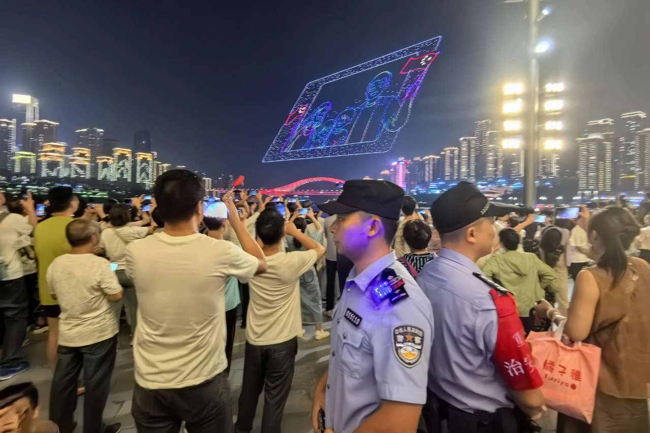 夜幕降临,“新韵重庆”无人机灯光秀在两江交汇处上演。数千架无人机变幻出“我爱中华”“重庆好美”等图案,与江面倒影交相辉映,引来阵阵欢呼。“国庆期间的联场展演,我们根据水位涨落变化提前划定了安全警戒区域,在表演区域外围的水域和岸线均部署警力值守。”现场执勤民警表示,既要保障群众的最佳观赏效果,更要确保万无一失。