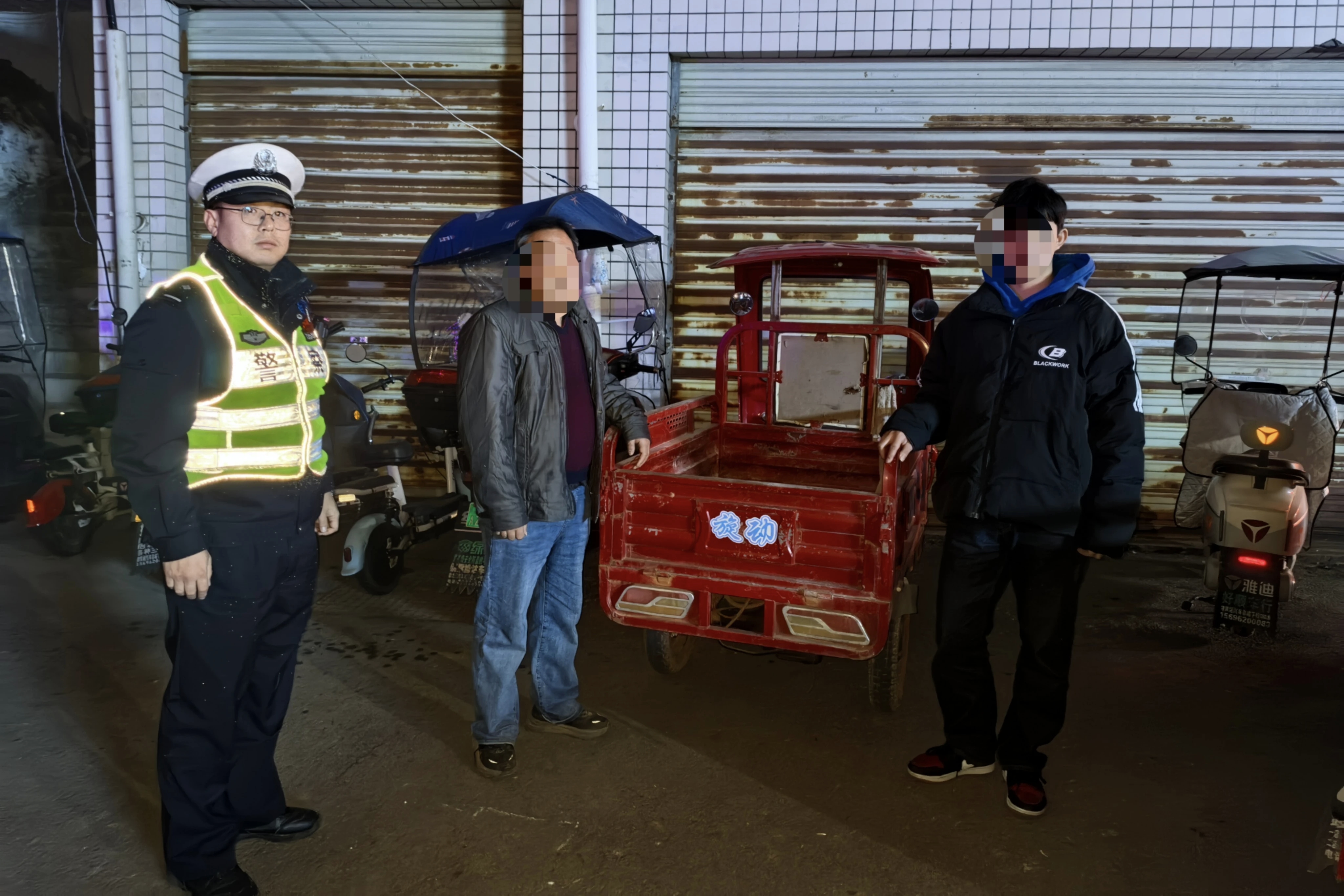 民警历时两个小时反复比对、追踪,最终锁定涉事车辆。赶到现场时,三轮车和两轮电动车停在某小区路边,驾驶人已不见踪影。线索一度中断,但办案民警并未放弃,通过走访摸排,最终成功锁定涉事父子二人。