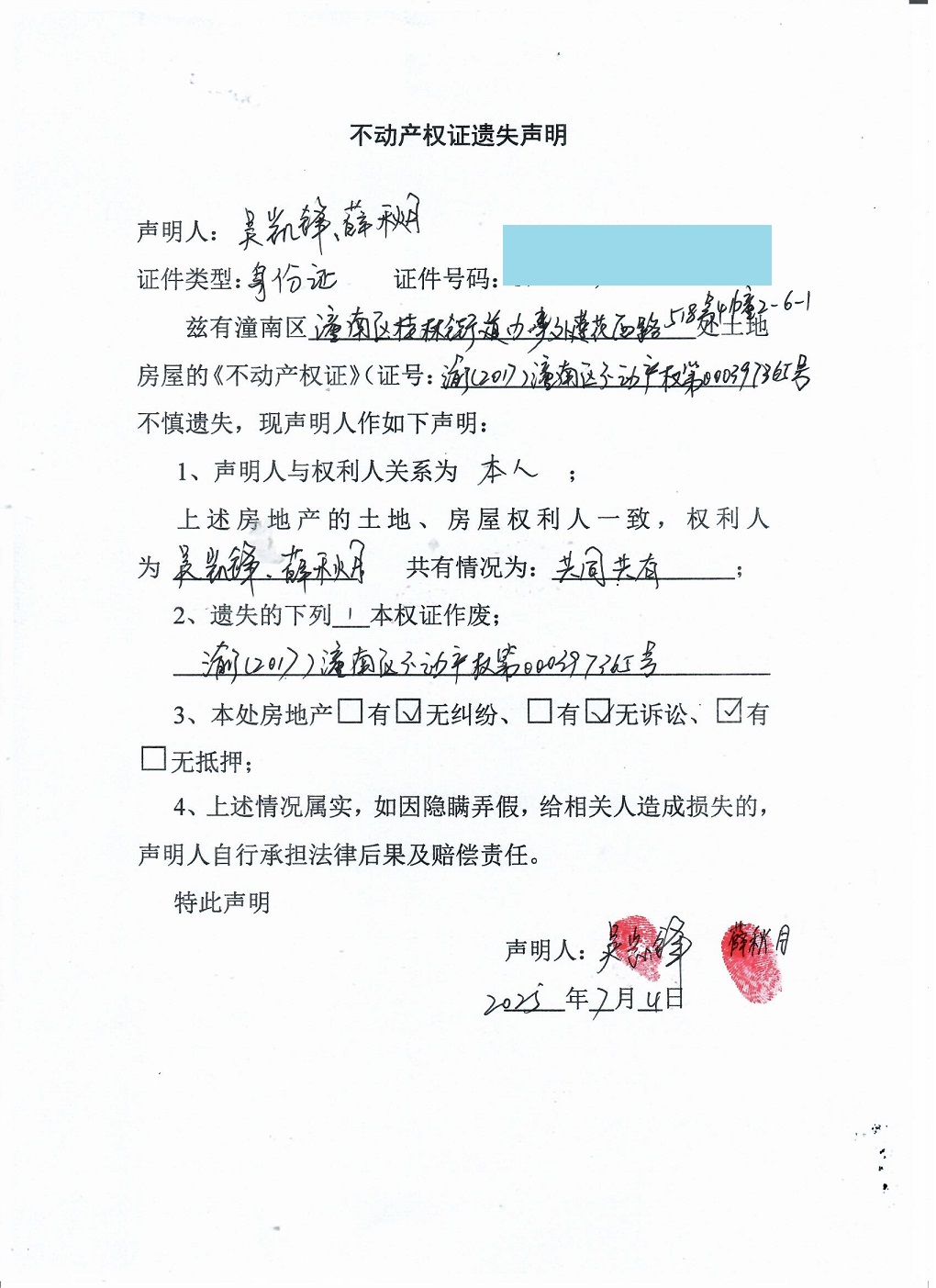 吴凯锋,薛秋月不动产权证遗失声明