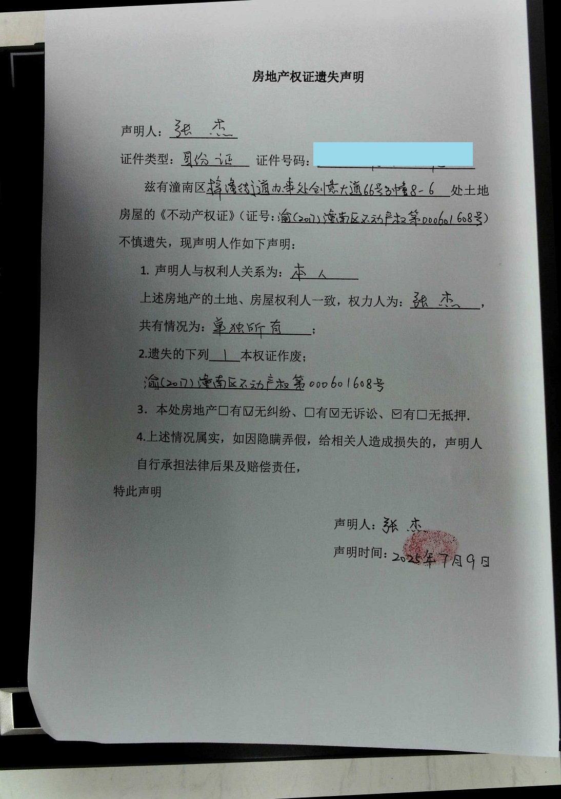 张杰不动产权证遗失声明
