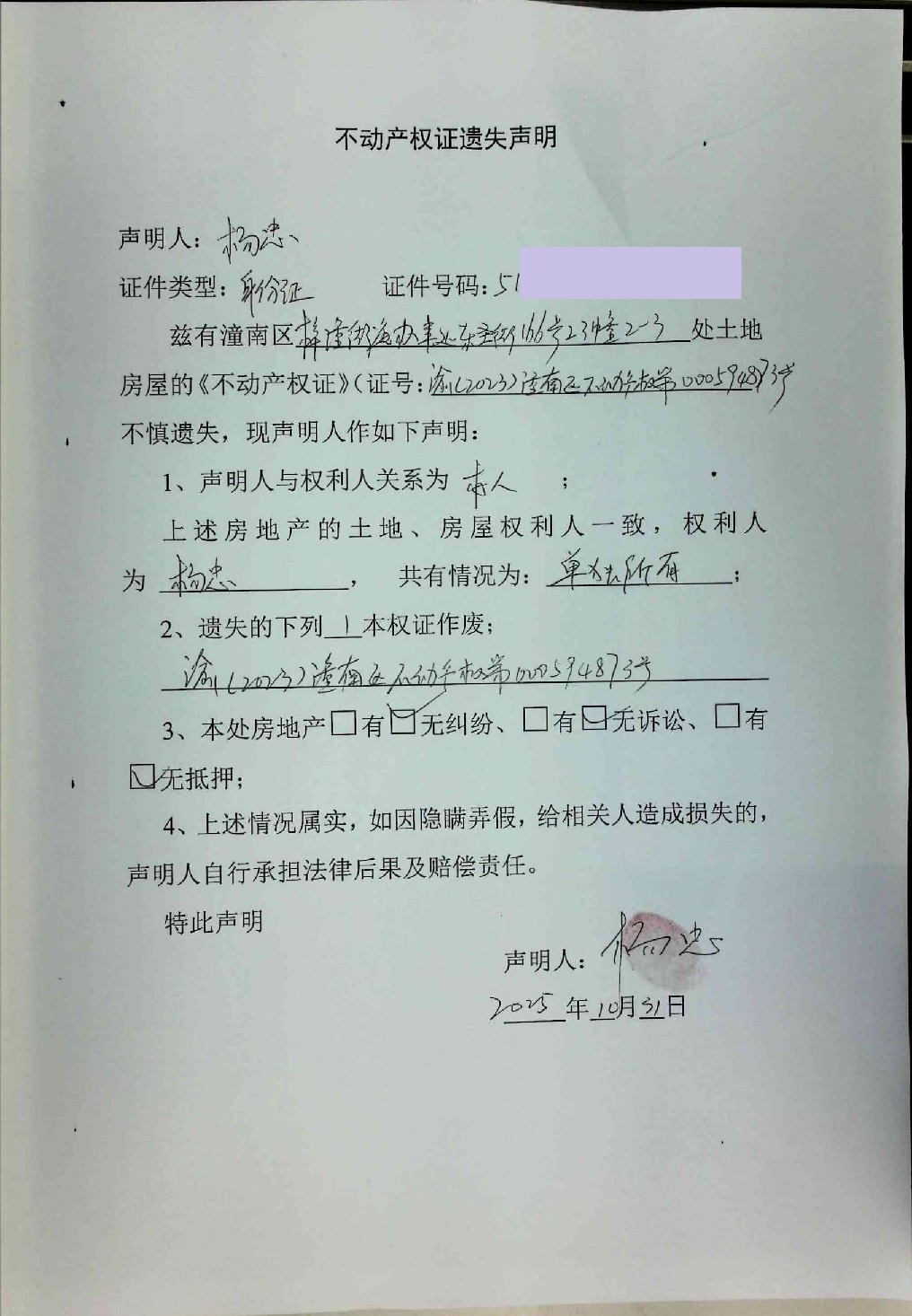 杨忠不动产权证遗失声明