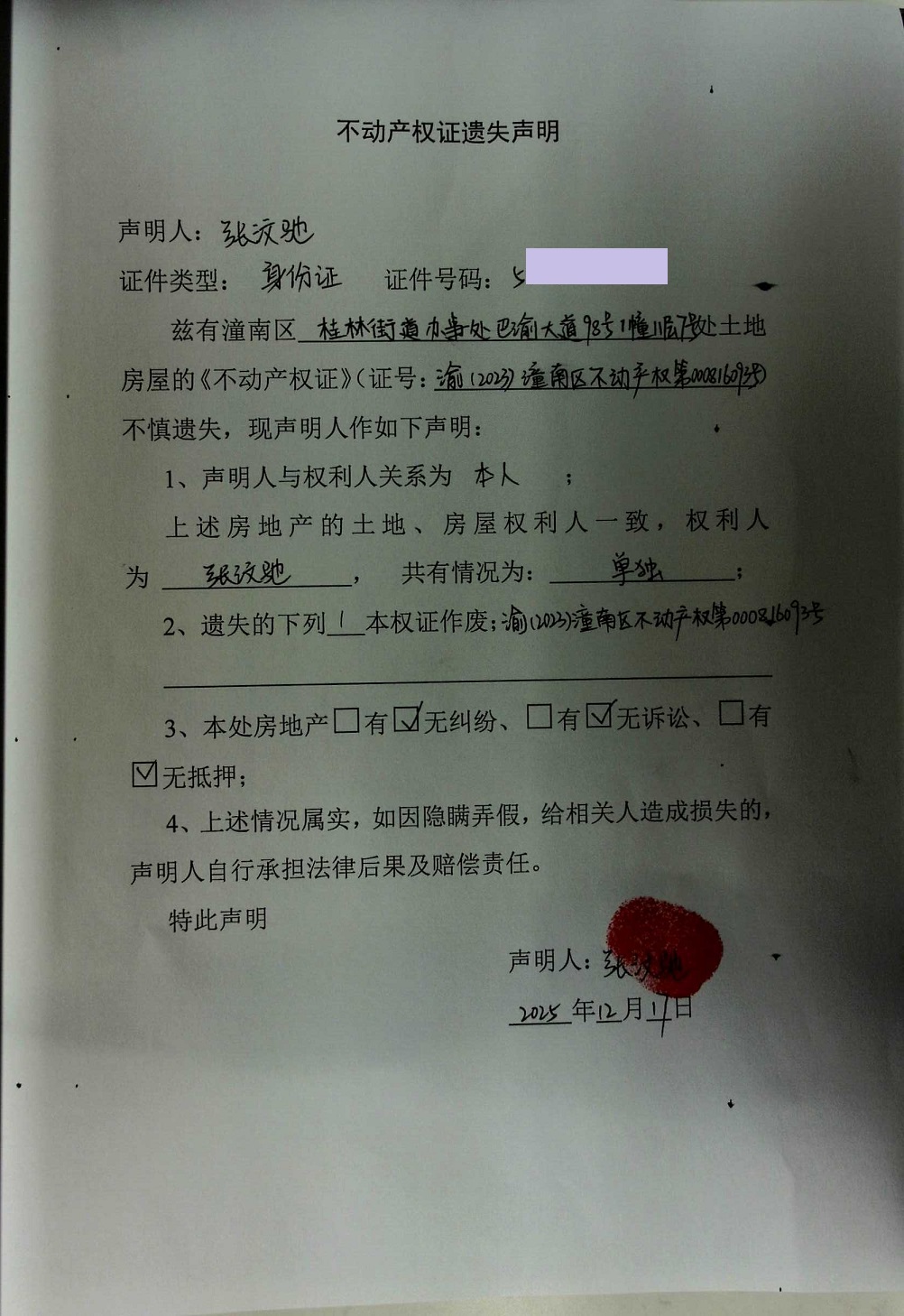 张汶驰不动产权证遗失声明