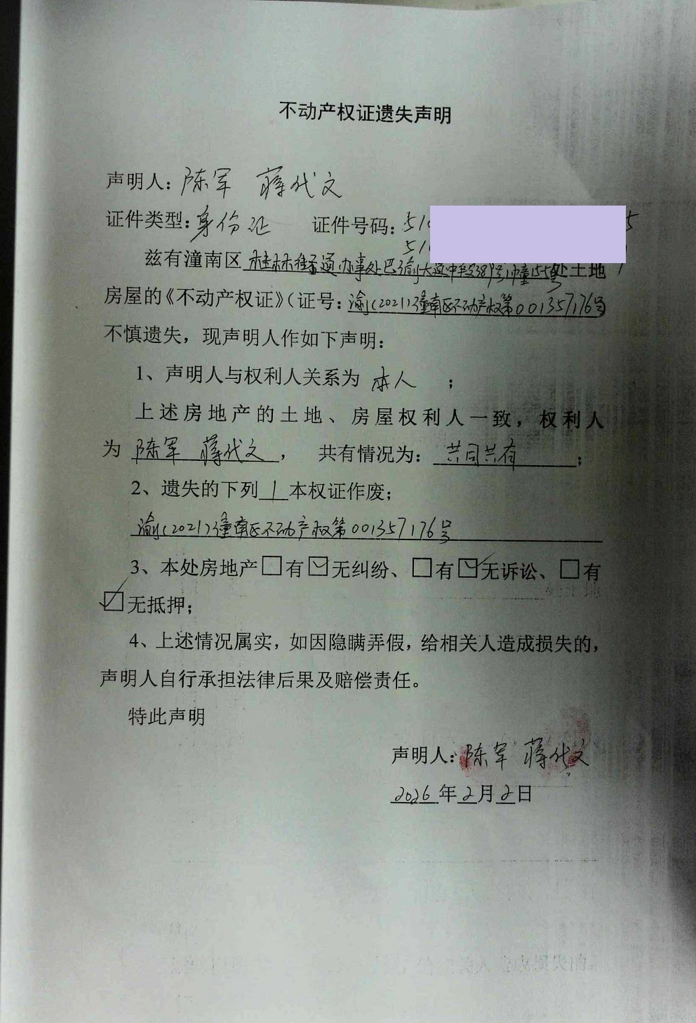 陈军,蒋代文不动产权证遗失声明