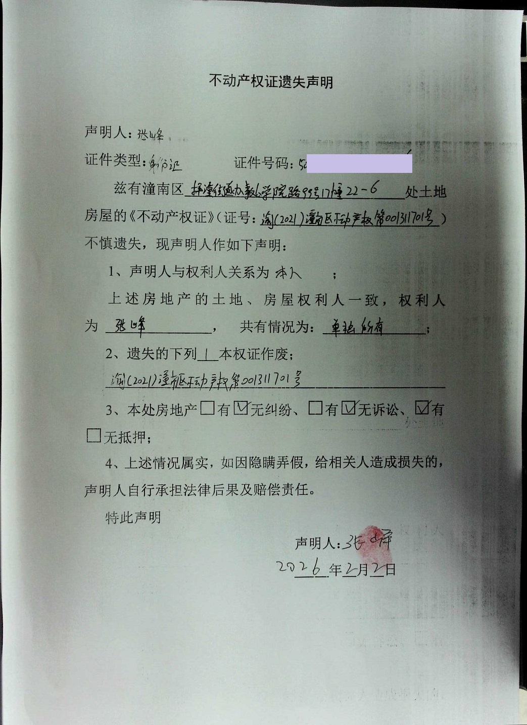 张峰不动产权证遗失声明