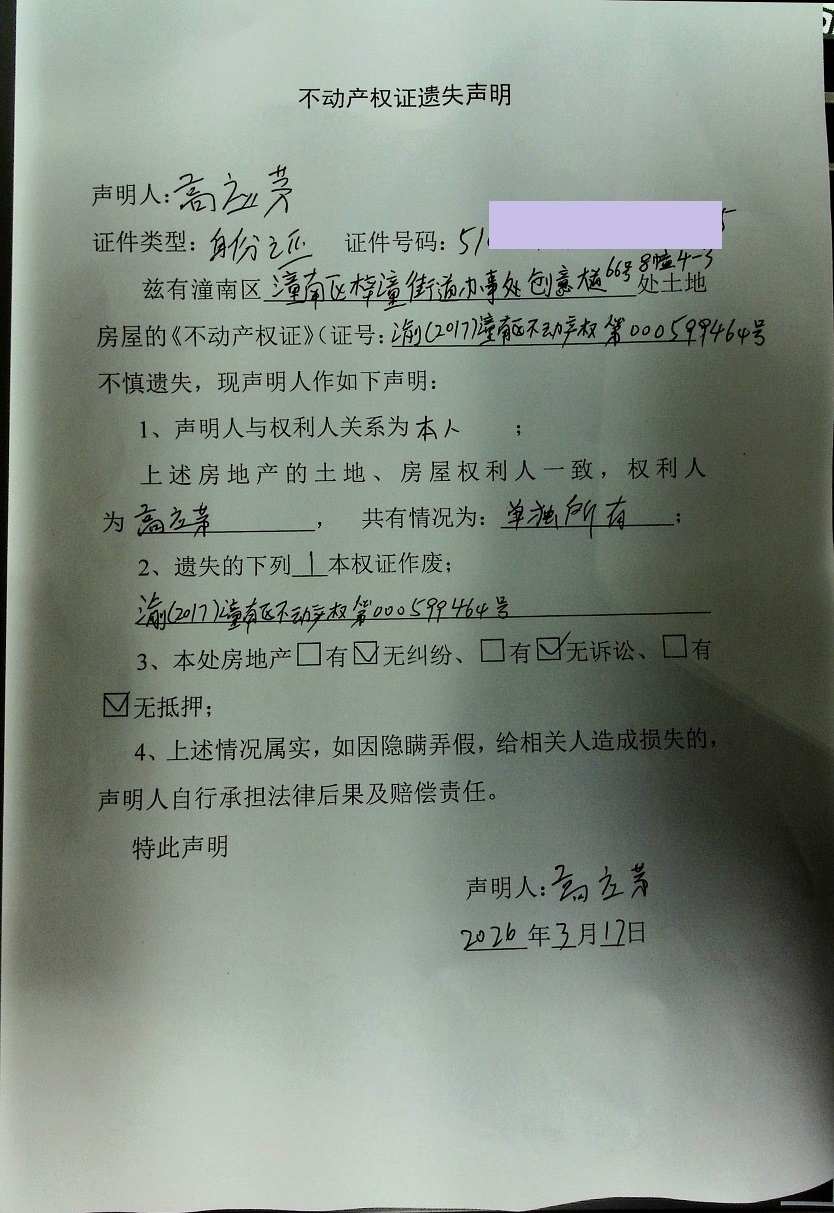 高应茅不动产权证遗失声明