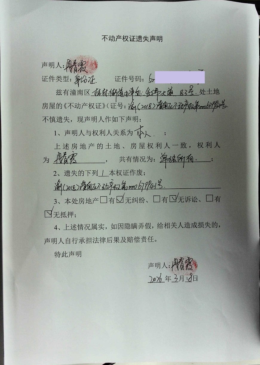 冉春霞不动产权证遗失声明