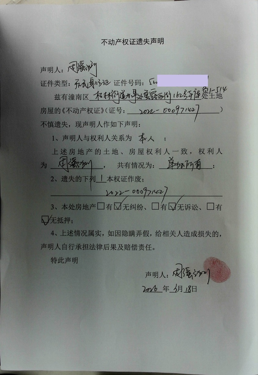 周瑶漪不动产权证遗失声明