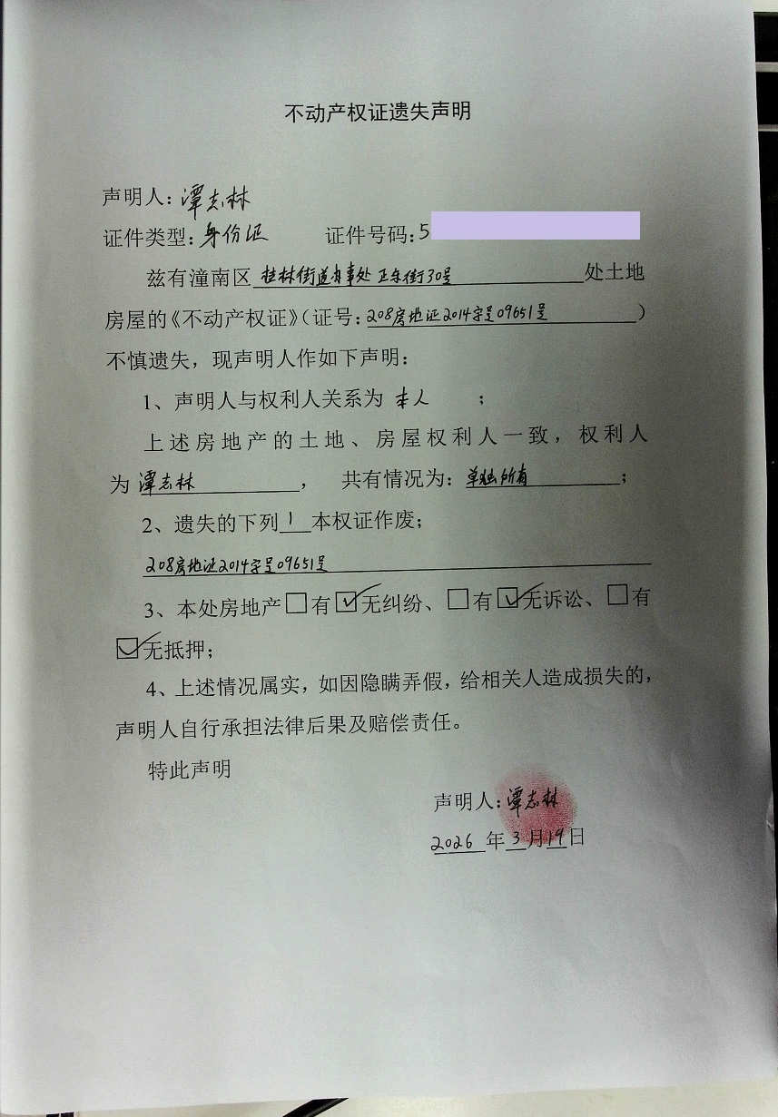 谭志林不动产权证遗失声明