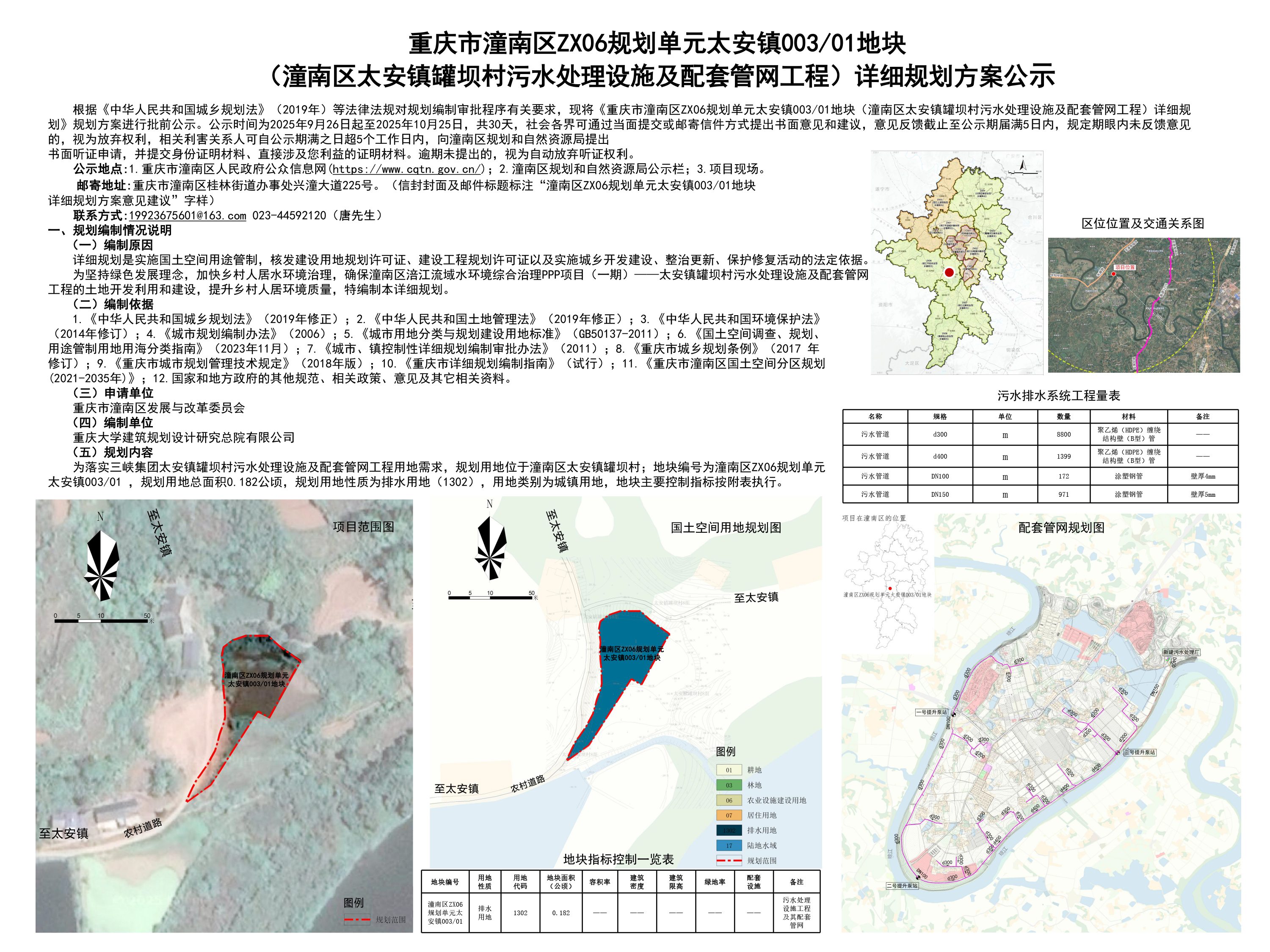 重庆市潼南区ZX06规划单元太安镇003/01地块(太安镇罐坝村污水处理设施及配套管网工程)详细规划方案公示