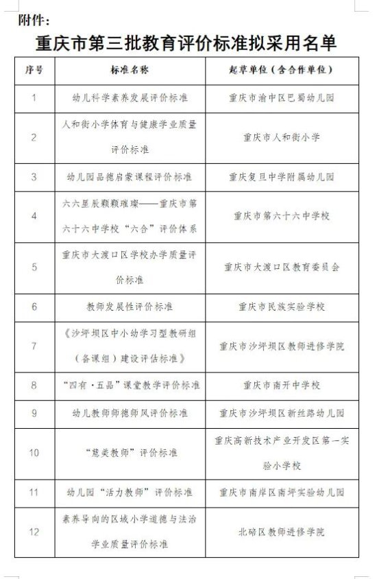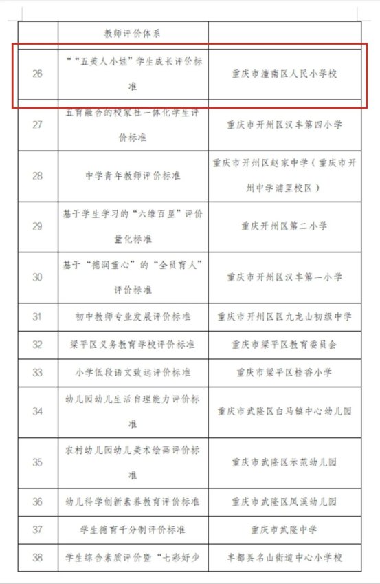 近日,重庆市教育评估院公示了第三批教育评价标准采用名单。我区人民小学校“‘五美人小娃’学生成长评价标准”成功入选,全市共有60项标准入选(含高校)。