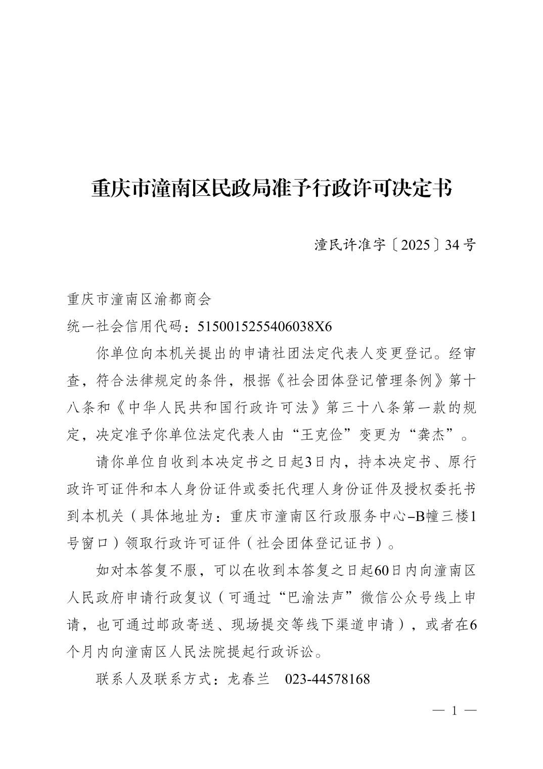 重庆市潼南区民政局准予行政许可决定书〔2025〕34号 重庆市潼南区渝都商会变更登记