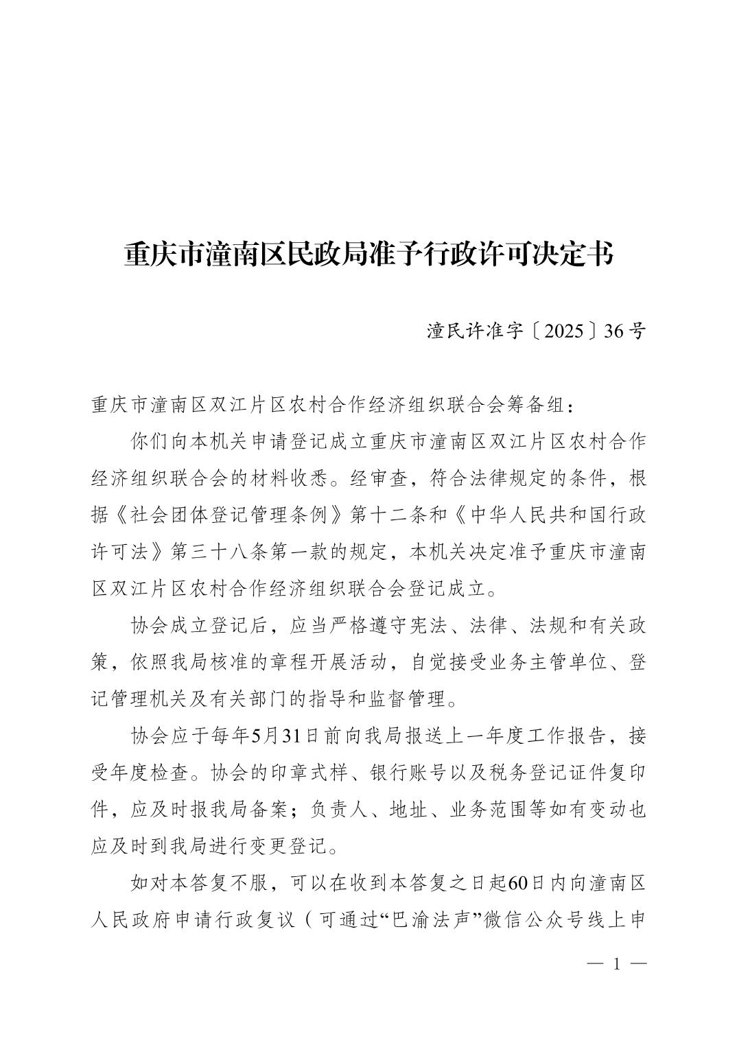重庆市潼南区民政局准予行政许可决定书〔2025〕36号 重庆市潼南区双江片区农村合作经济组织联合会成立登记