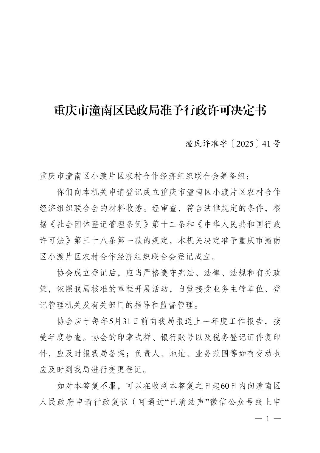 重庆市潼南区民政局准予行政许可决定书〔2025〕41号 重庆市潼南区小渡片区农村合作经济组织联合会成立登记