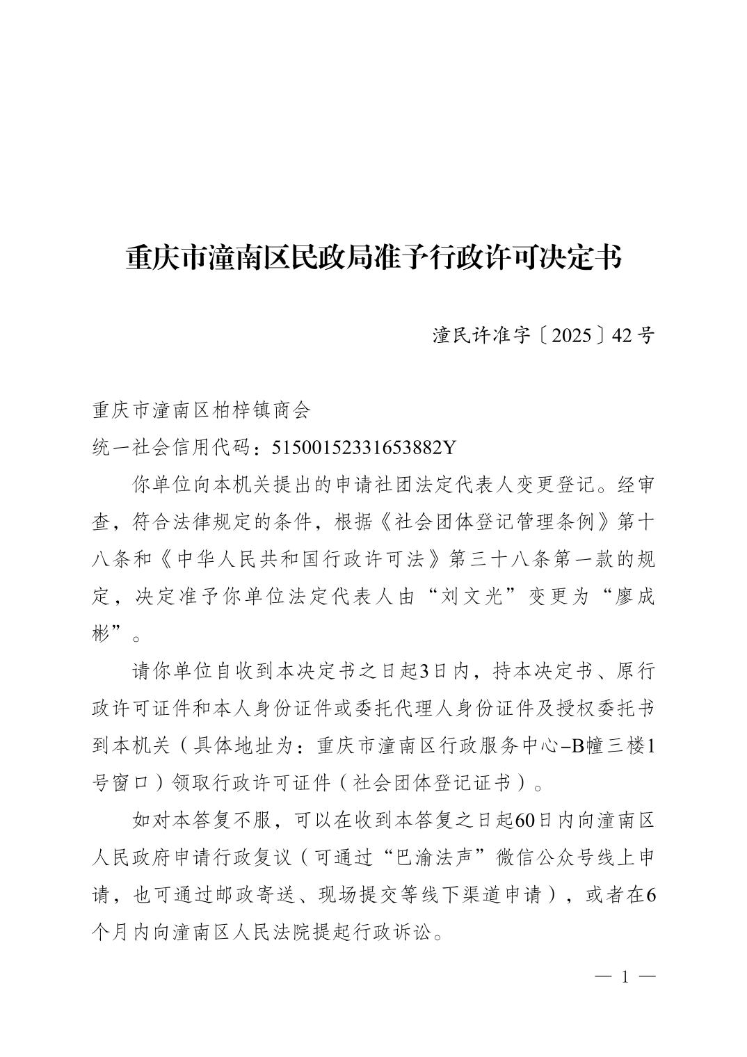 重庆市潼南区民政局准予行政许可决定书〔2025〕42号 重庆市潼南区柏梓镇商会变更登记变更登记