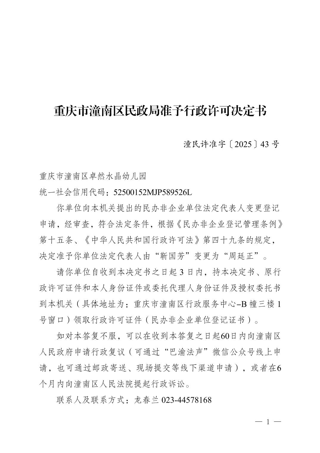 重庆市潼南区民政局准予行政许可决定书〔2025〕43号 重庆市潼南区卓然水晶幼儿园幼儿园变更登记