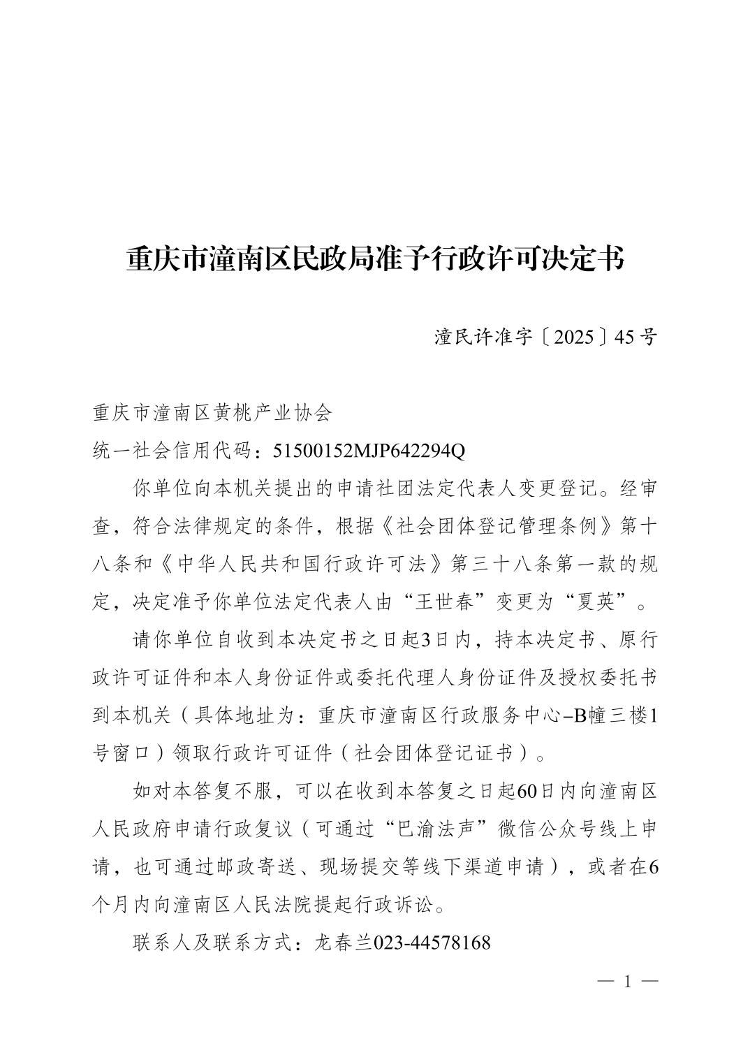 重庆市潼南区民政局准予行政许可决定书〔2025〕45号 重庆市潼南区黄桃产业协会变更登记