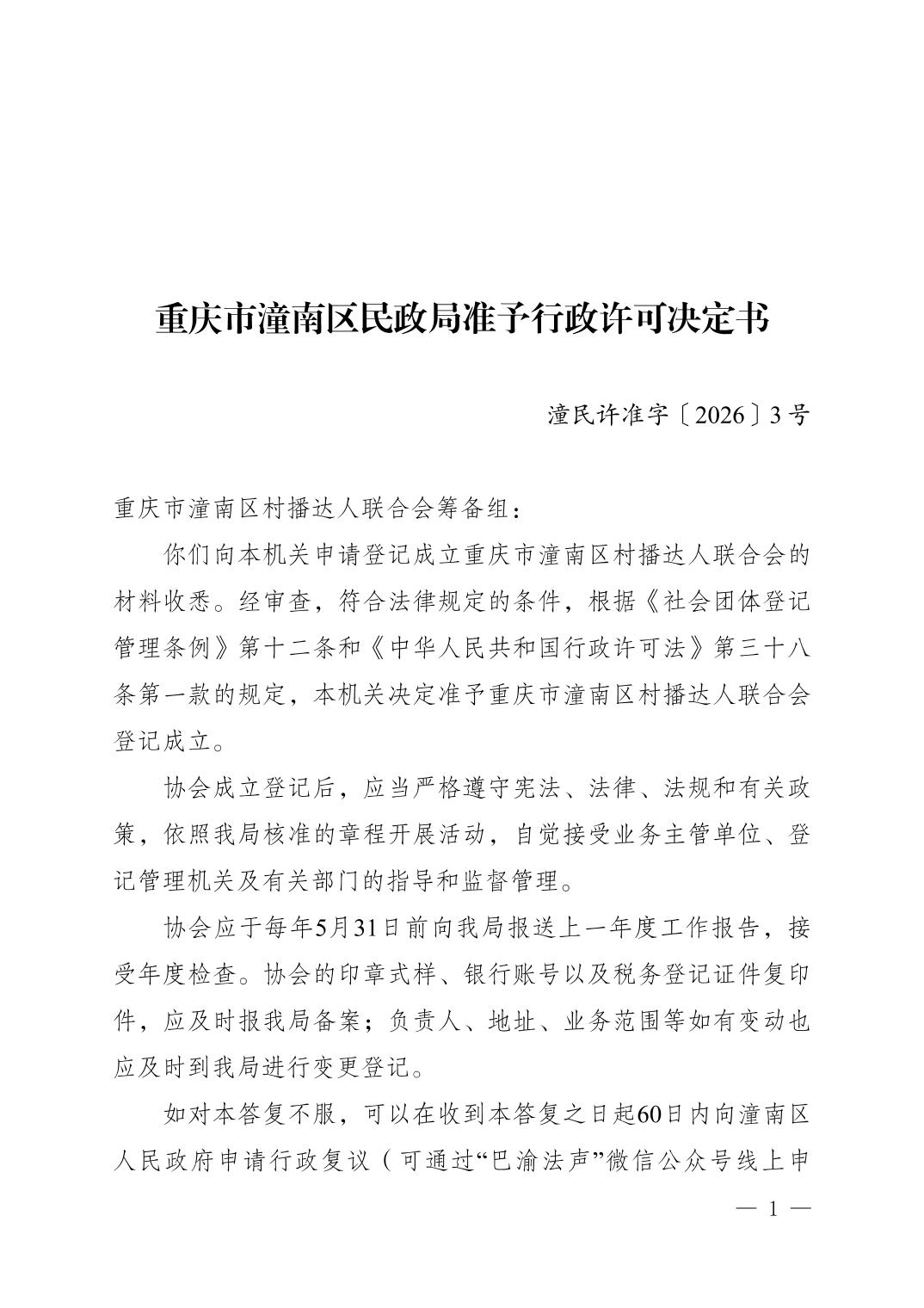 重庆市潼南区民政局准予行政许可决定书〔2026〕3号 重庆市潼南区村播达人联合会成立登记