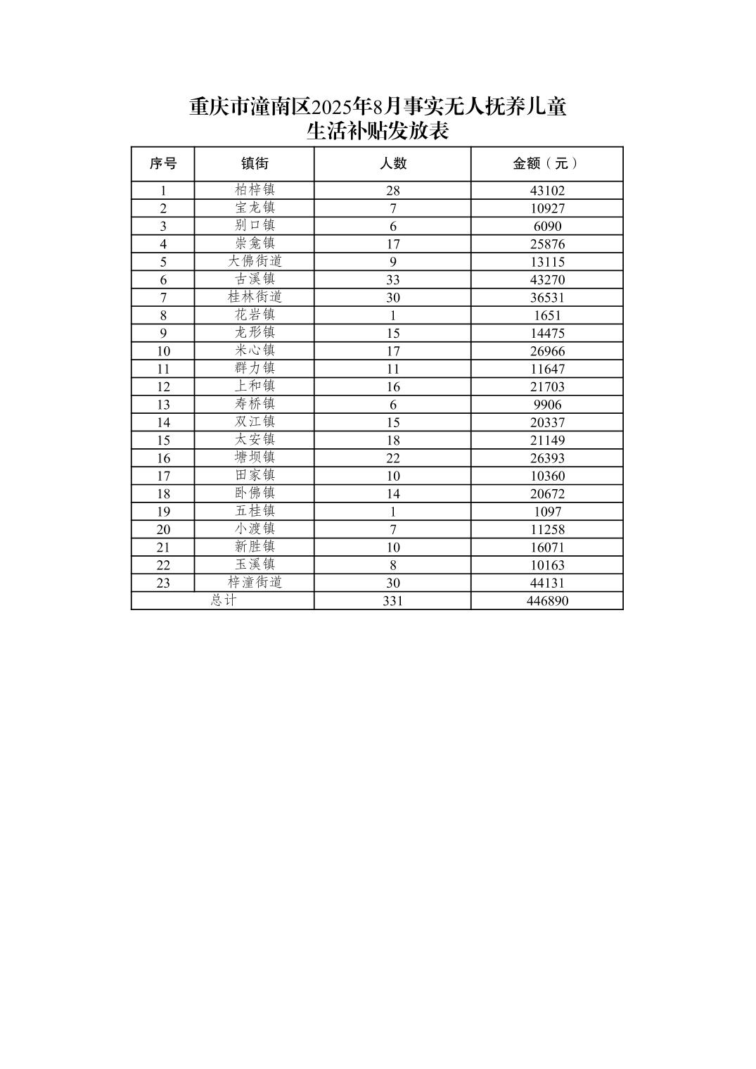 重庆市潼南区2025年8月事实无人抚养儿童生活补贴发放表