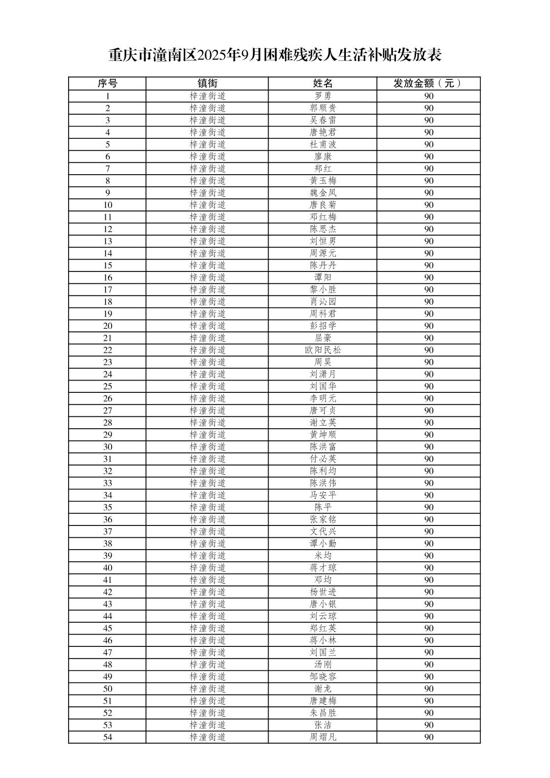 重庆市潼南区2025年9月困难残疾人生活补贴发放表