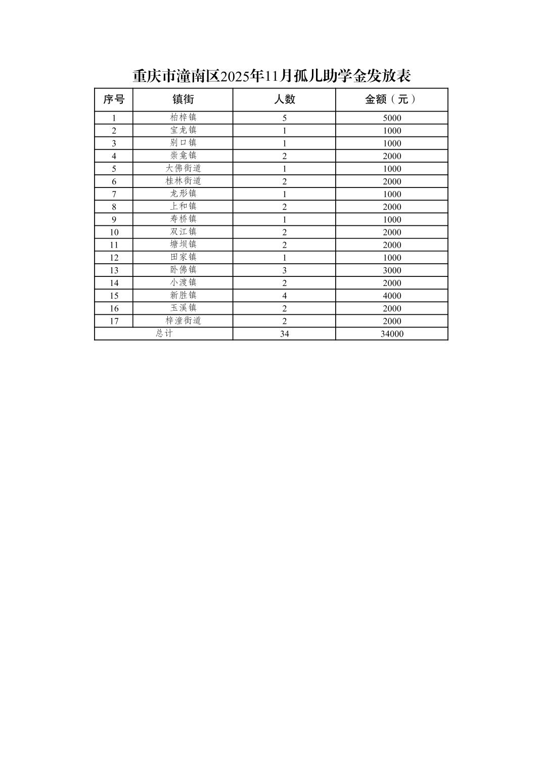 重庆市潼南区2025年11月孤儿助学金发放表