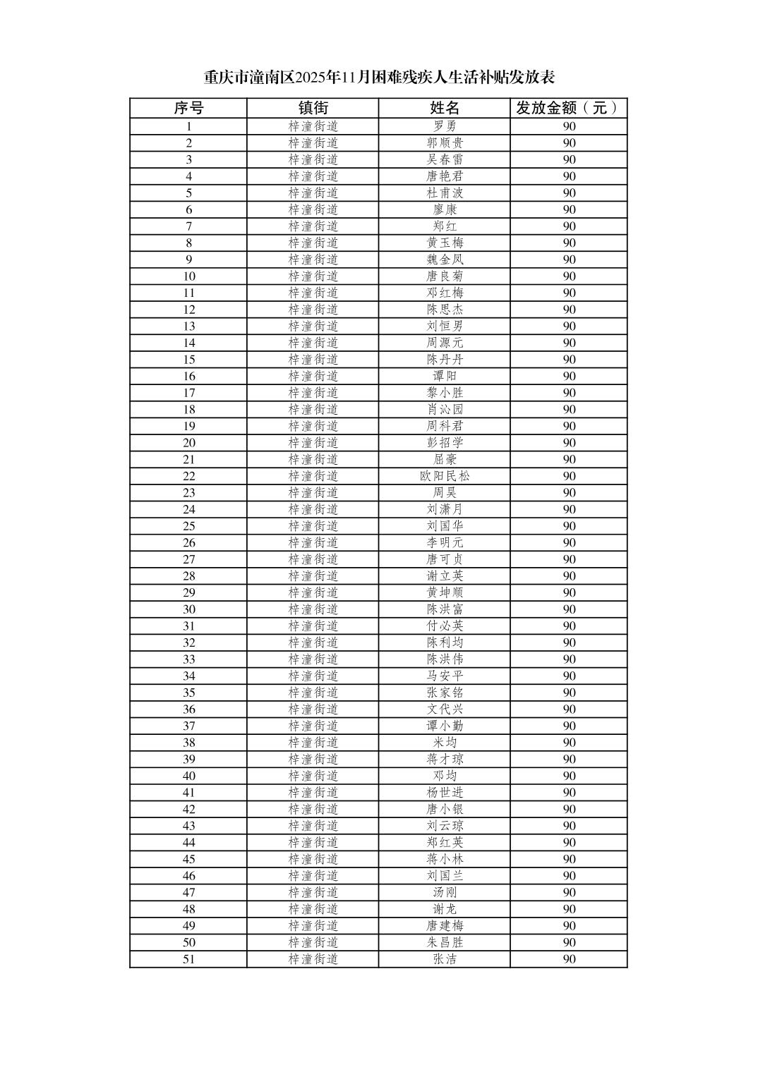 重庆市潼南区2025年11月困难残疾人生活补贴发放表