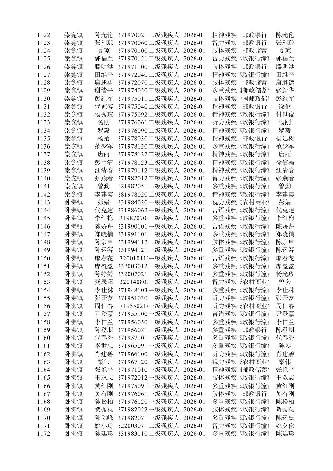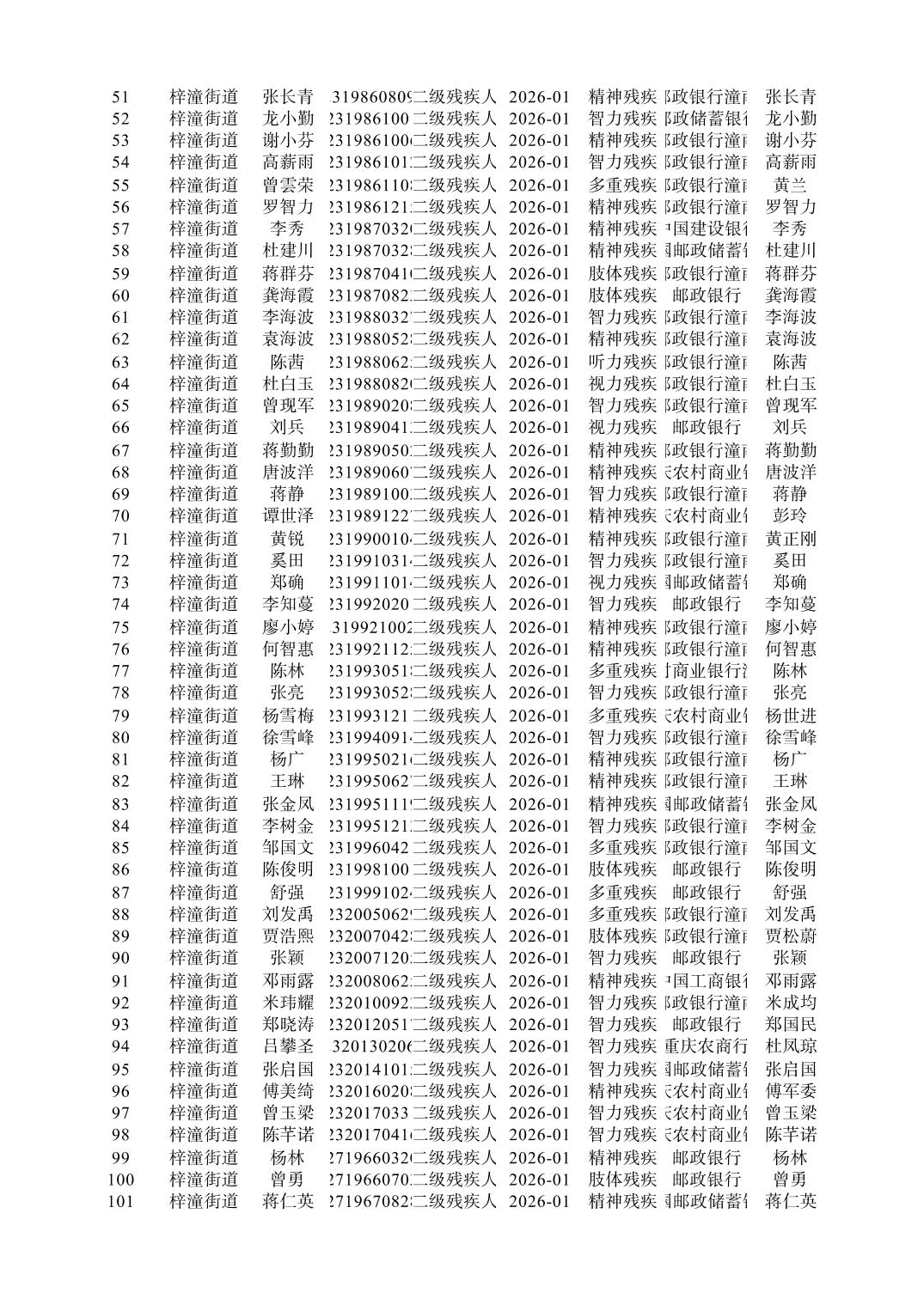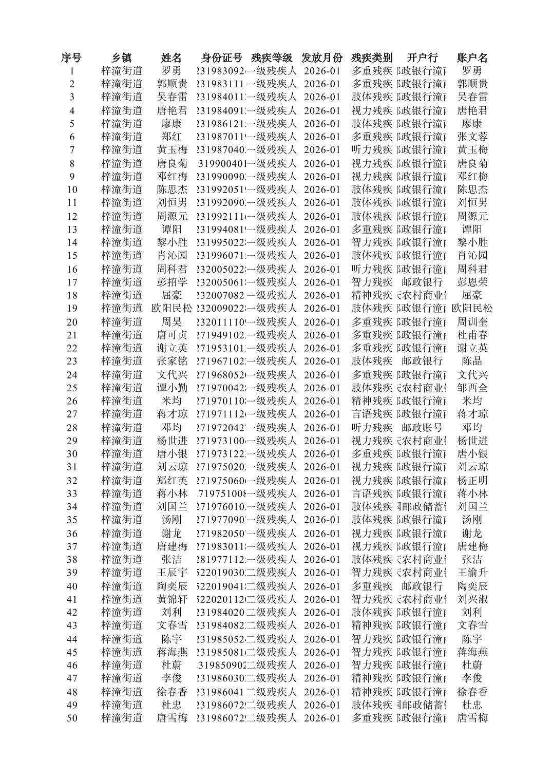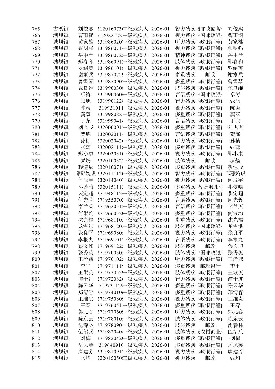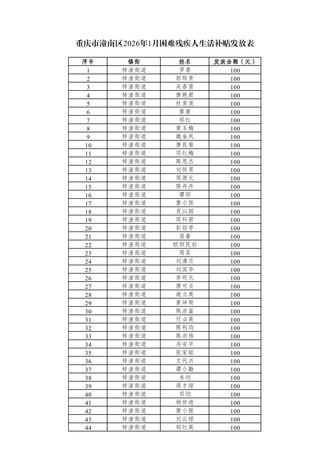 重庆市潼南区2026年1月困难残疾人生活补贴发放表