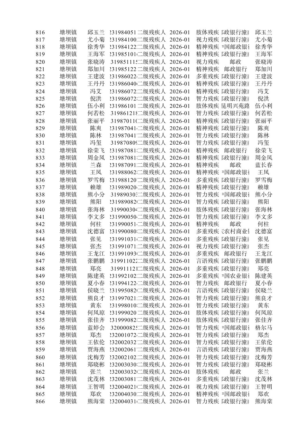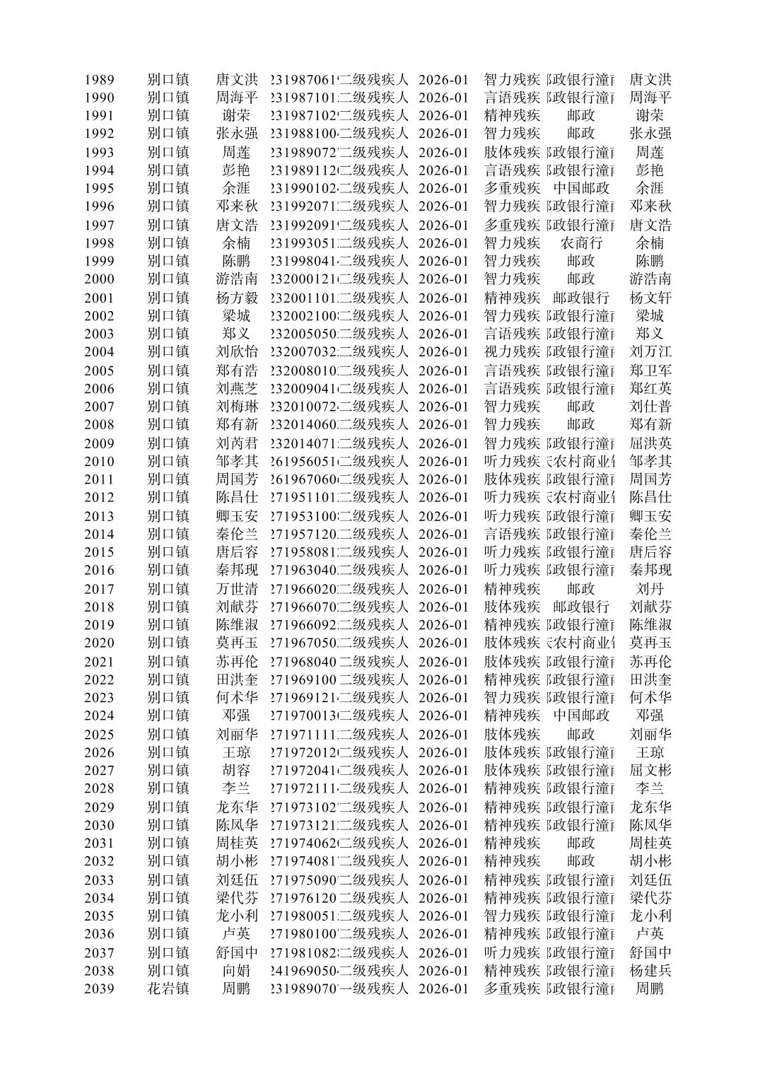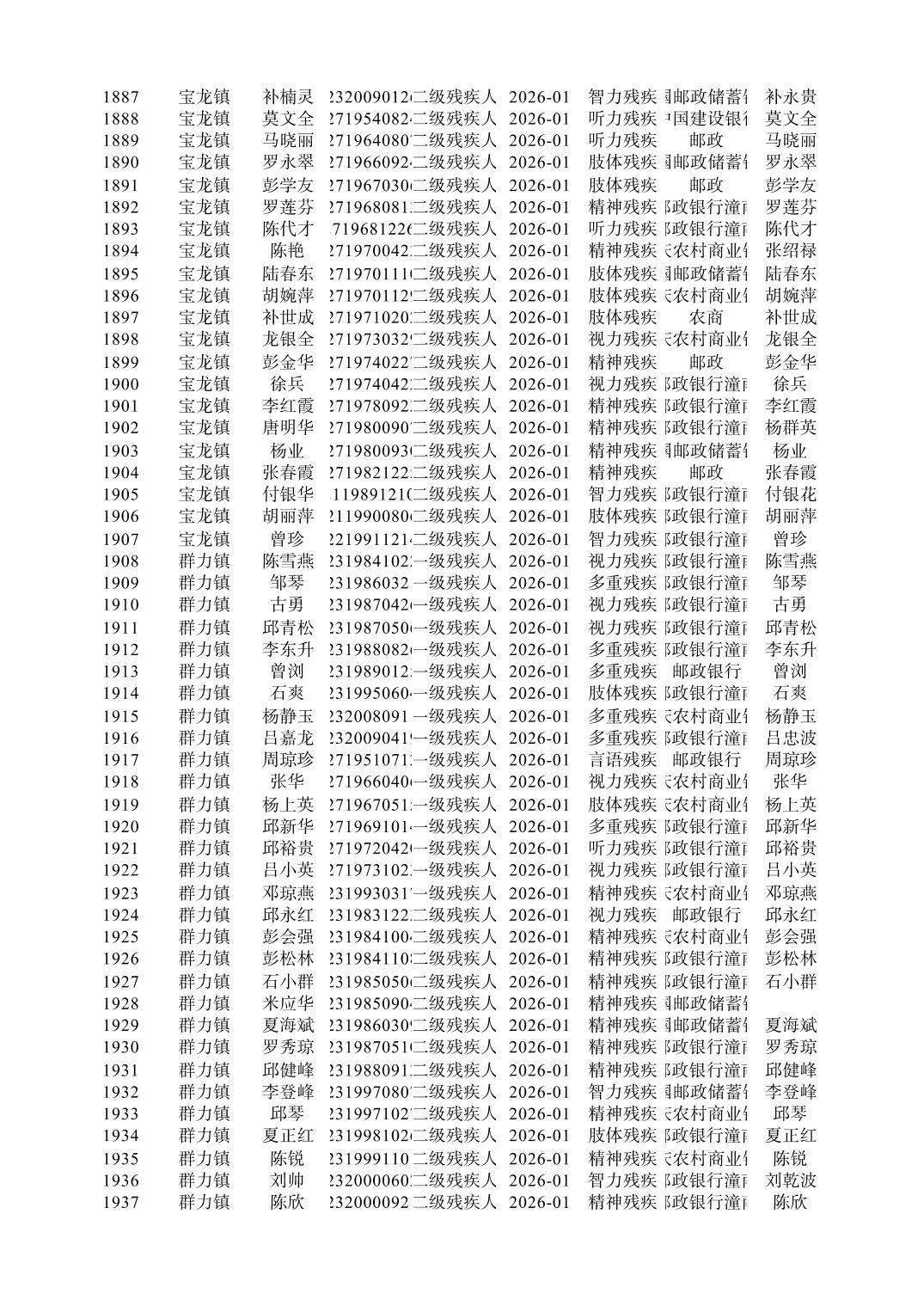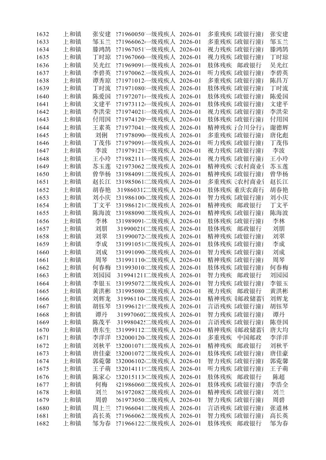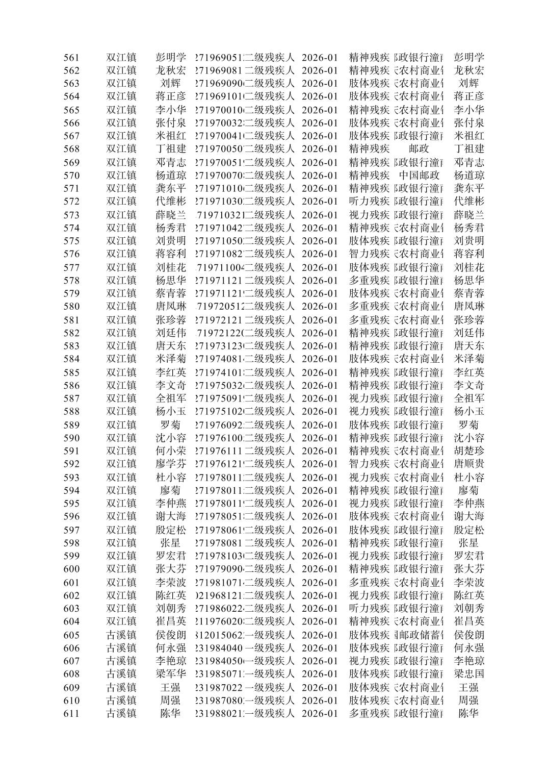 重庆市潼南区2026年1月困难残疾人生活补贴发放表