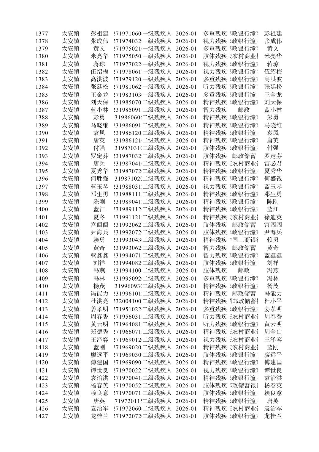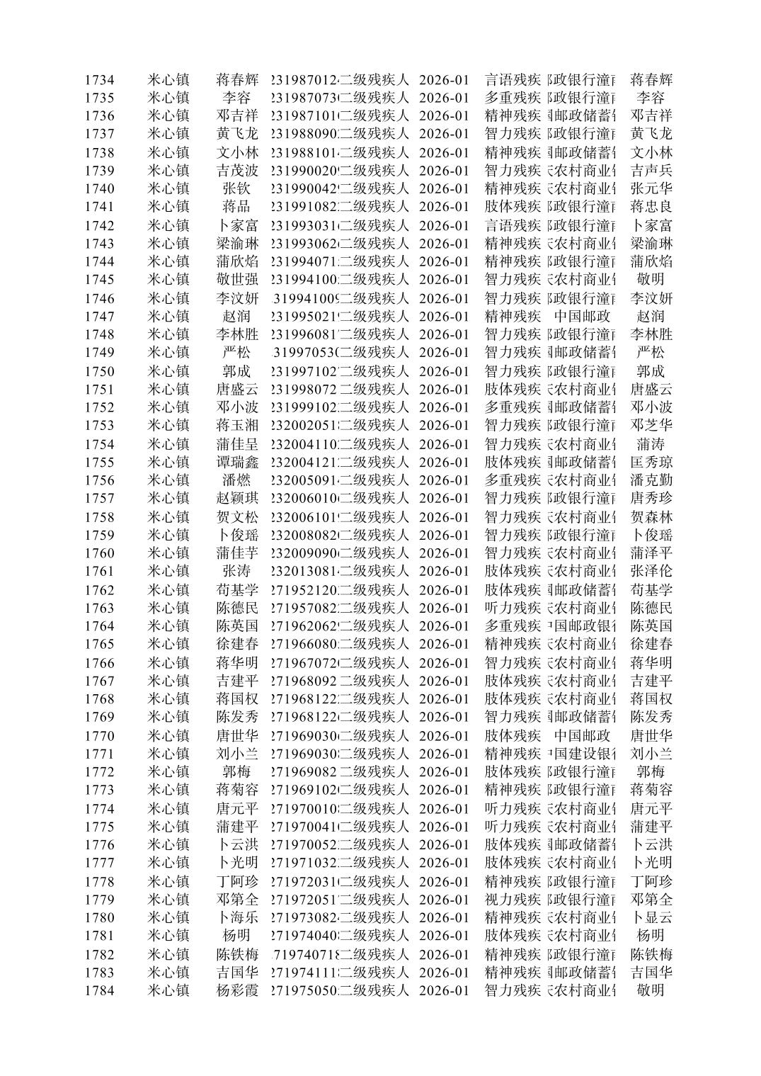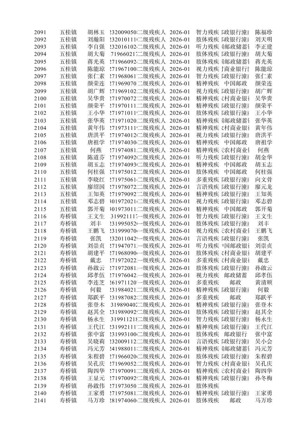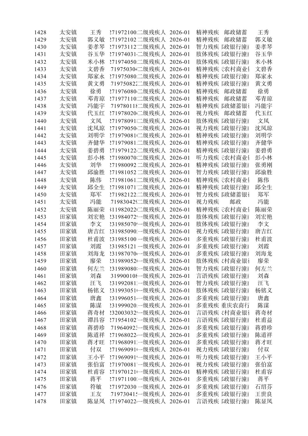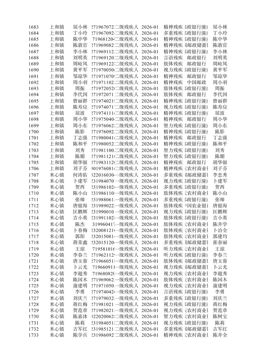 重庆市潼南区2026年1月困难残疾人生活补贴发放表