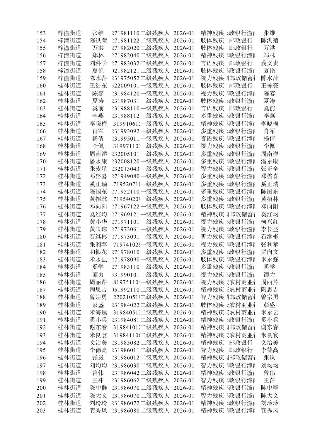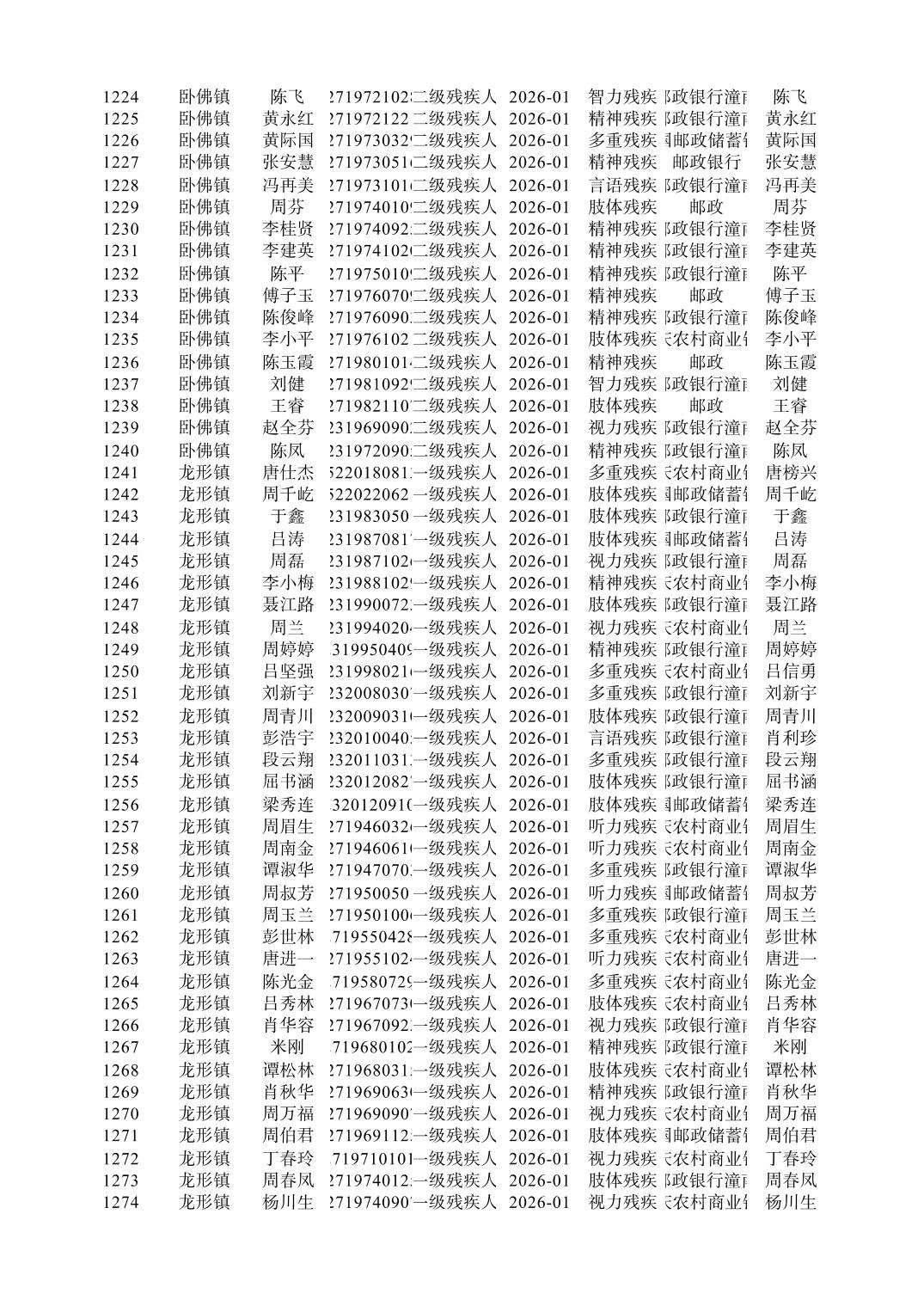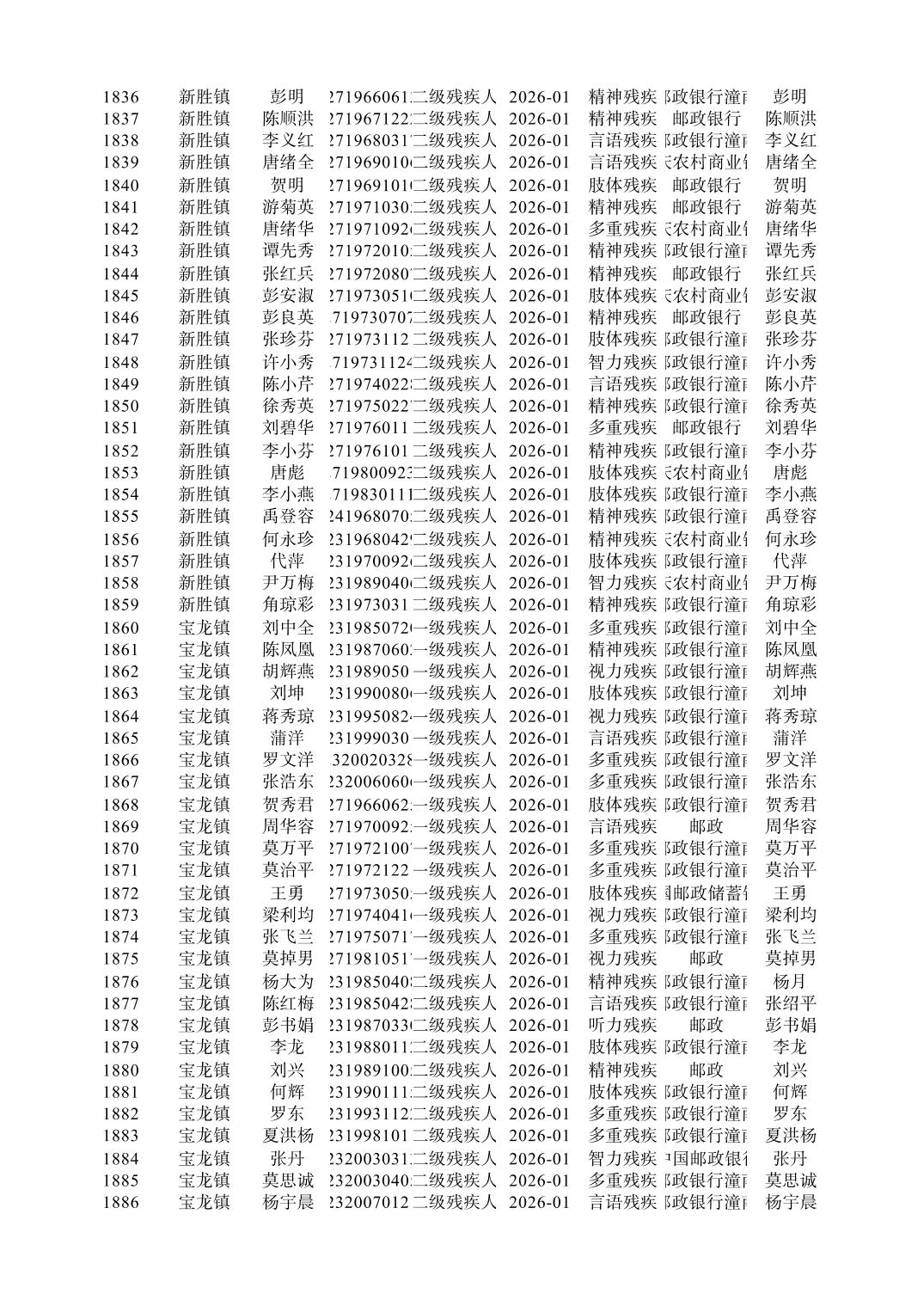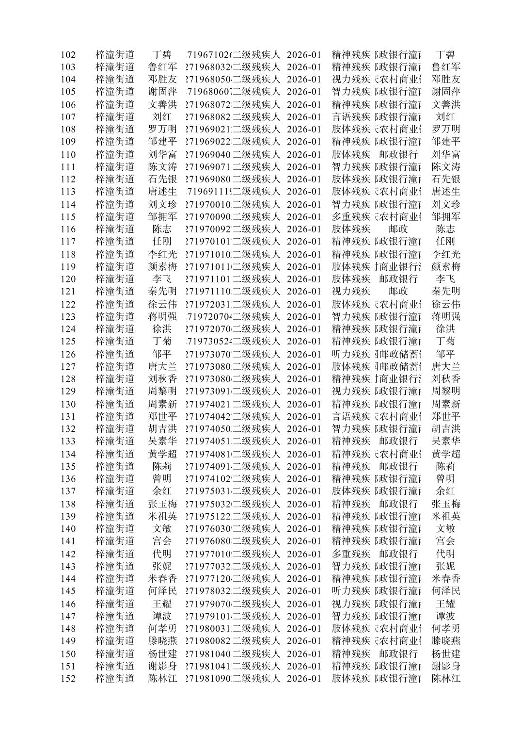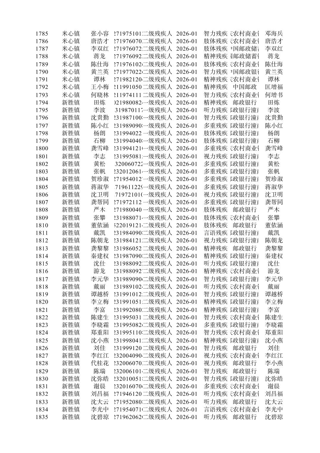 重庆市潼南区2026年1月困难残疾人生活补贴发放表