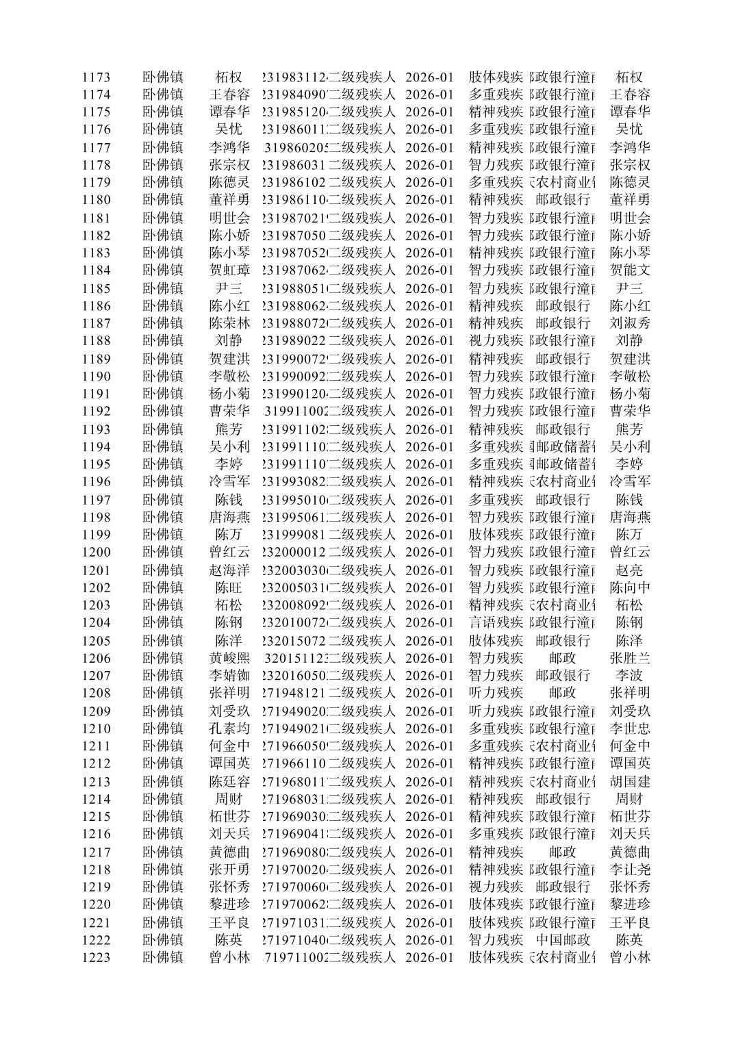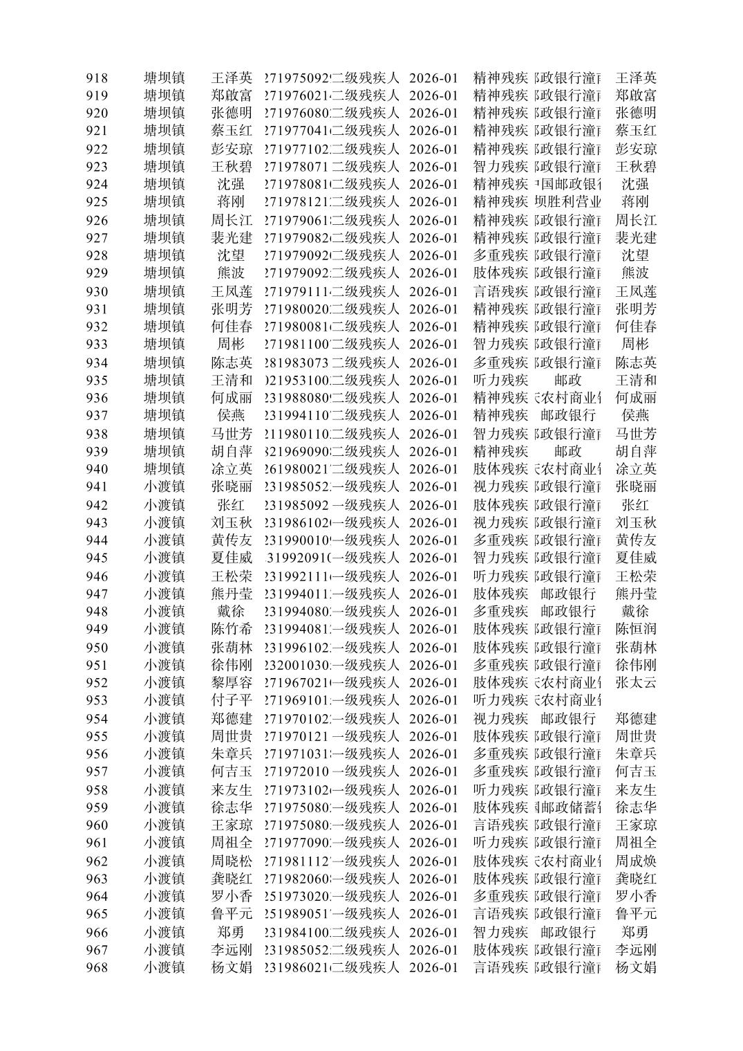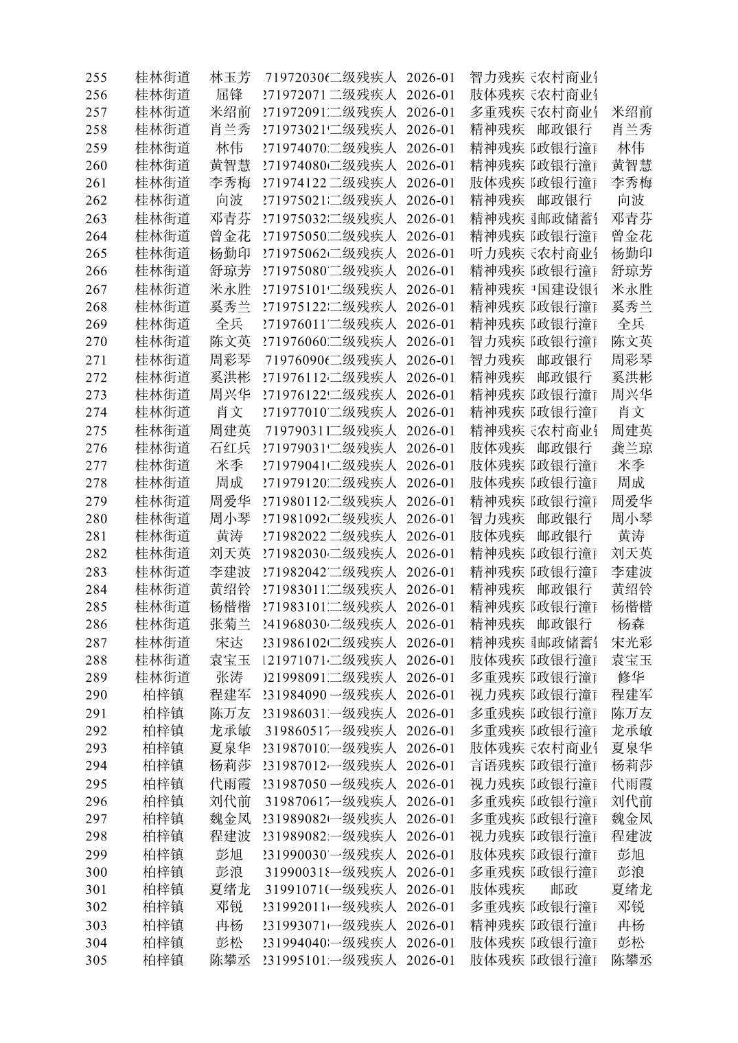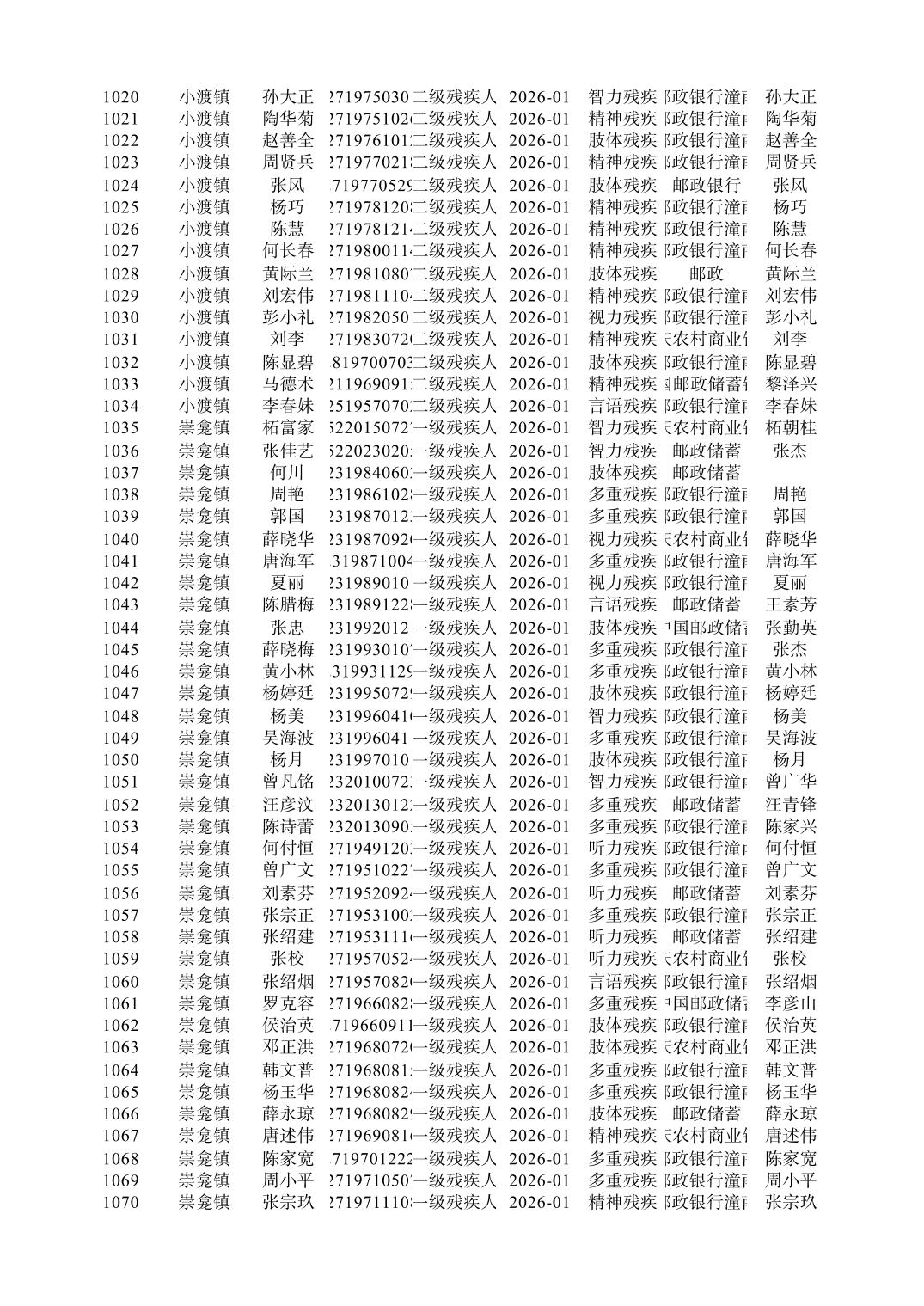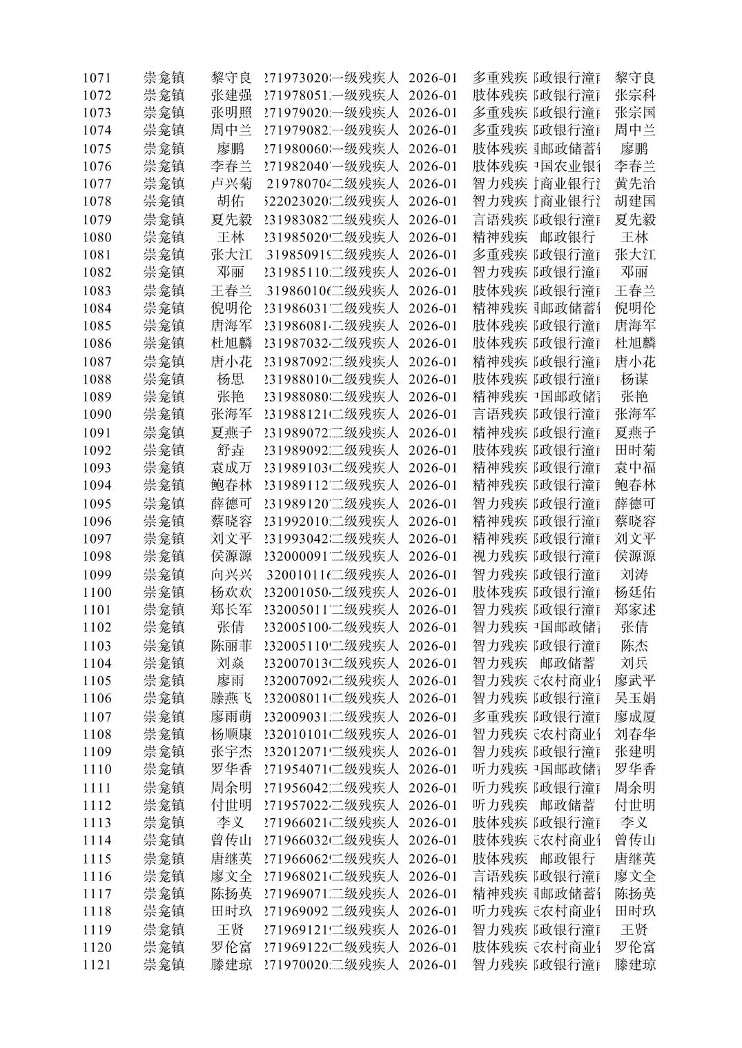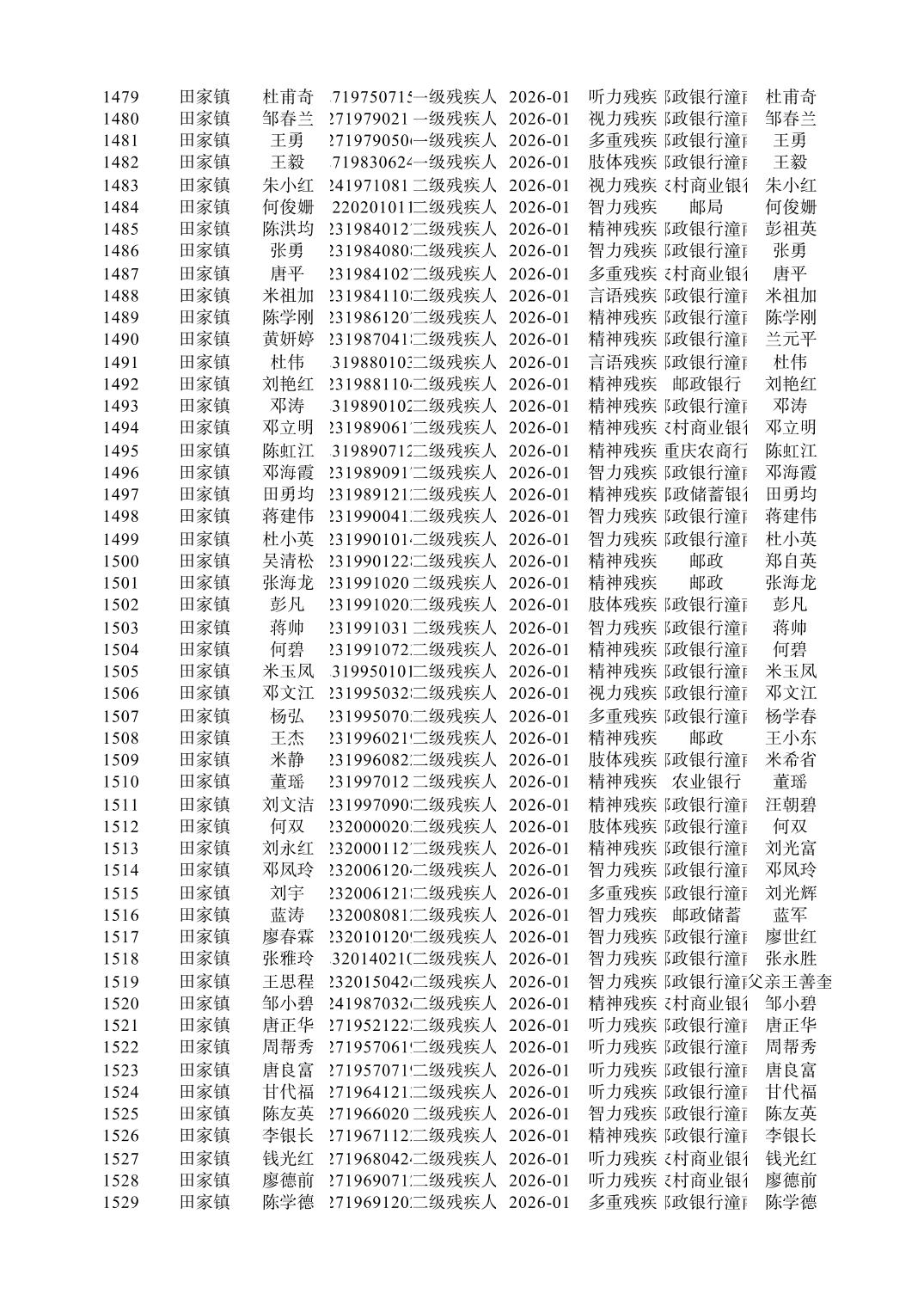 重庆市潼南区2026年1月困难残疾人生活补贴发放表
