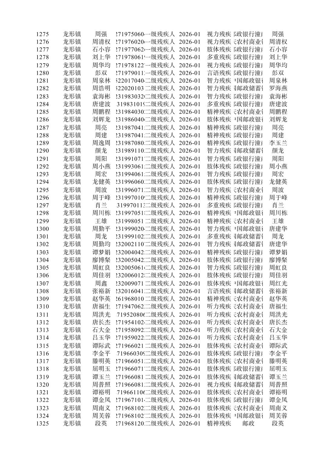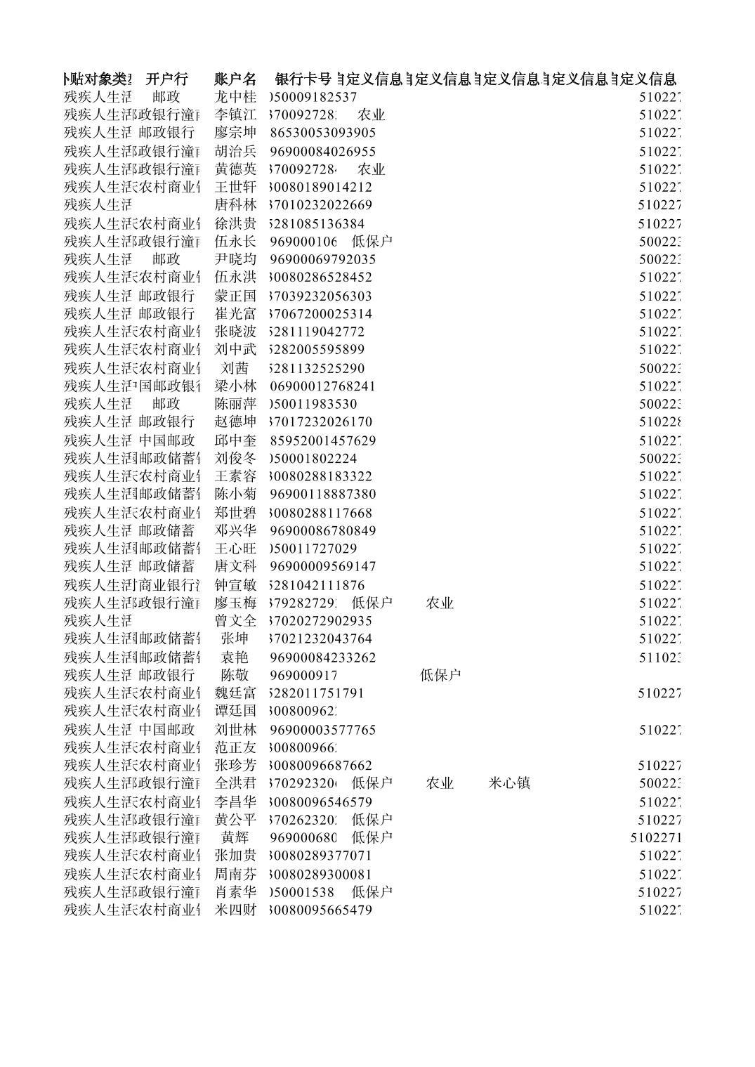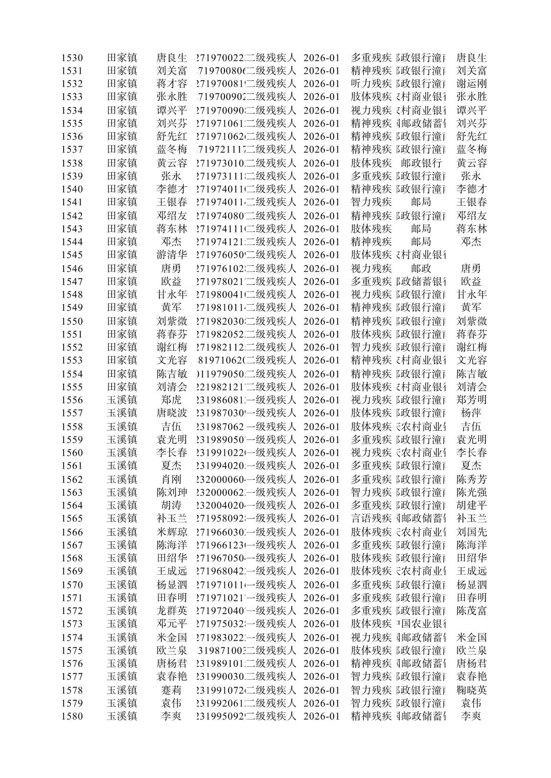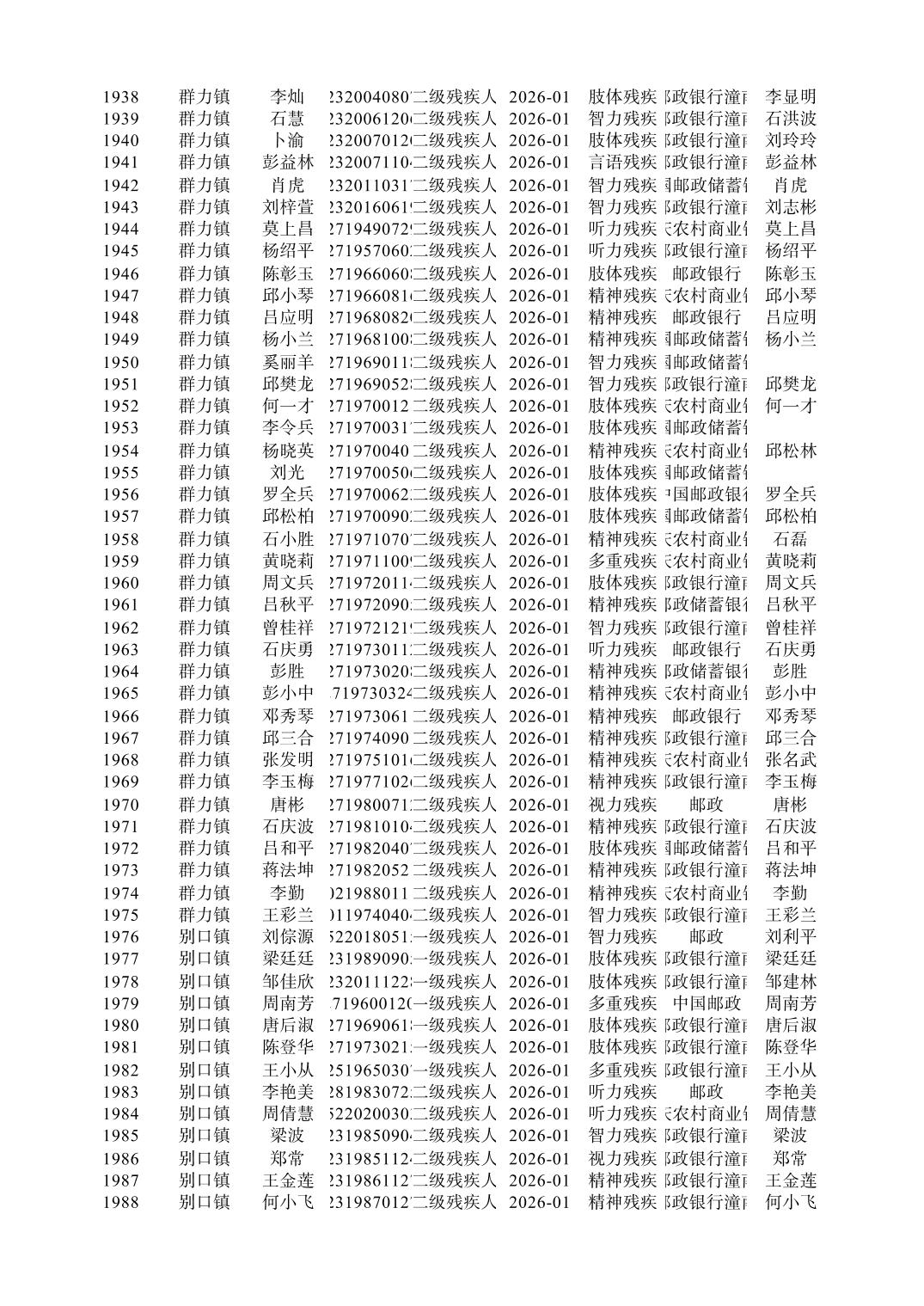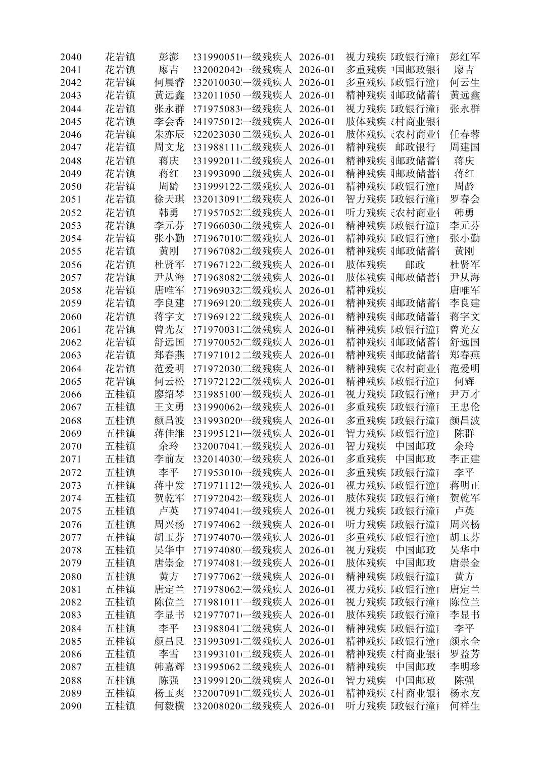 重庆市潼南区2026年1月困难残疾人生活补贴发放表