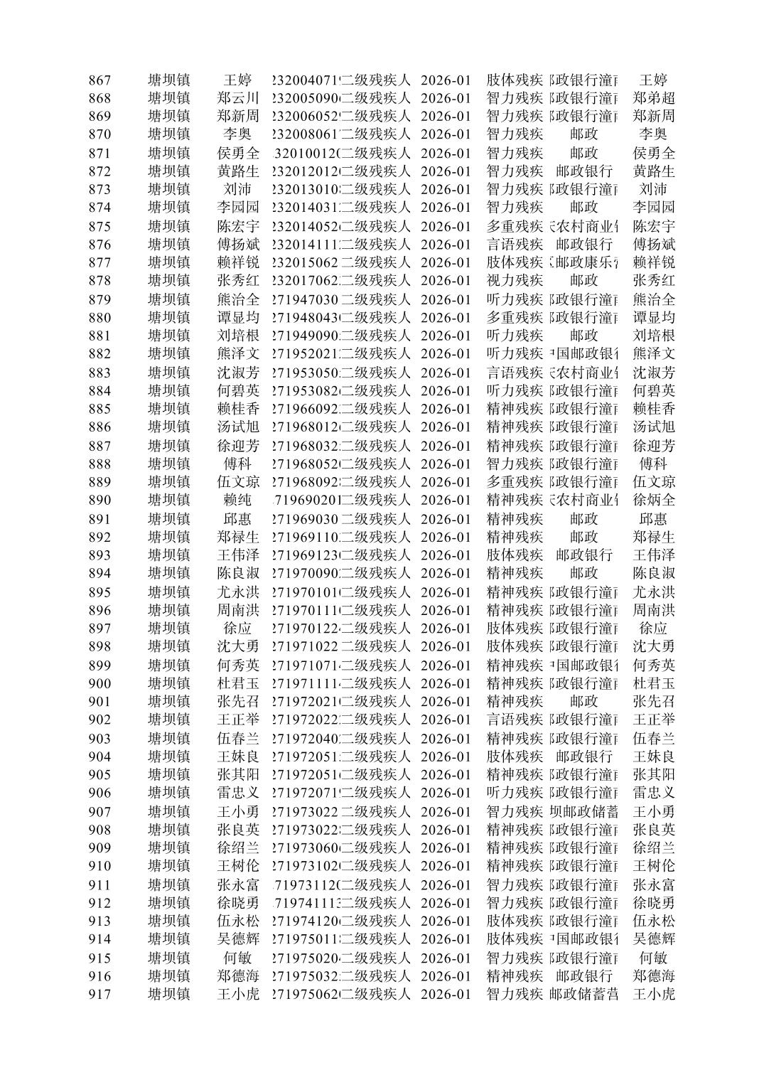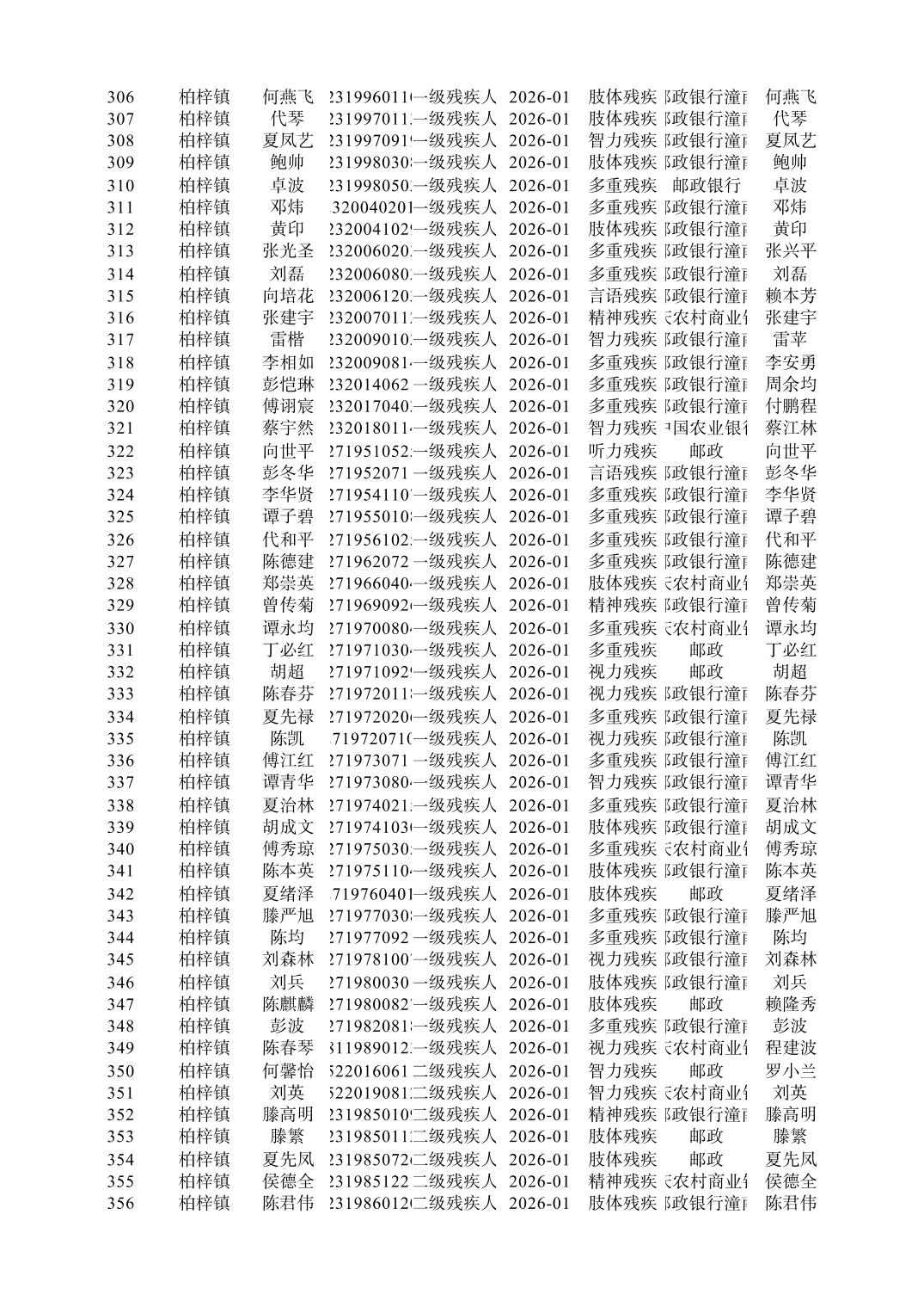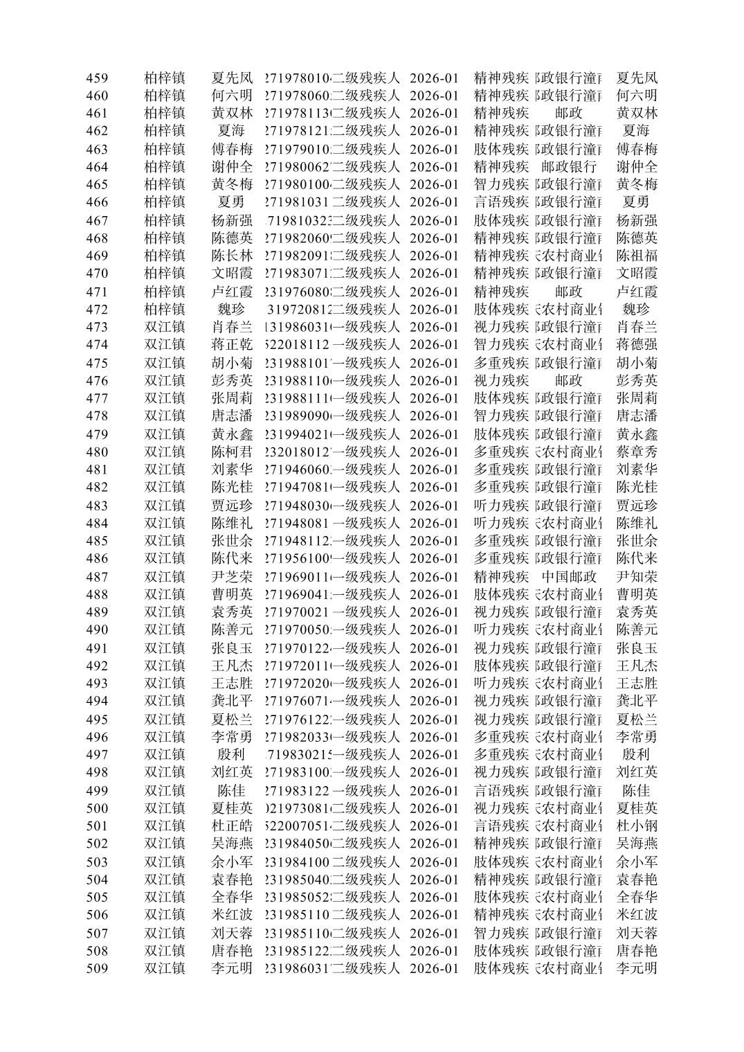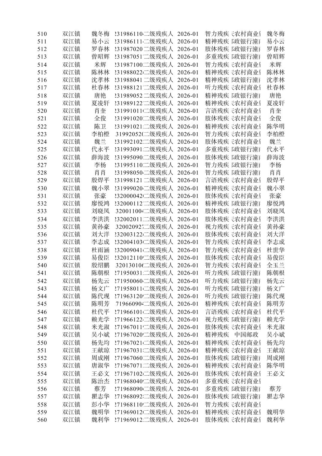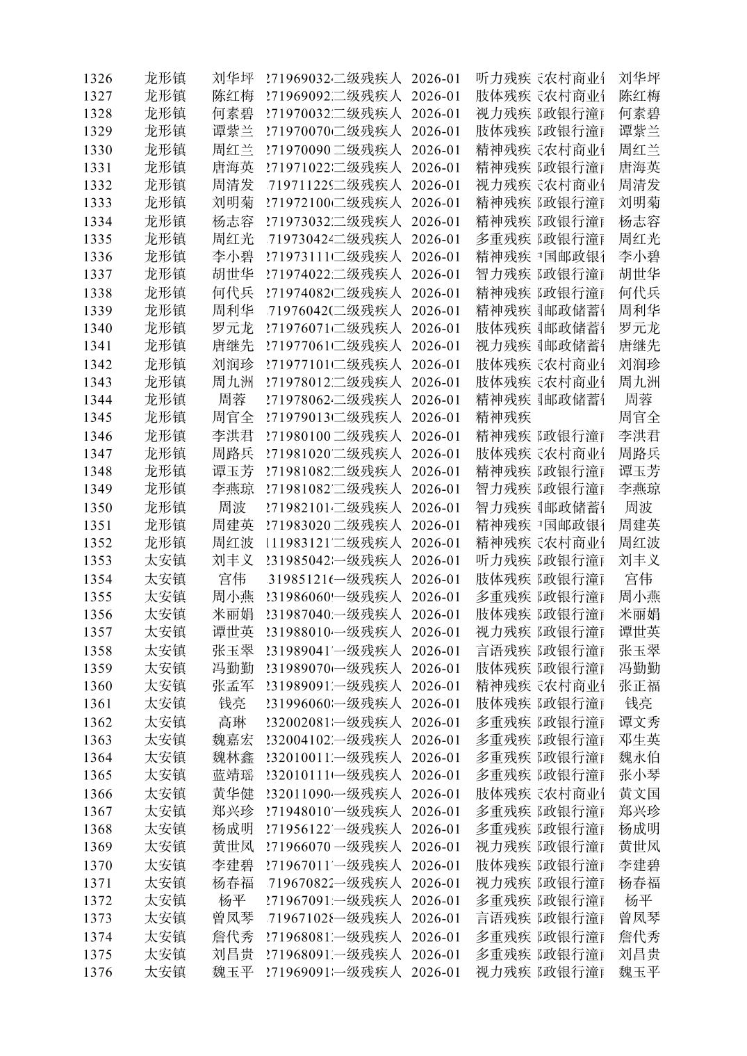 重庆市潼南区2026年1月困难残疾人生活补贴发放表