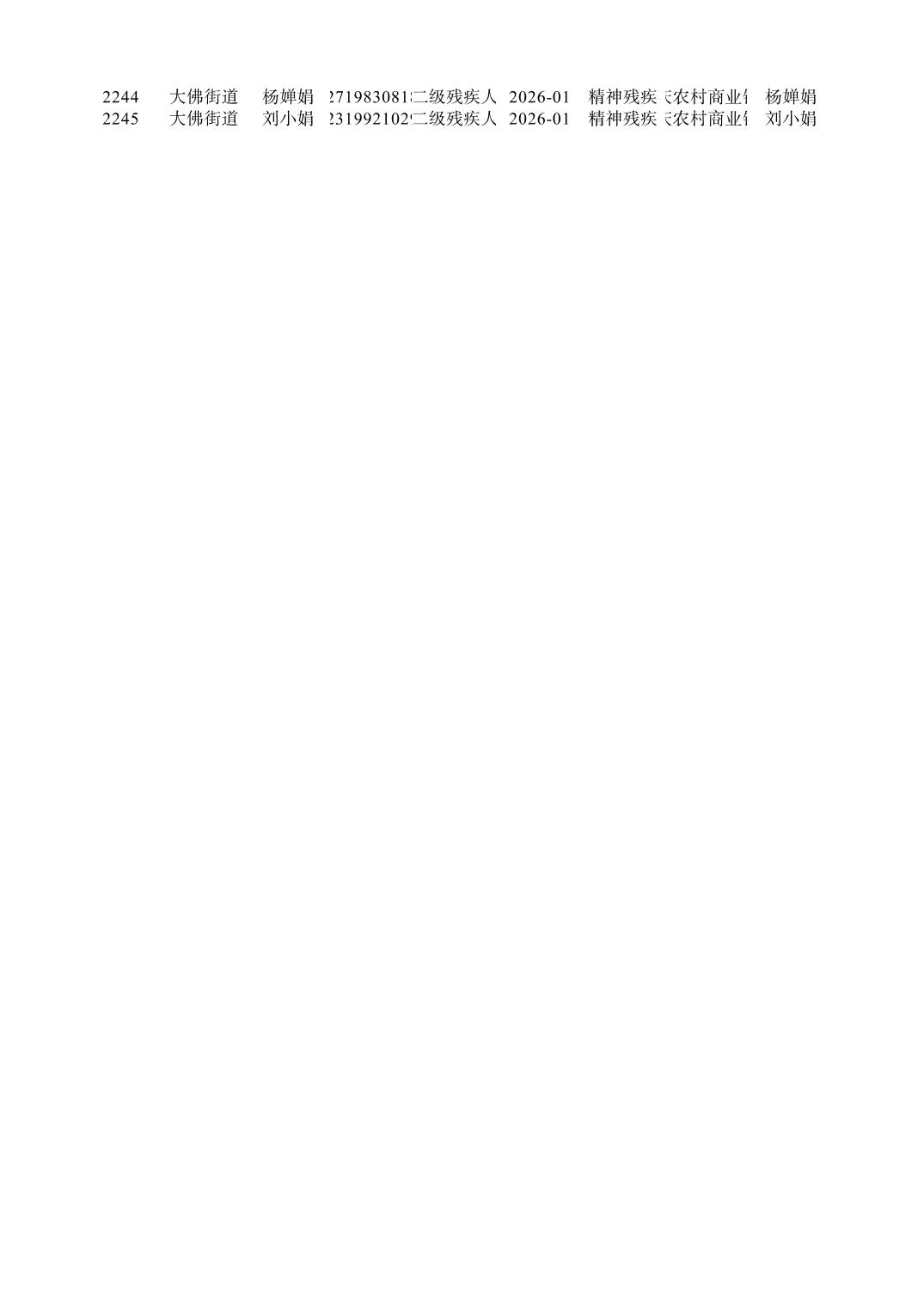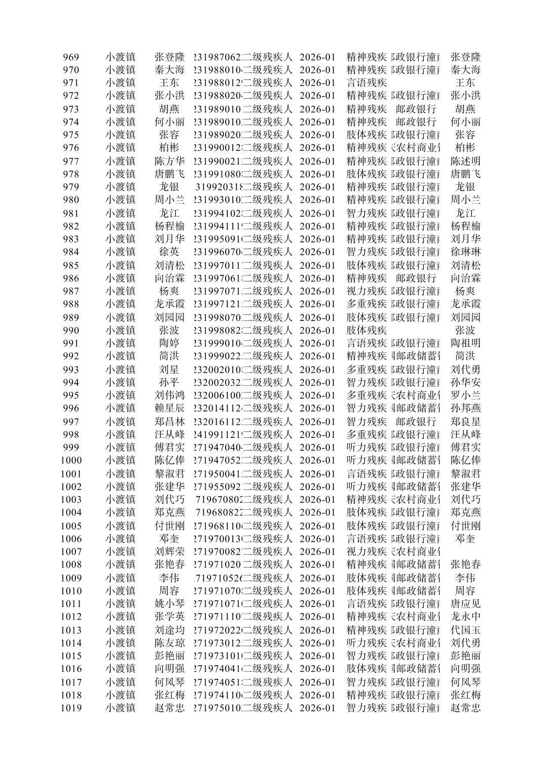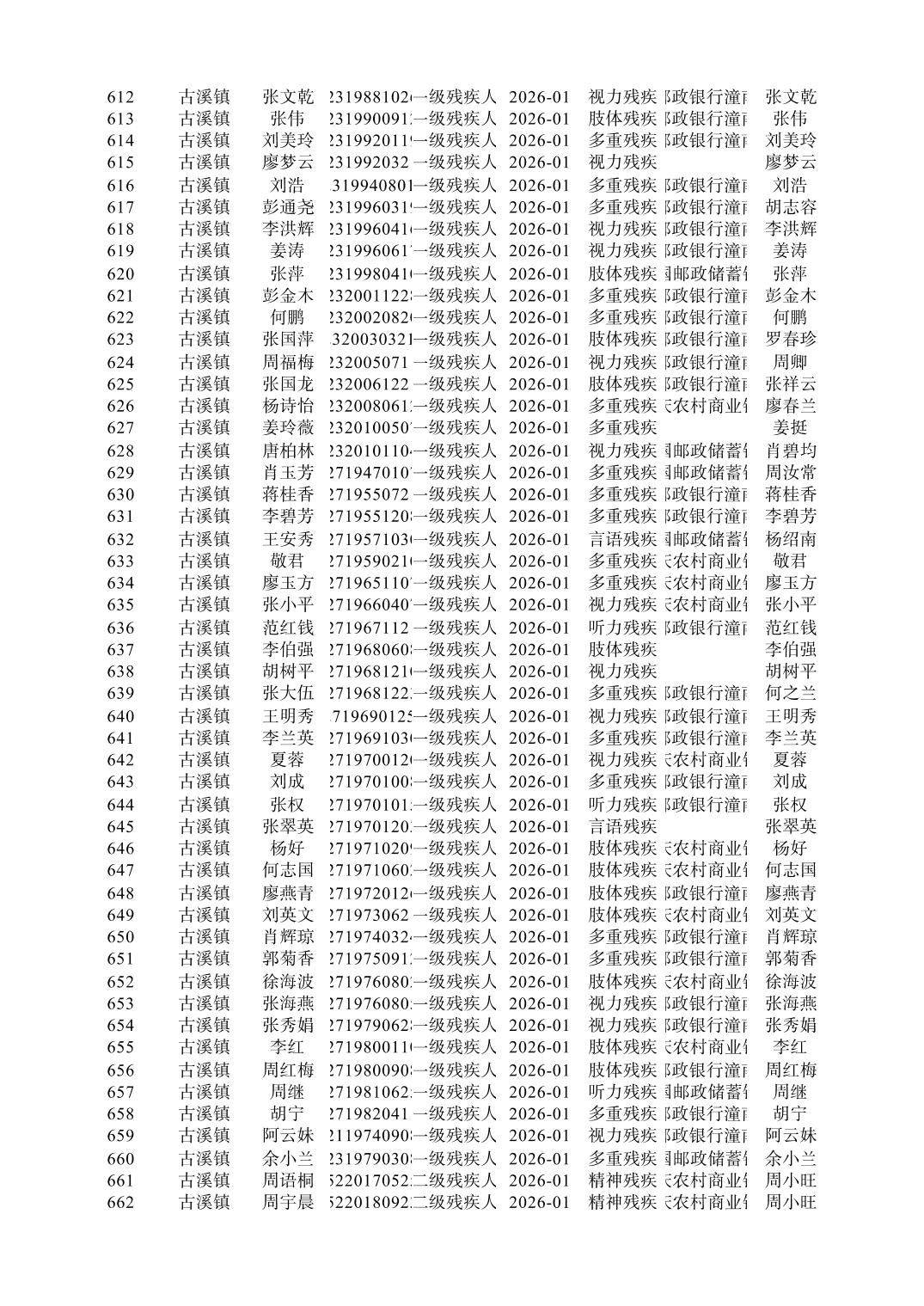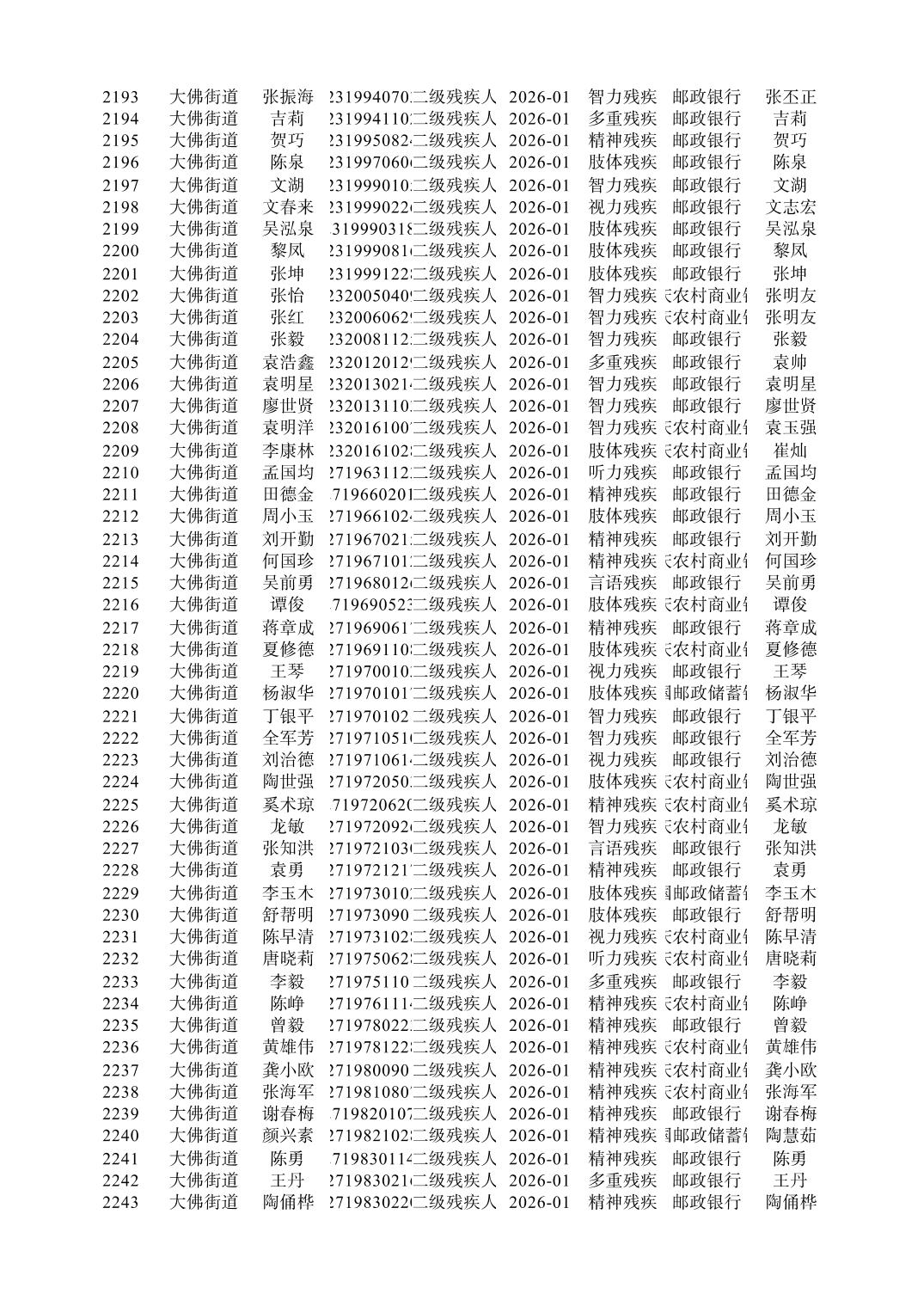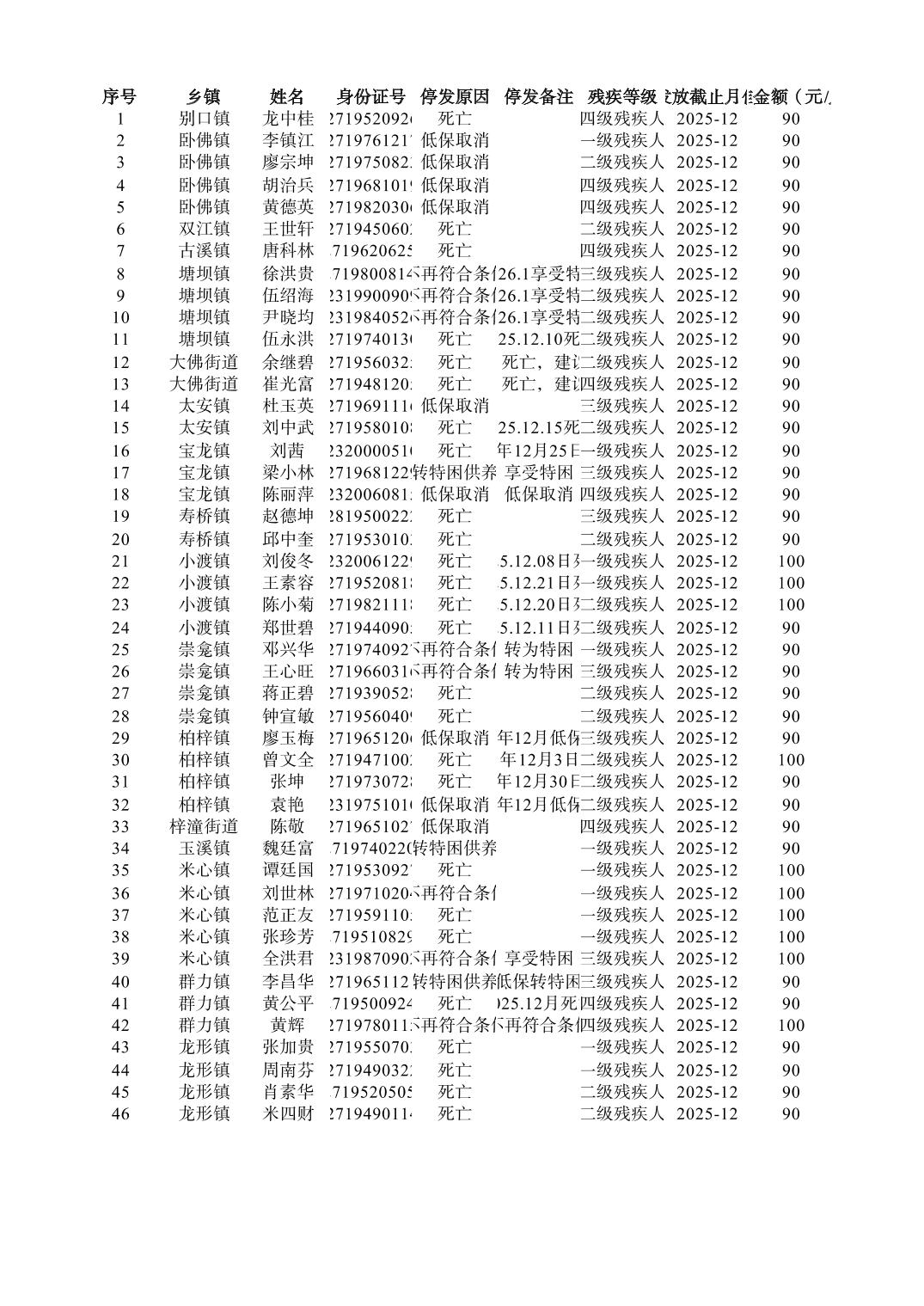 重庆市潼南区2026年1月困难残疾人生活补贴发放表