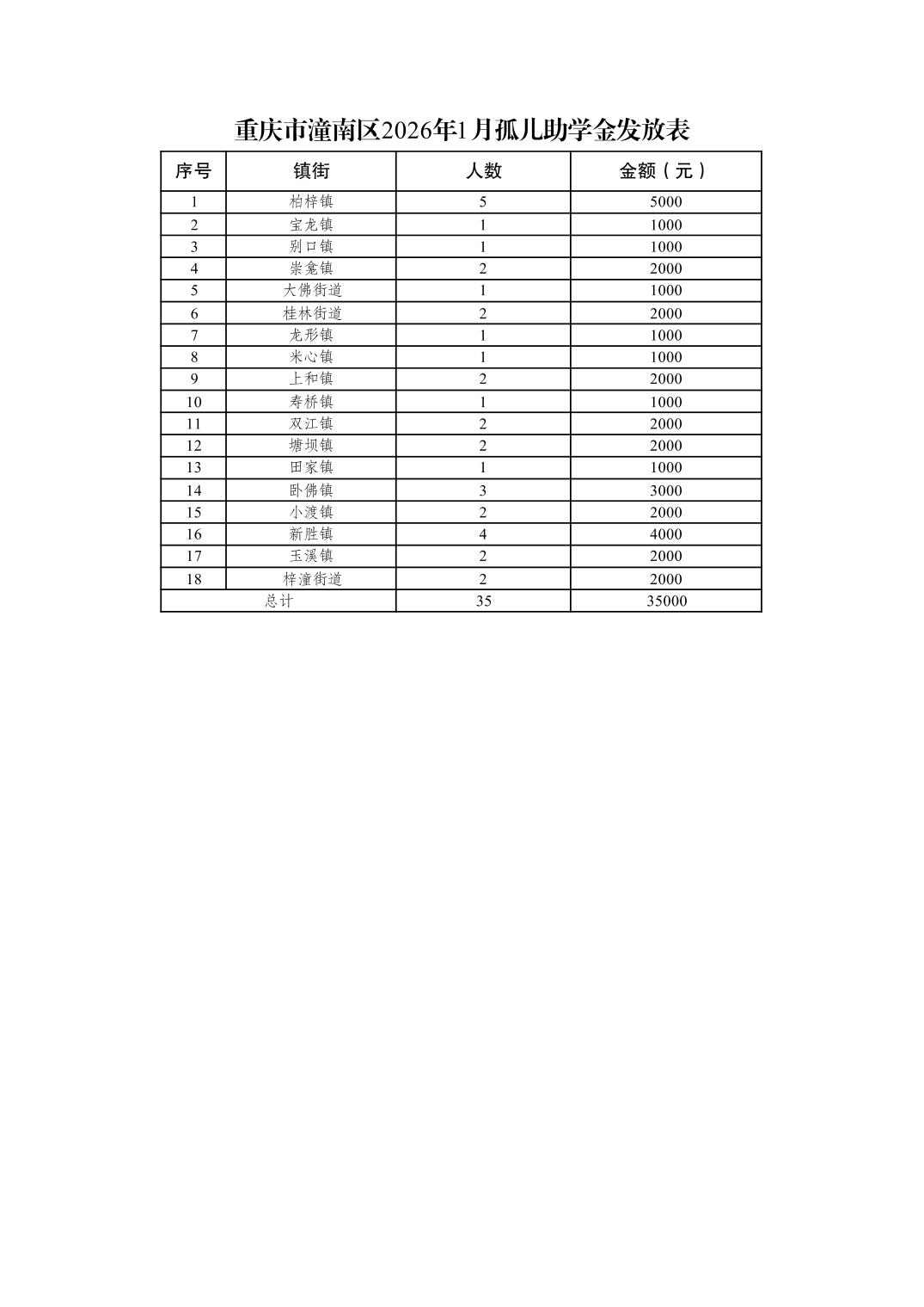 重庆市潼南区2026年1月孤儿助学金发放表