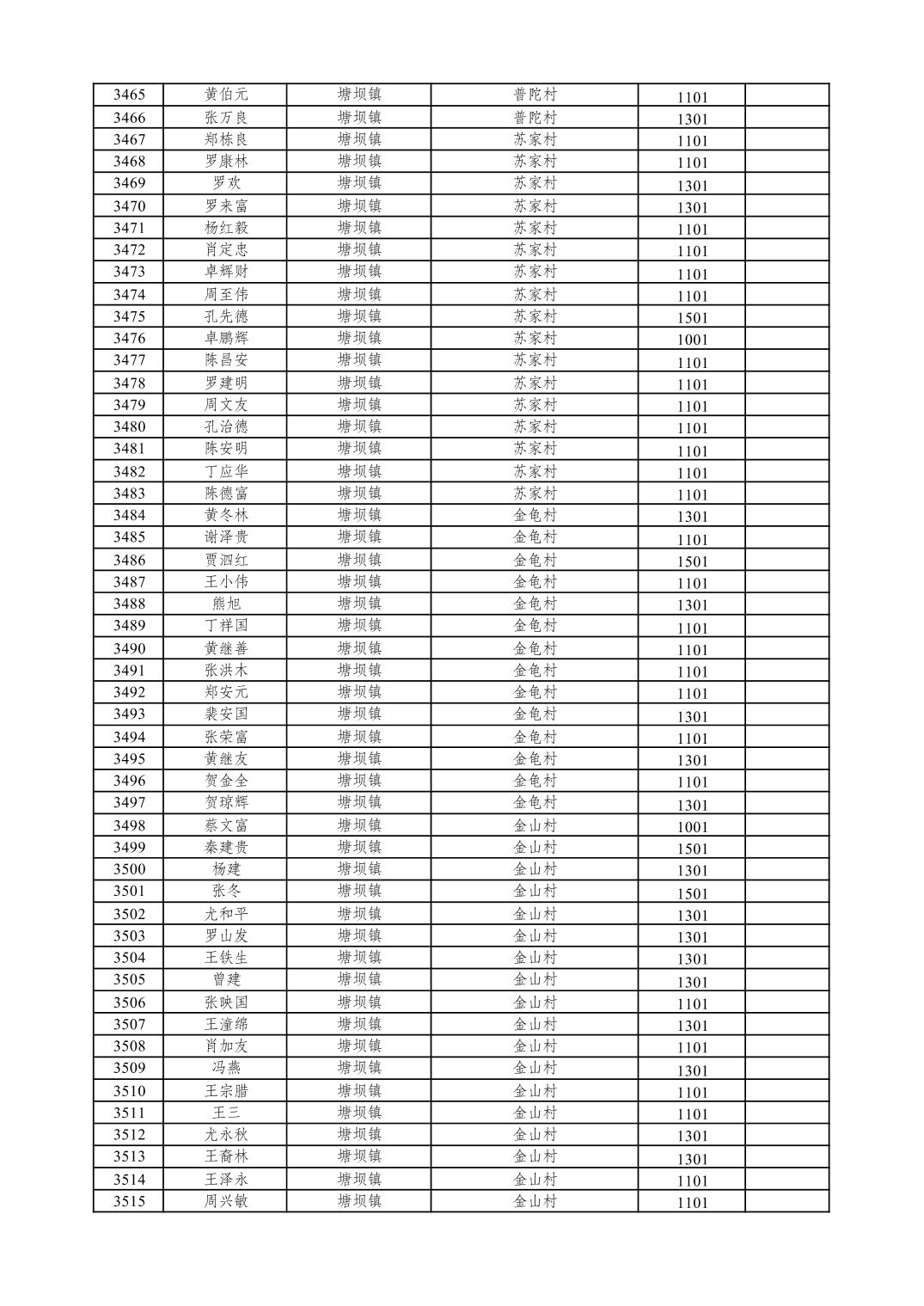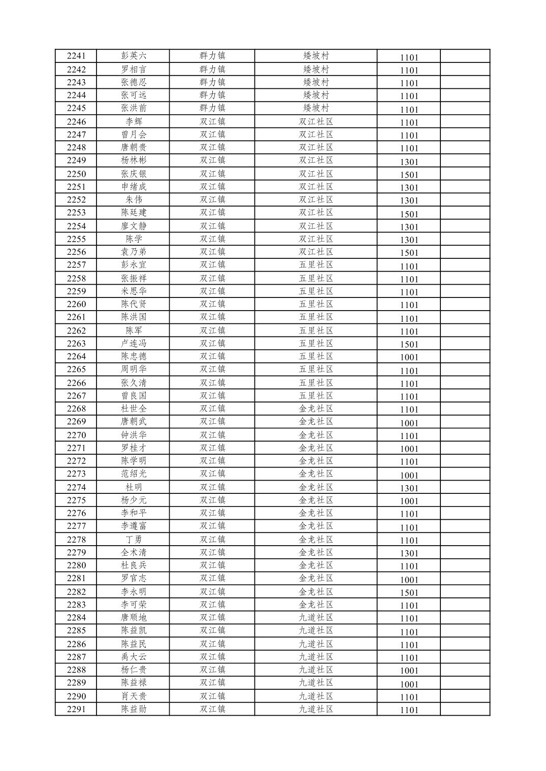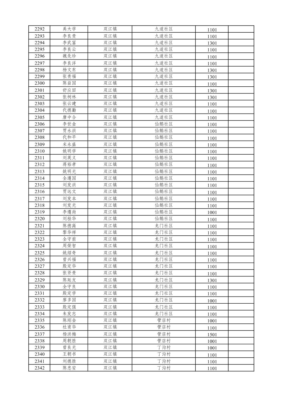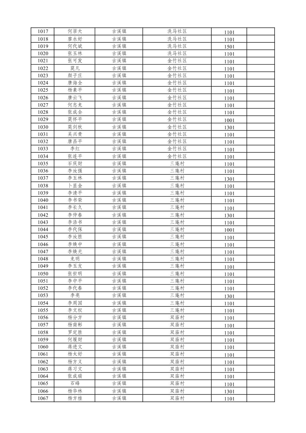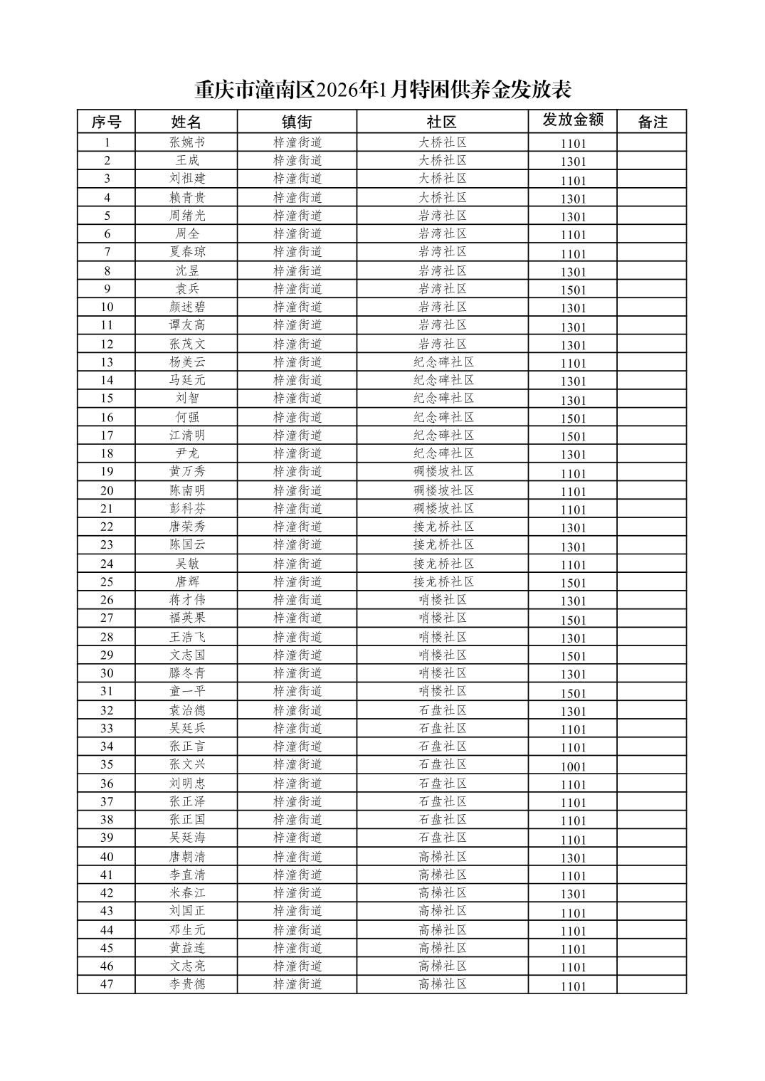重庆市潼南区2026年1月特困供养金发放表