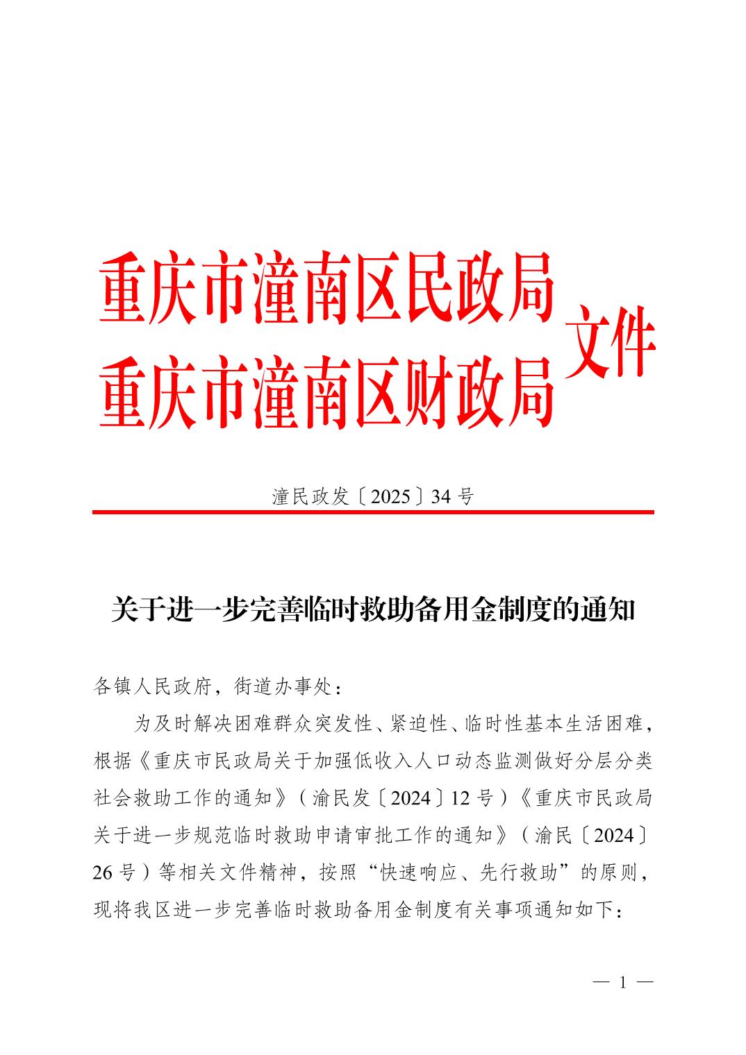 重庆市潼南区民政局 重庆市潼南区财政局关于进一步完善临时救助备用金制度的通知