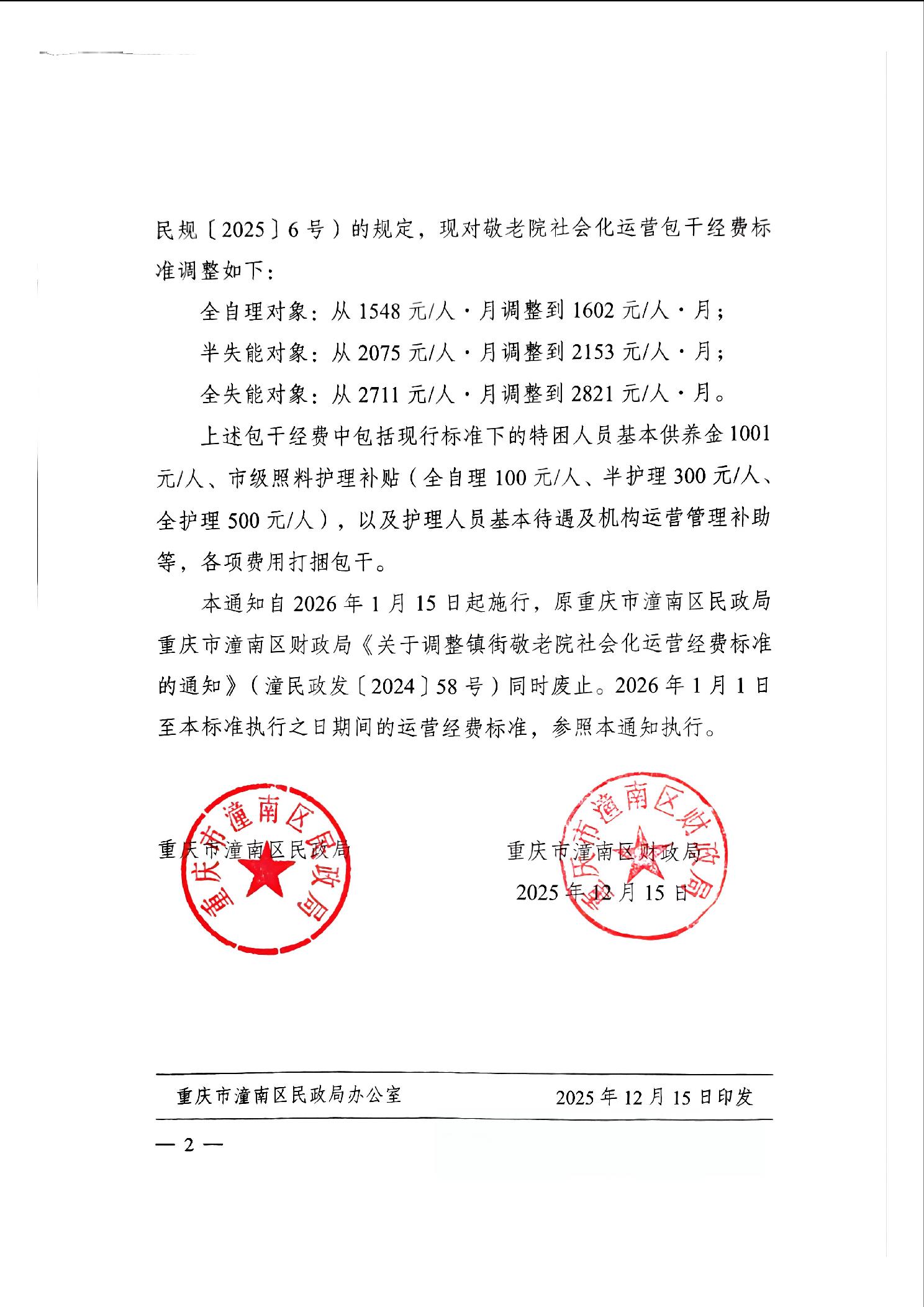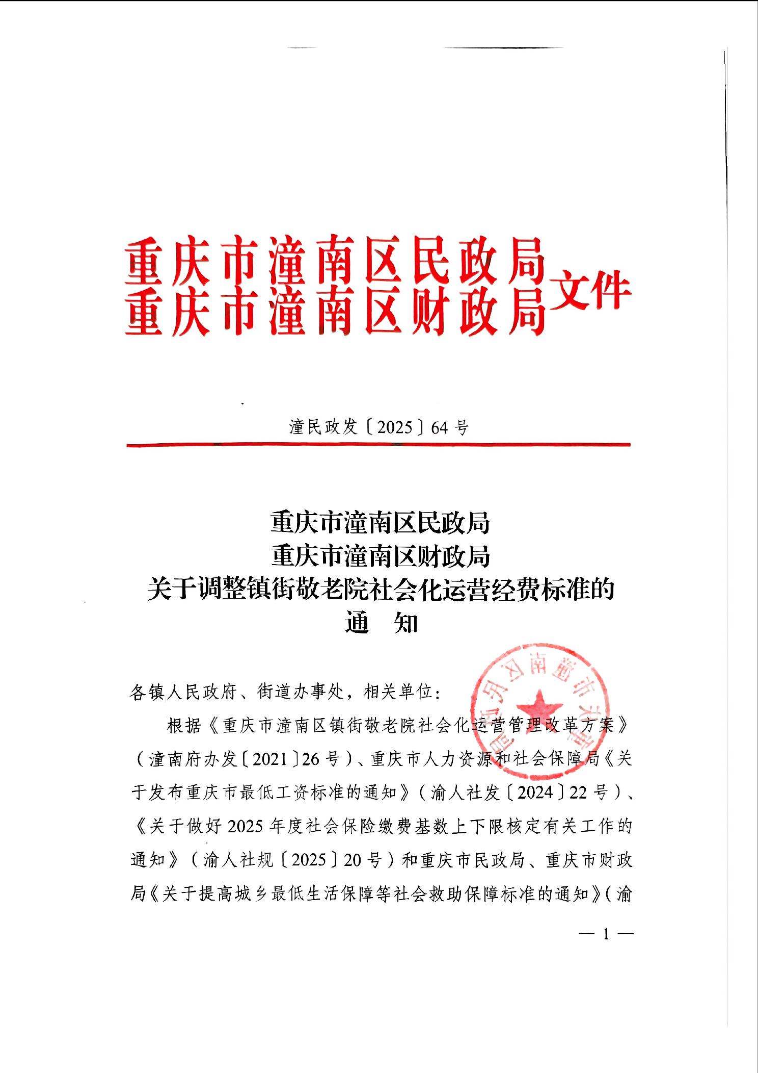重庆市潼南区民政局 重庆市潼南区财政局关于调整镇街敬老院社会化运营经费标准的通知