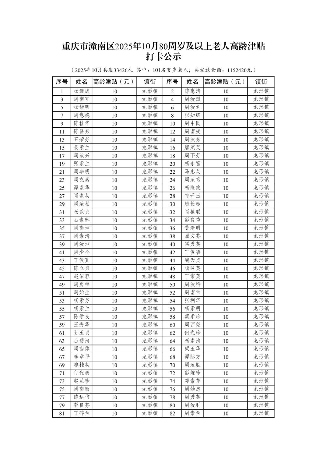 重庆市潼南区2025年10月80周岁及以上老人高龄津贴打卡公示