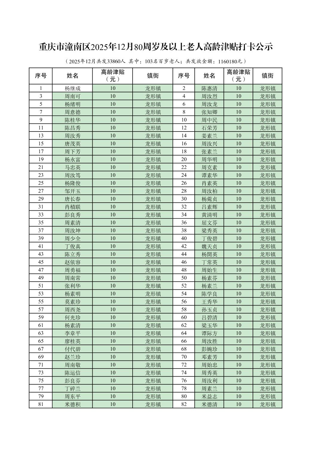 重庆市潼南区2025年12月80周岁及以上老人高龄津贴打卡公示