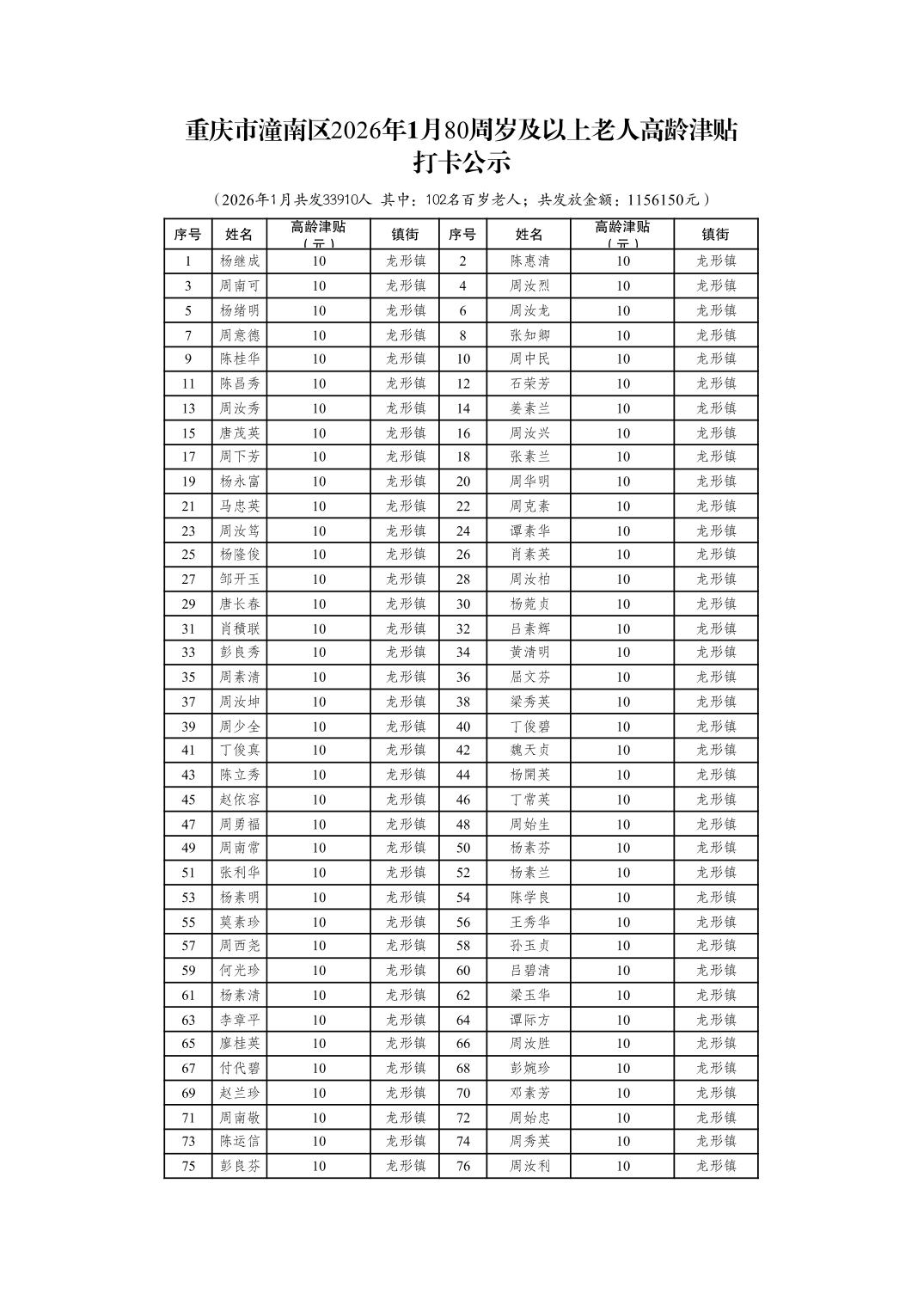 重庆市潼南区2026年1月80周岁及以上老人高龄津贴打卡公示