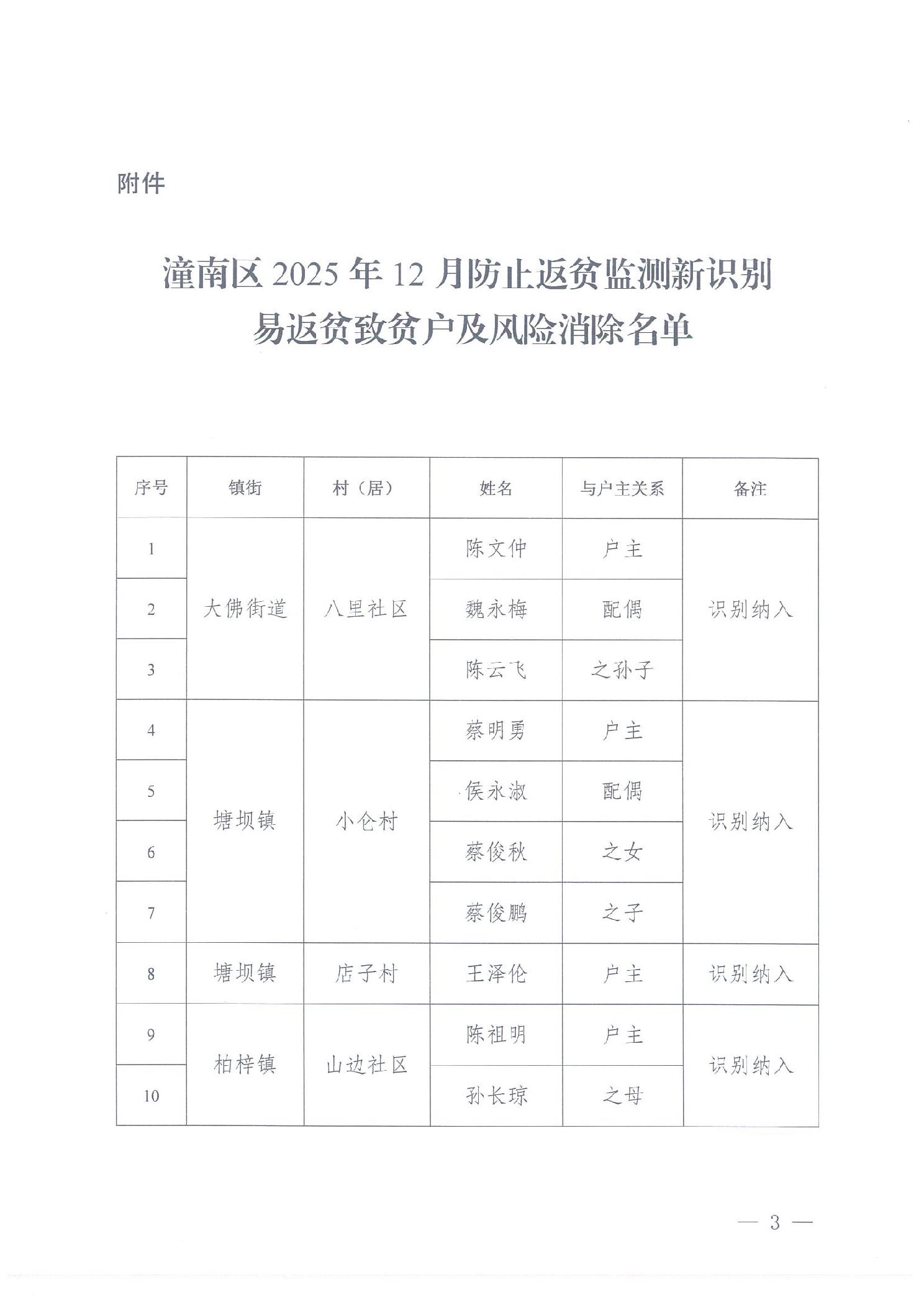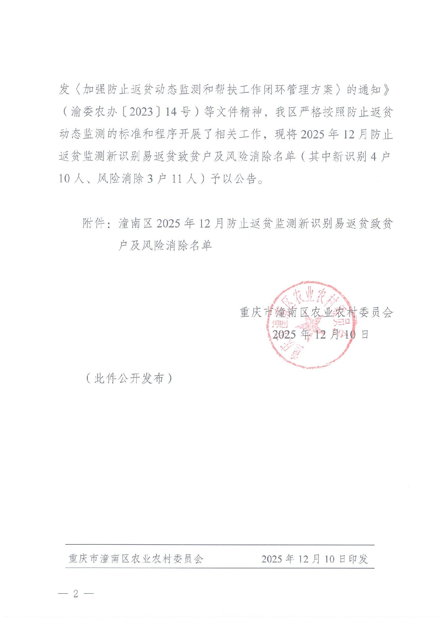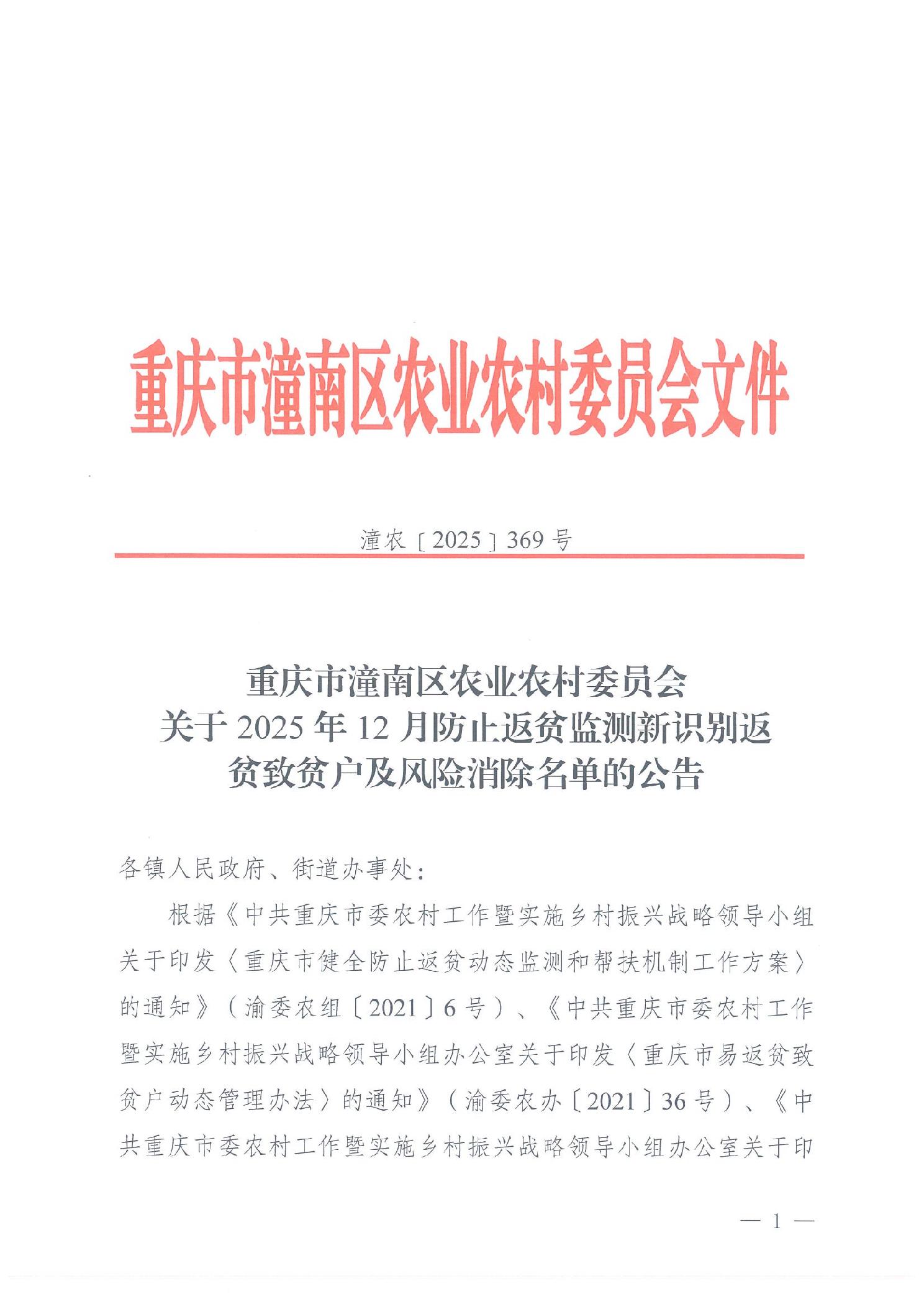 潼农〔2025〕369号 关于2025年12月防止返贫监测新识别返贫致贫户及风险消除名单的公告