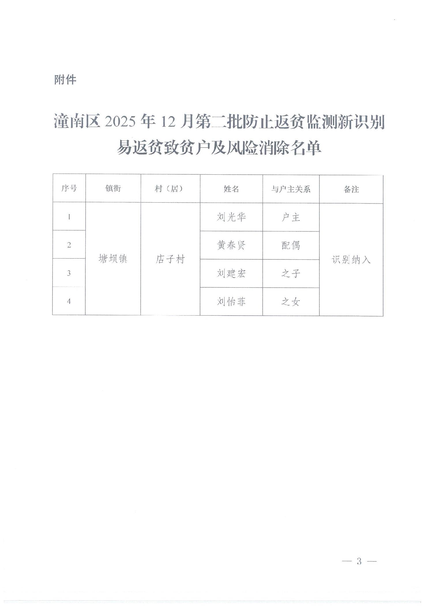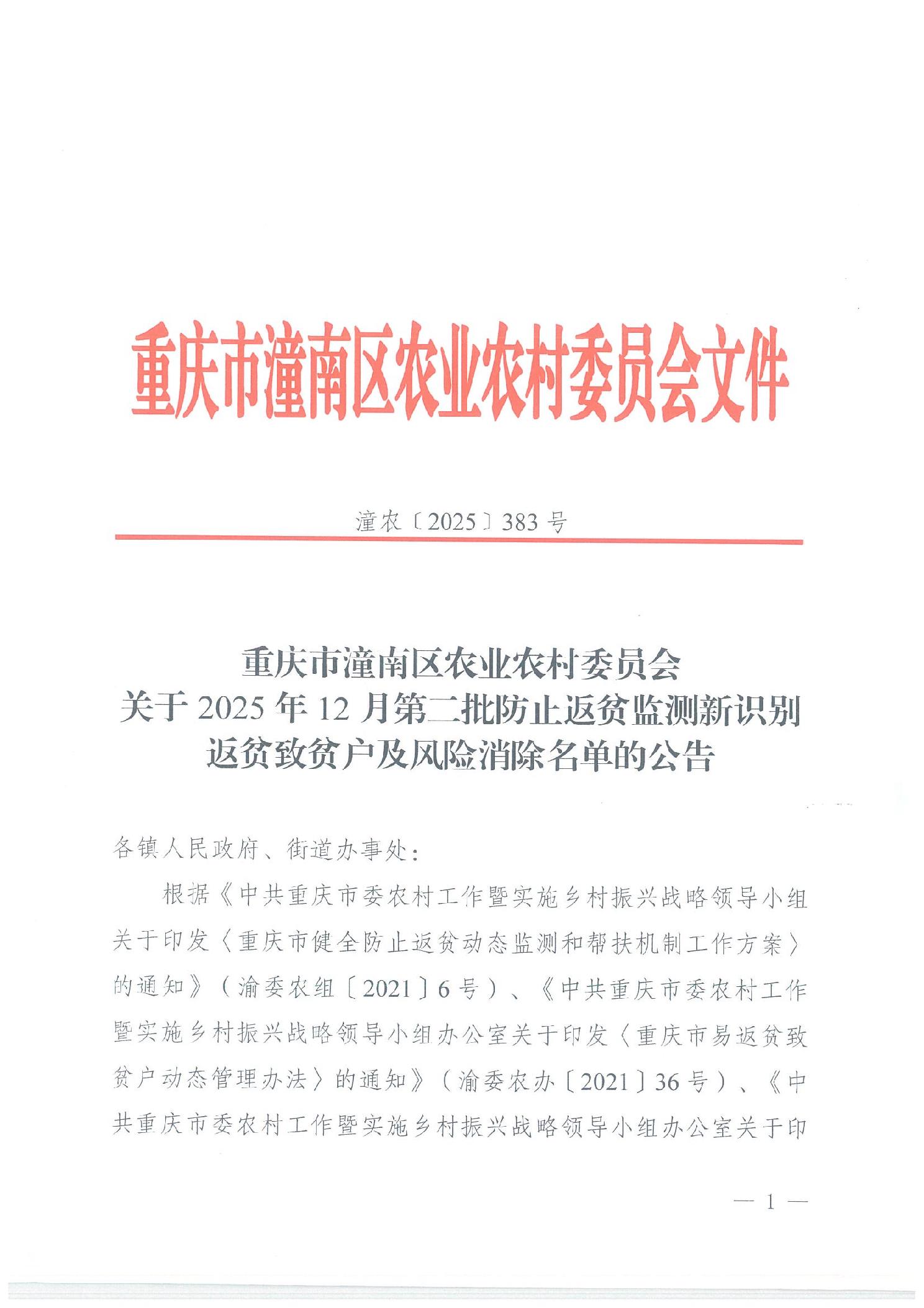 潼农〔2025〕383号 关于2025年12月第二批防止返贫监测新识别返贫致贫户及风险消除名单的公告