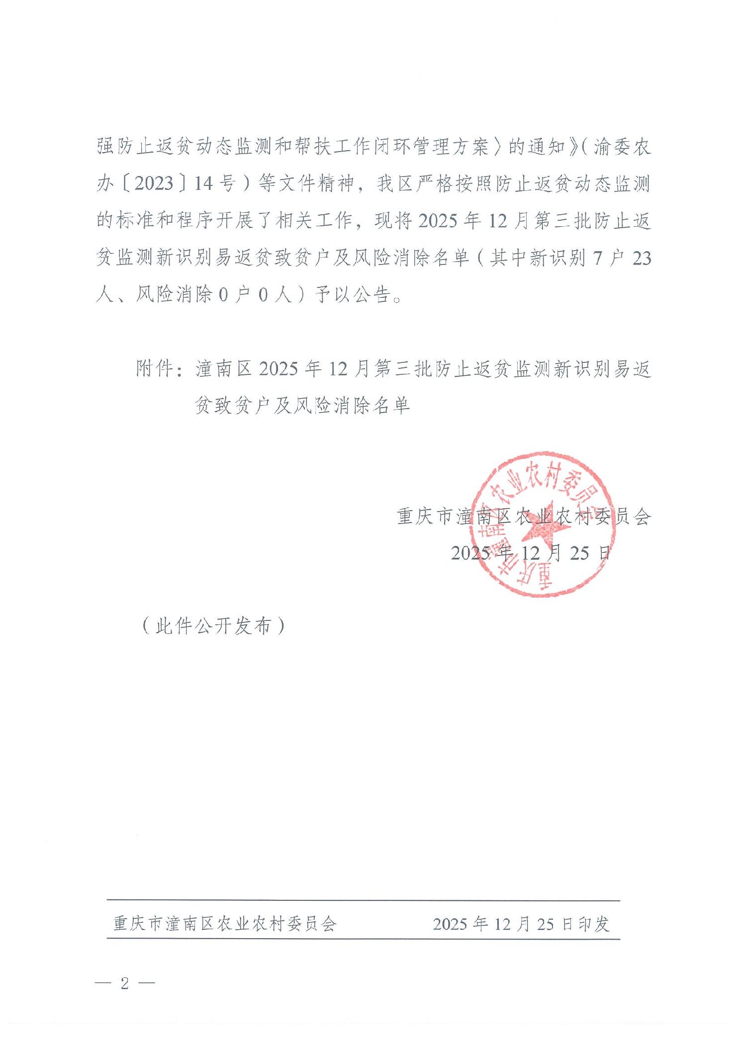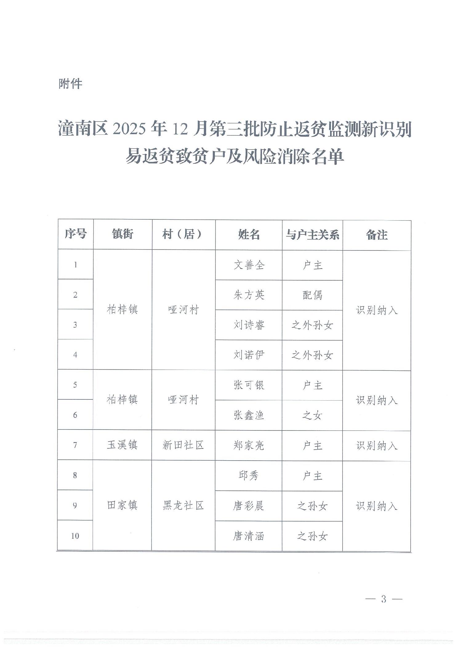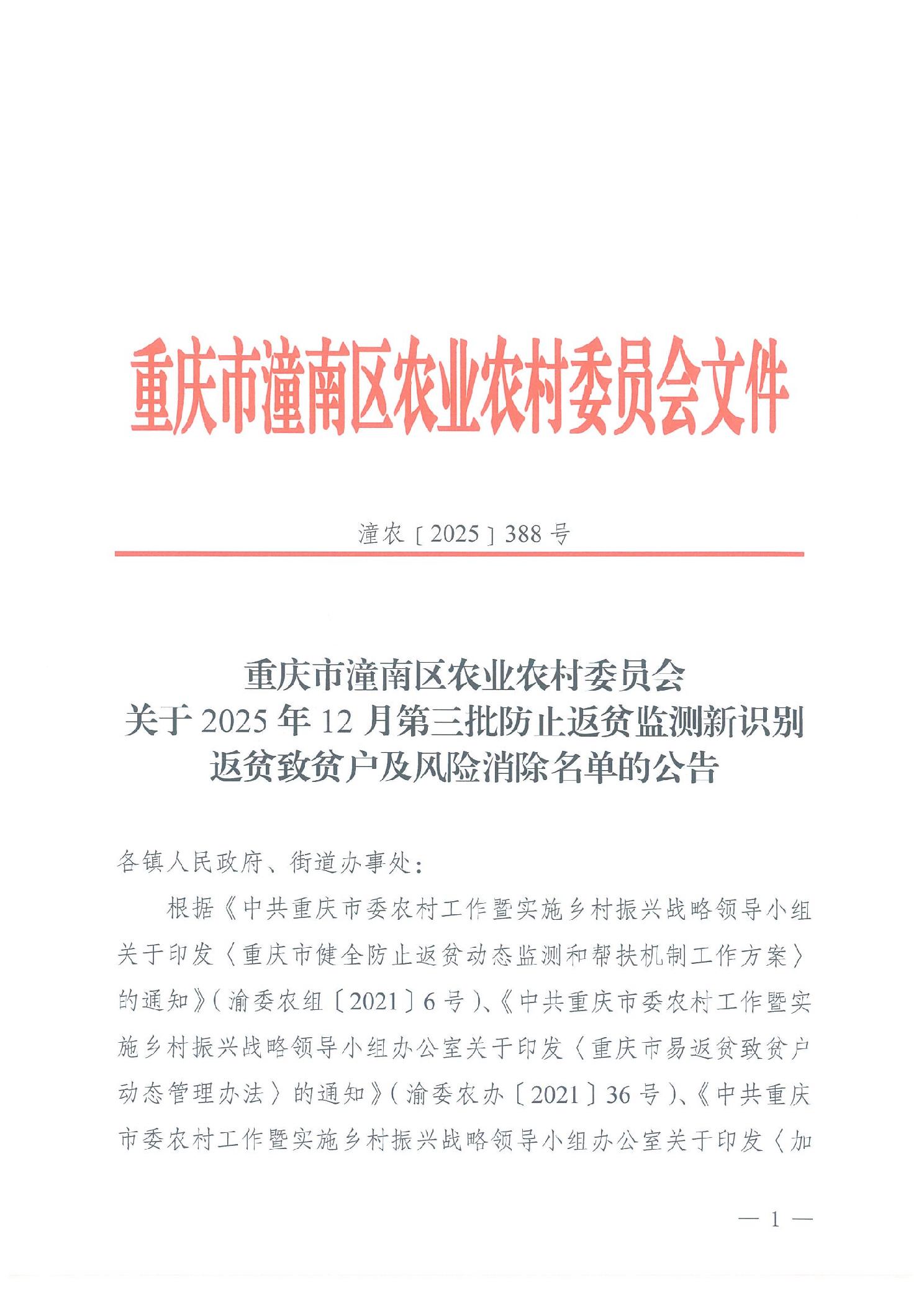 潼农〔2025〕388号 关于2025年12月第三批防止返贫监测新识别返贫致贫户及风险消除名单的公告
